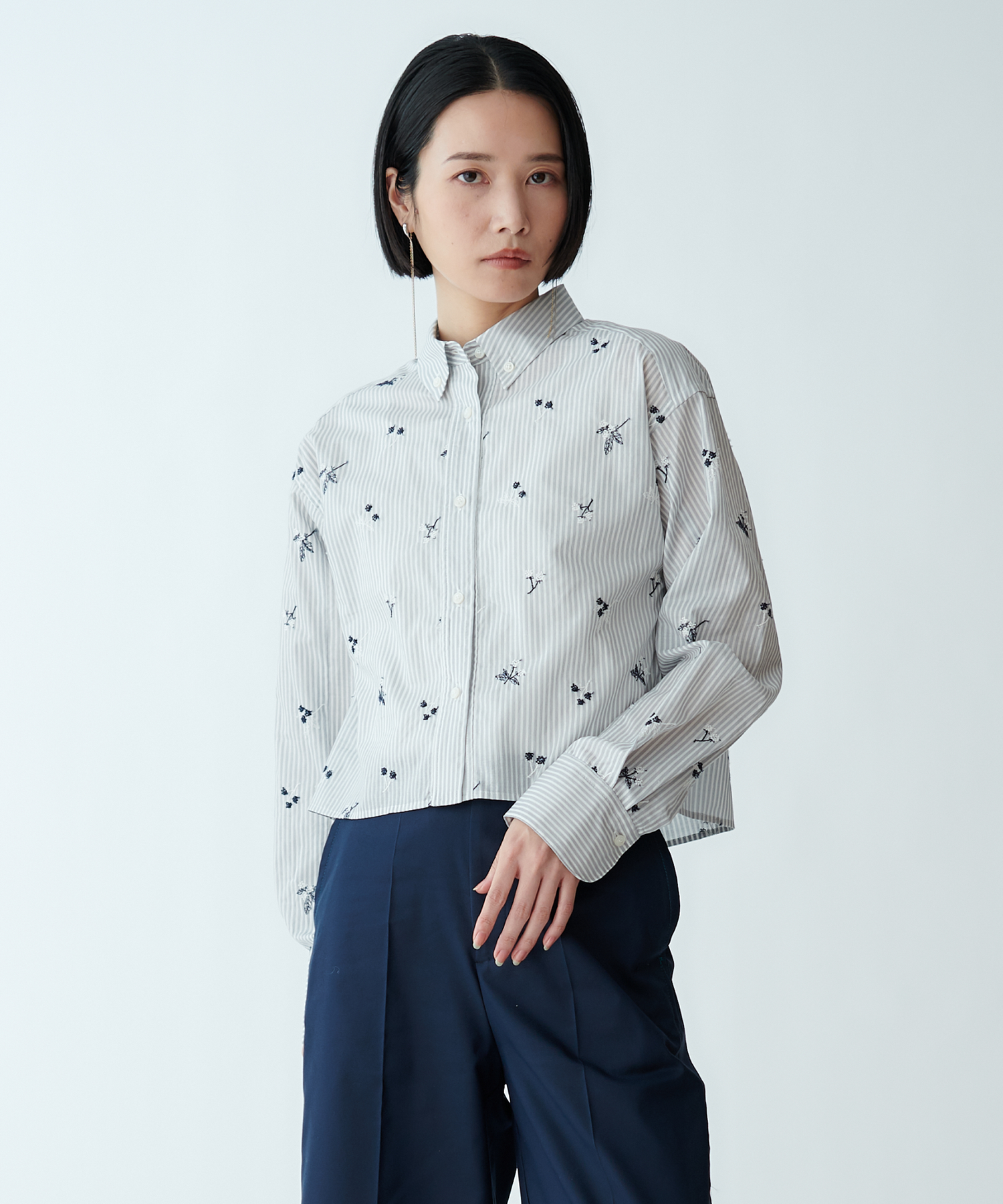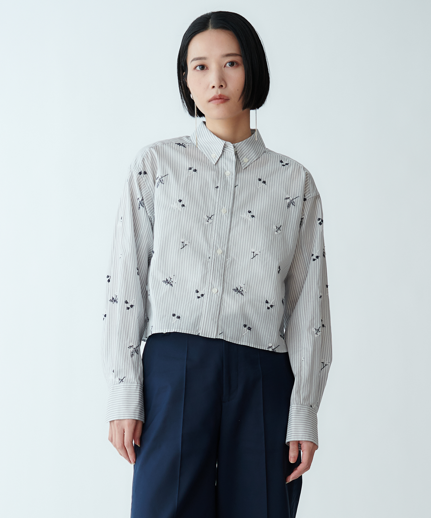 ボリュームのあるボトムスと相性抜群なクロップド丈のシャツ。