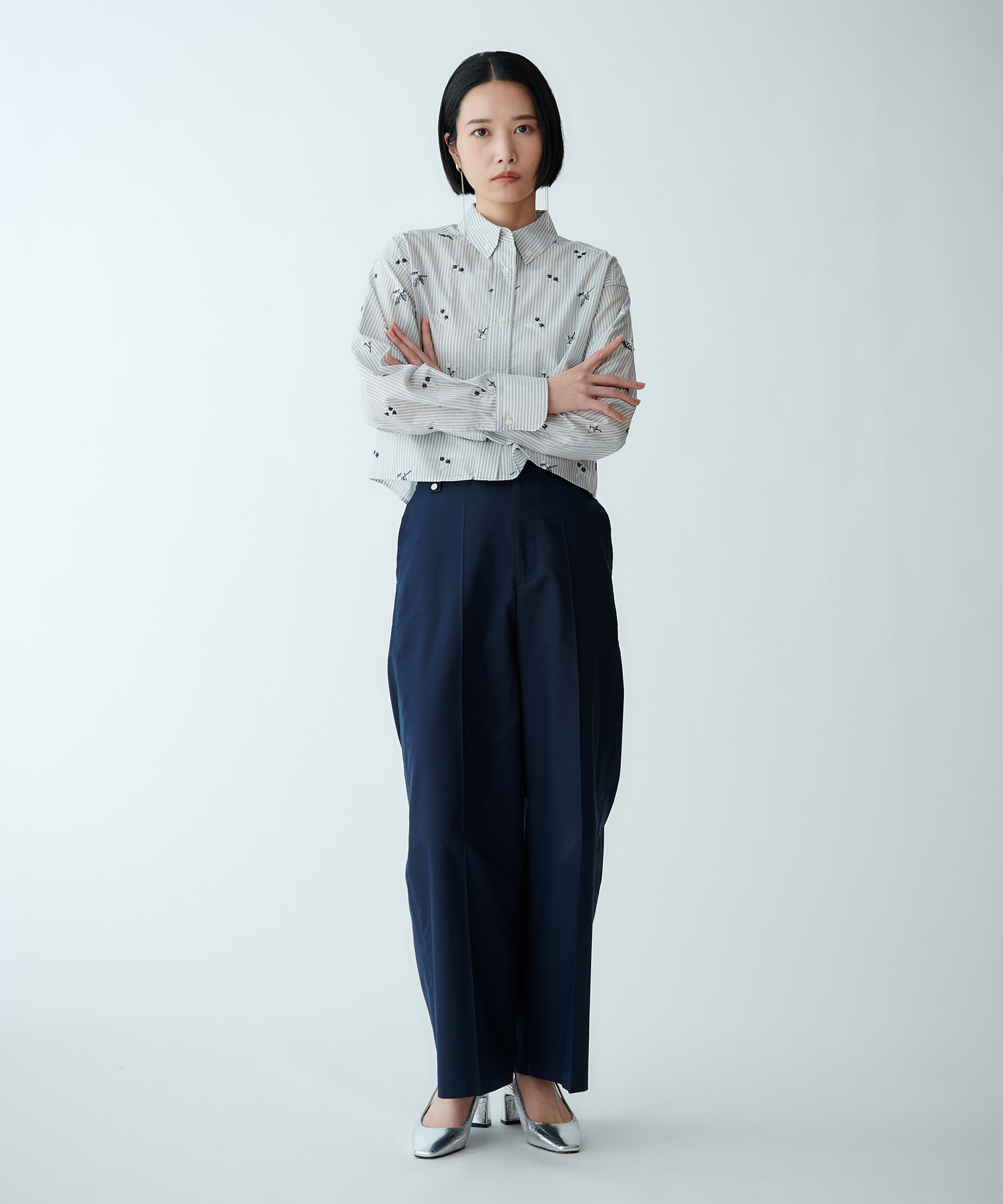 クロップド丈のシャツが腰位置を高く見せ、ワイドシルエットのパンツとも好相性。
