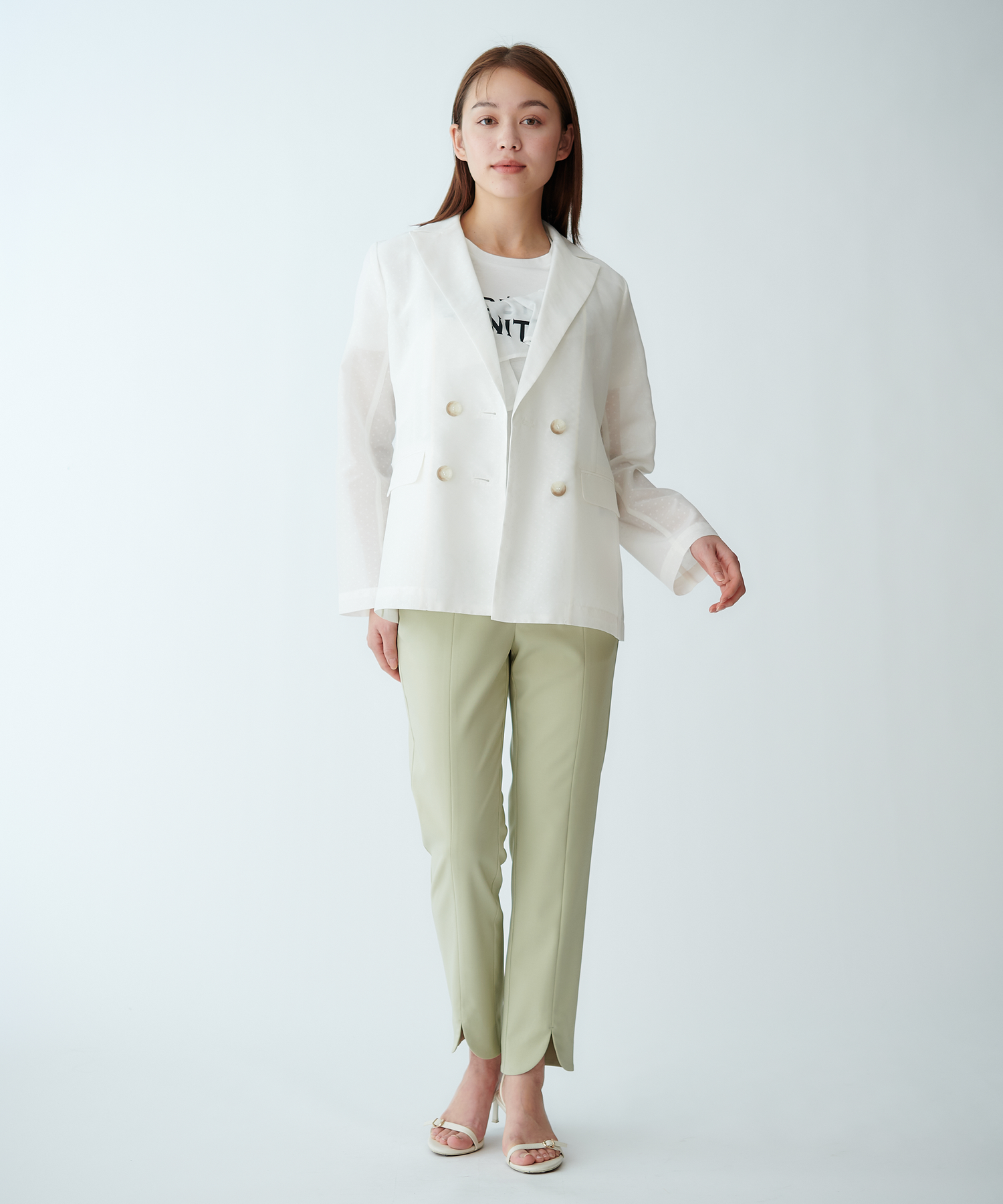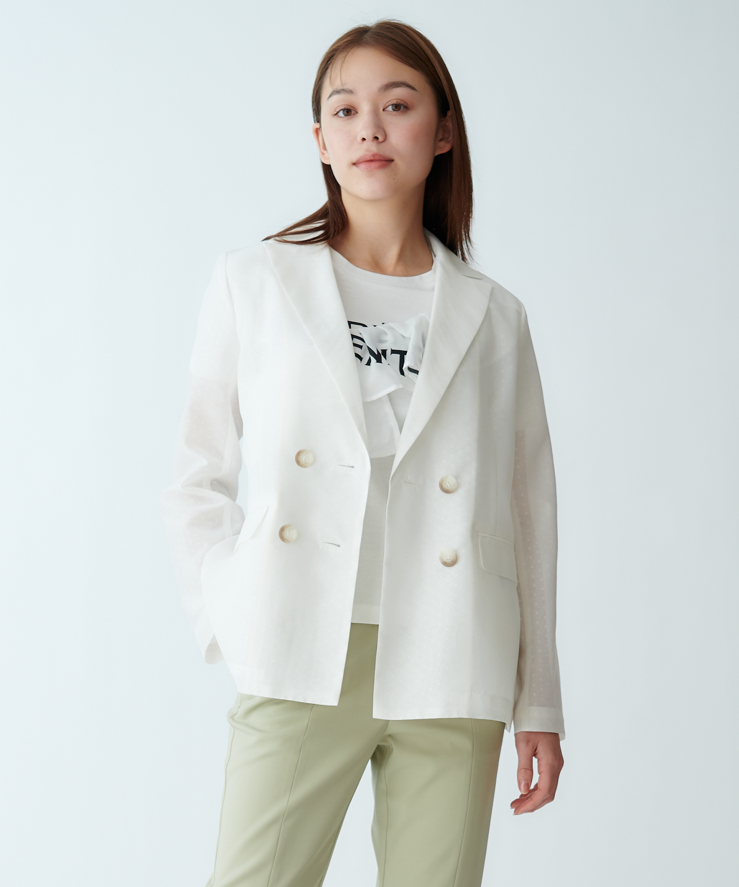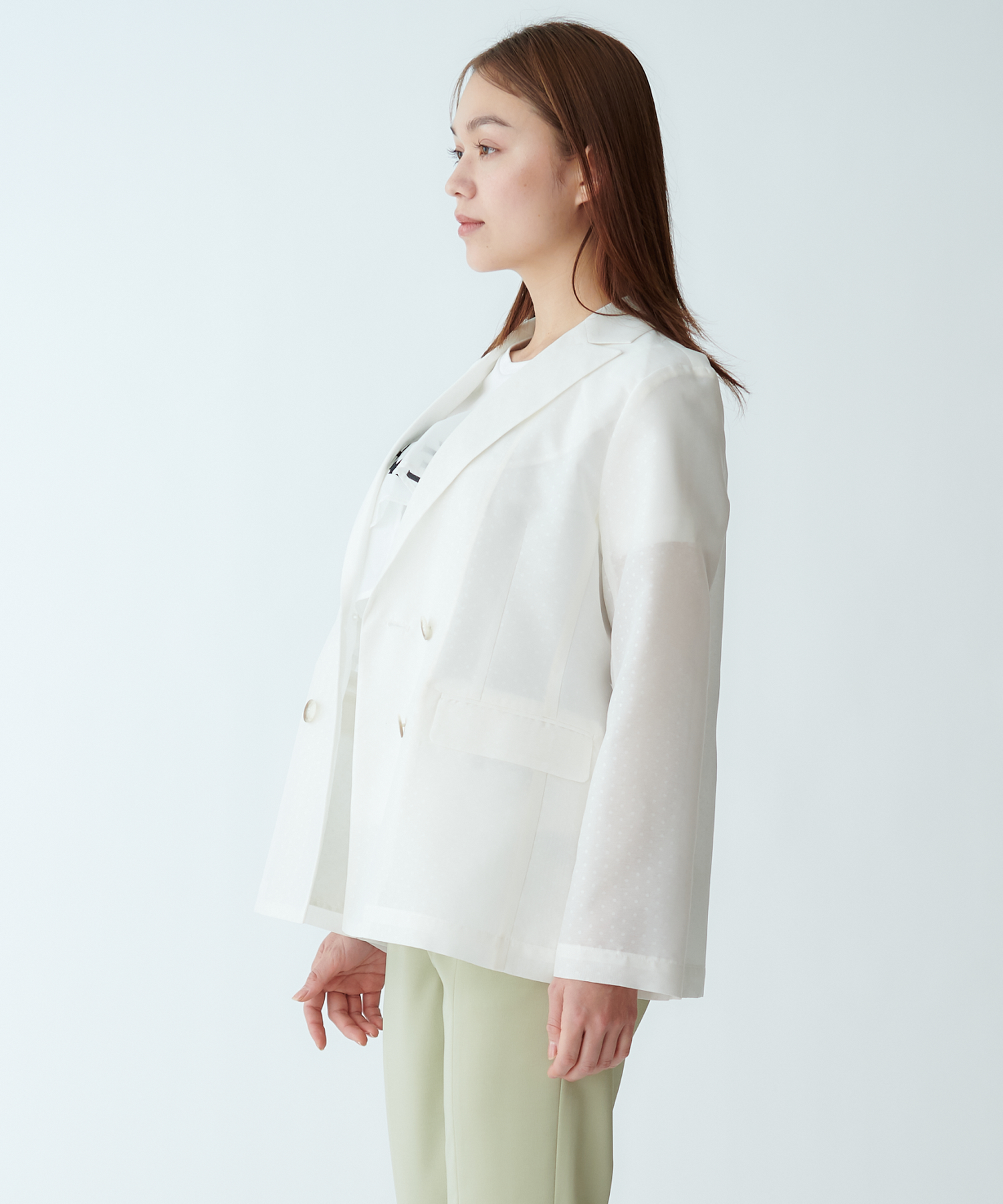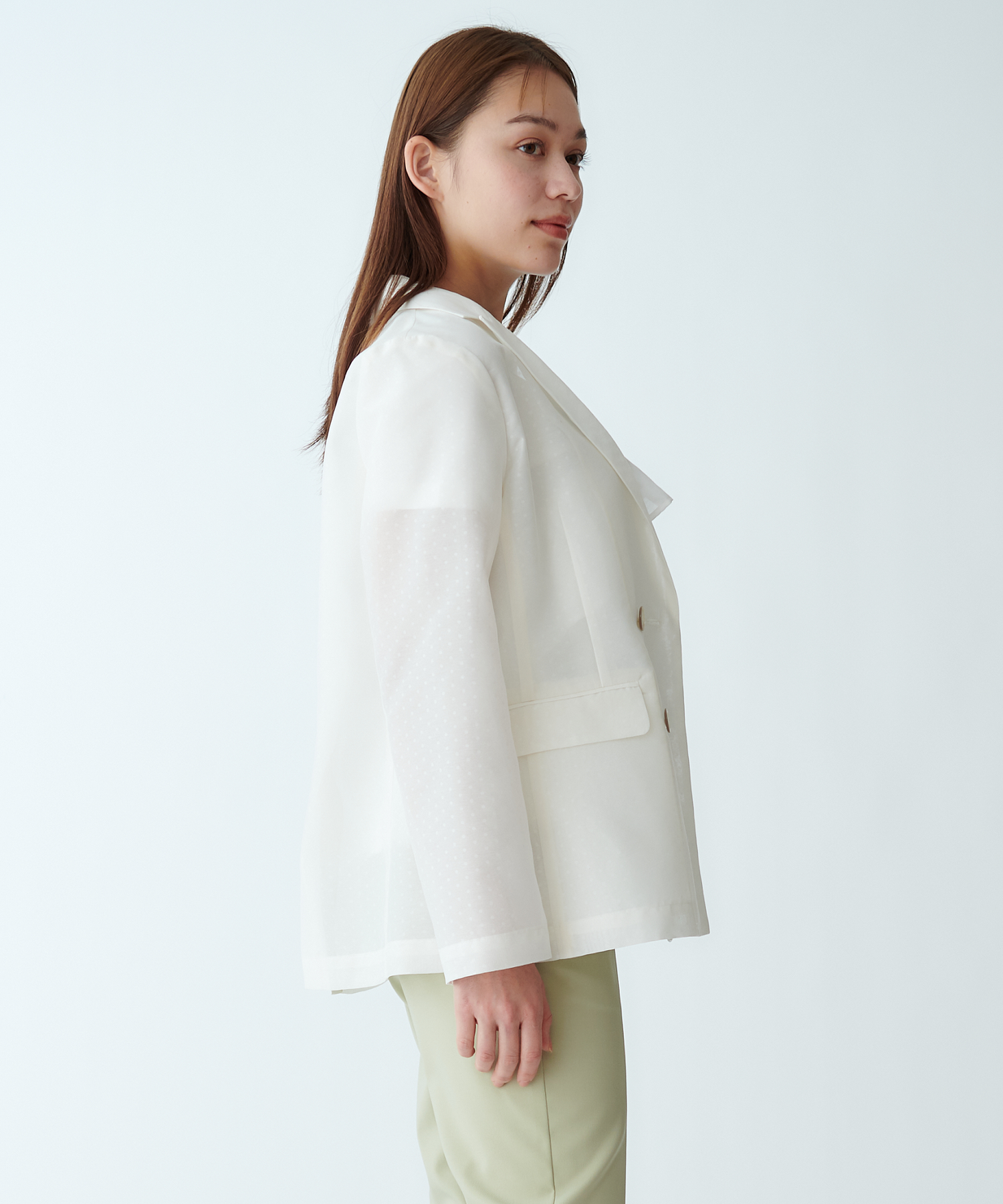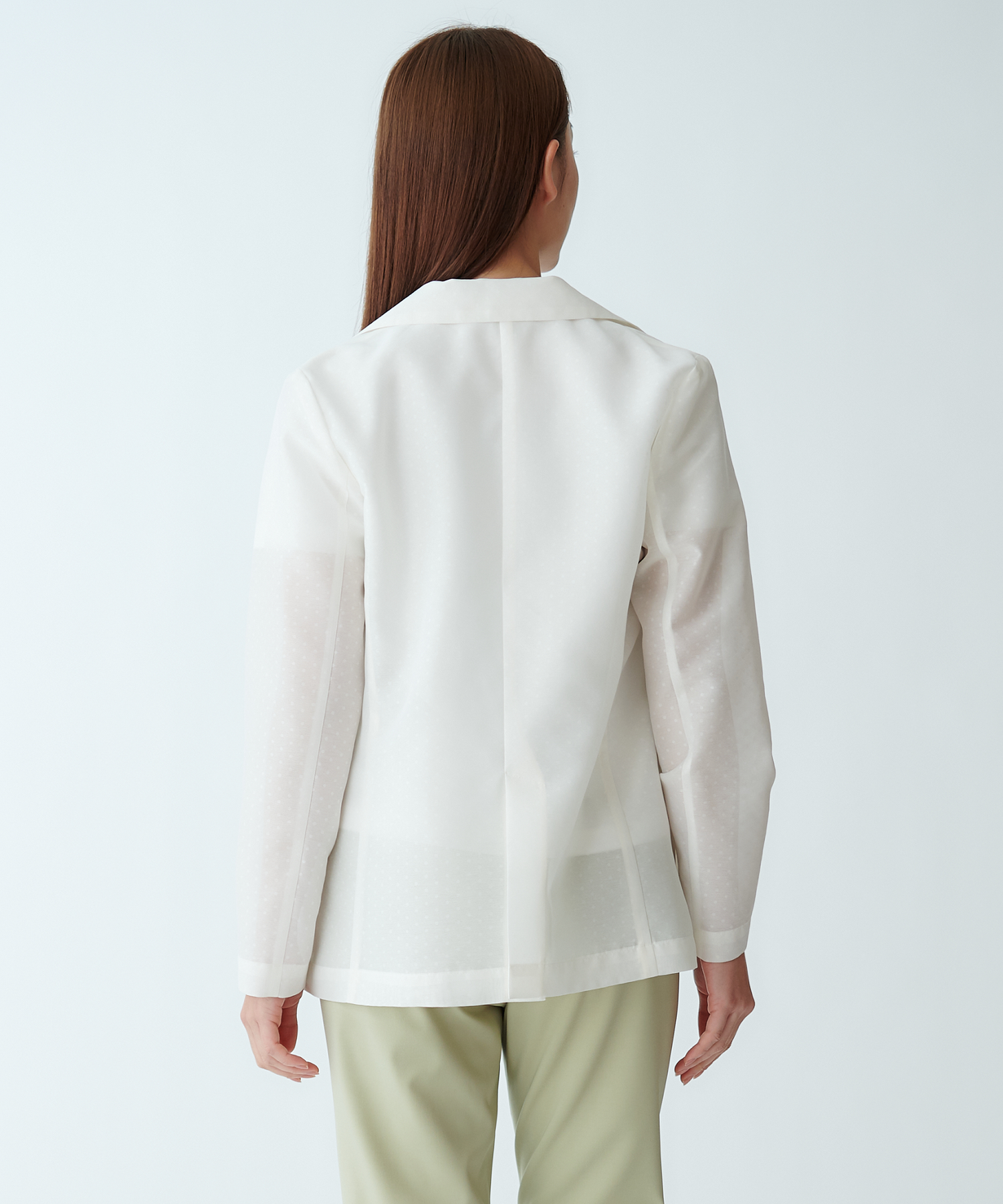 適度な透け感と抑えめな光沢が、上品な印象のテーラードジャケット。