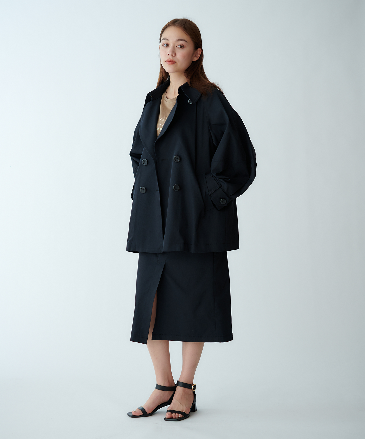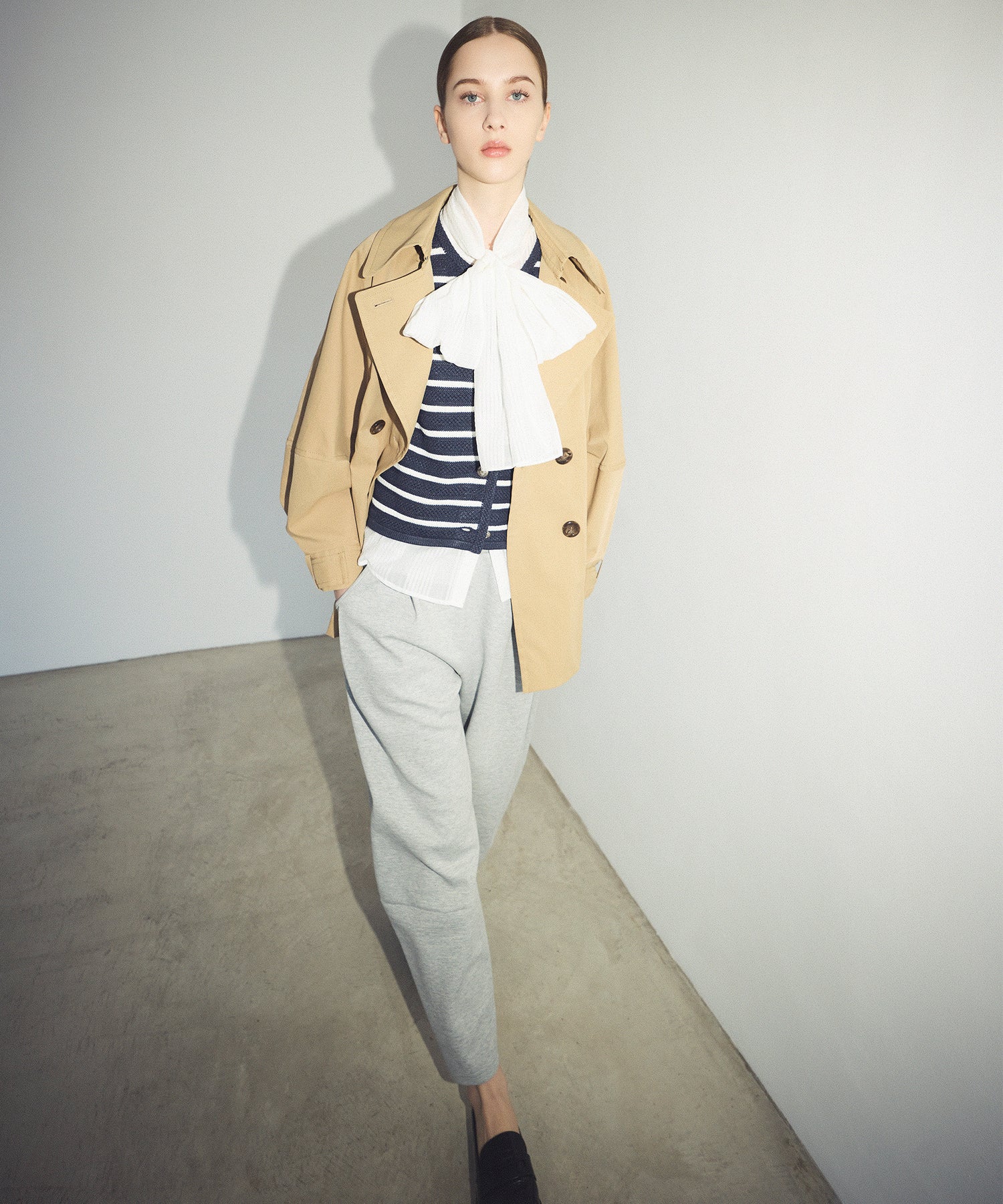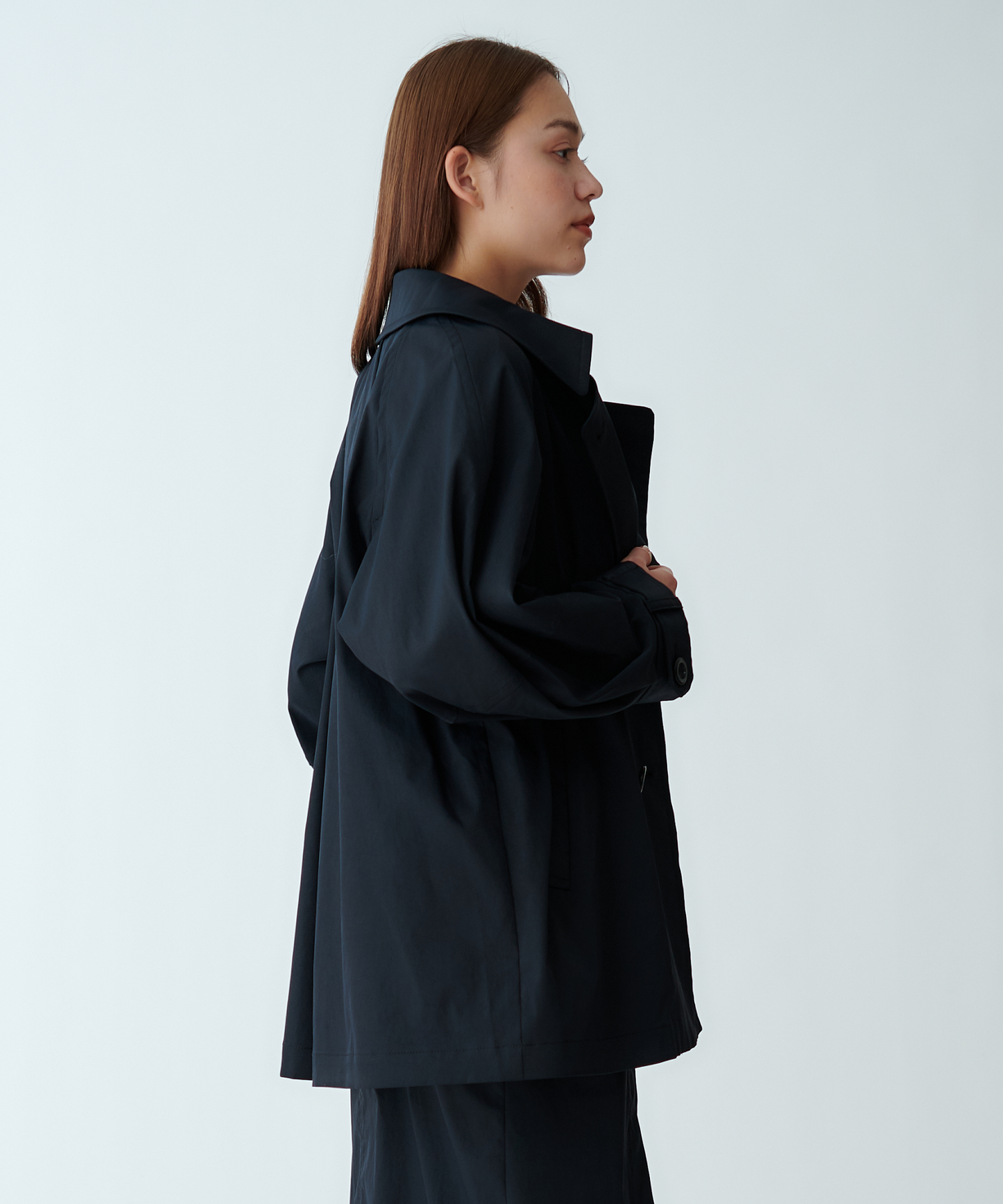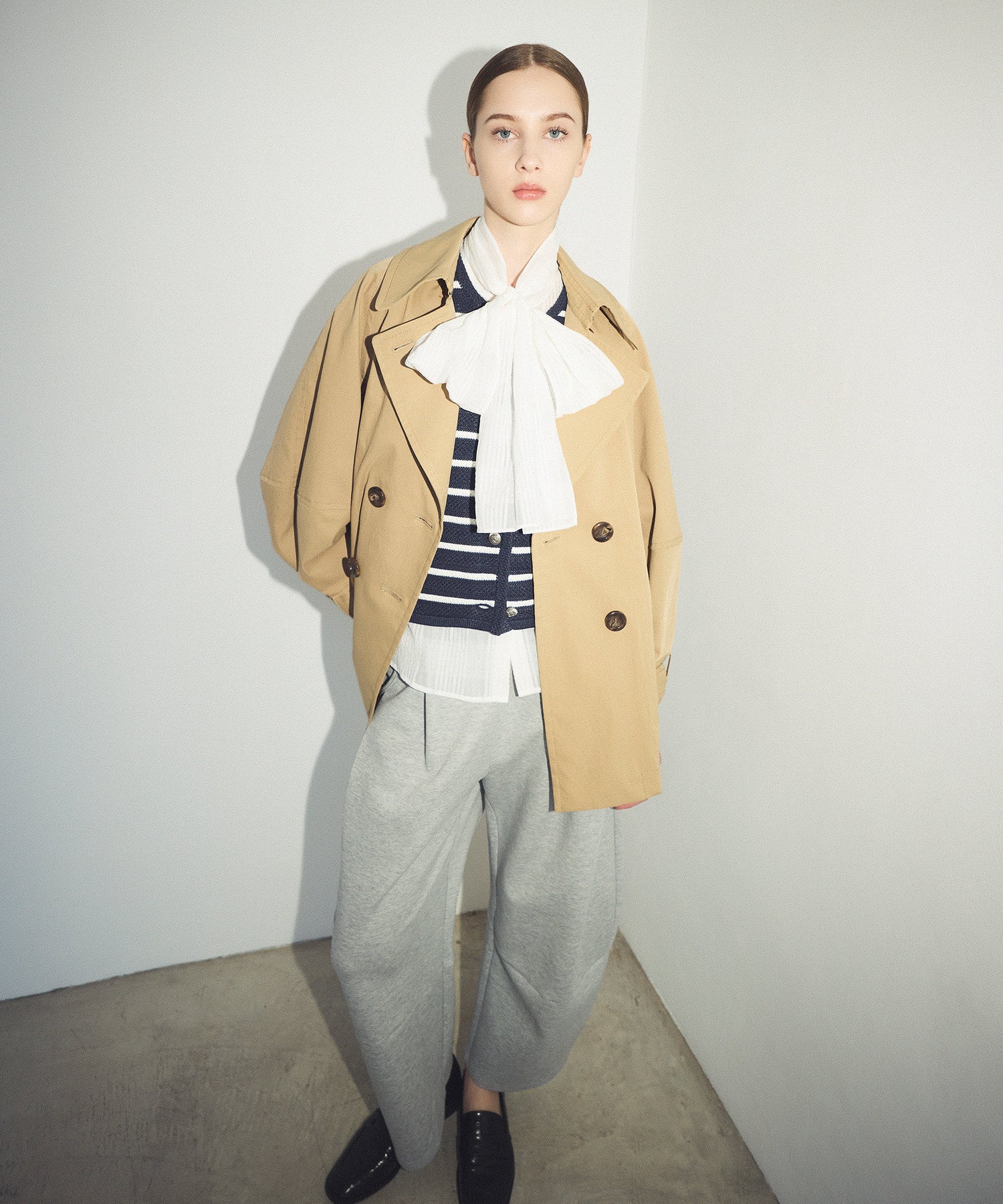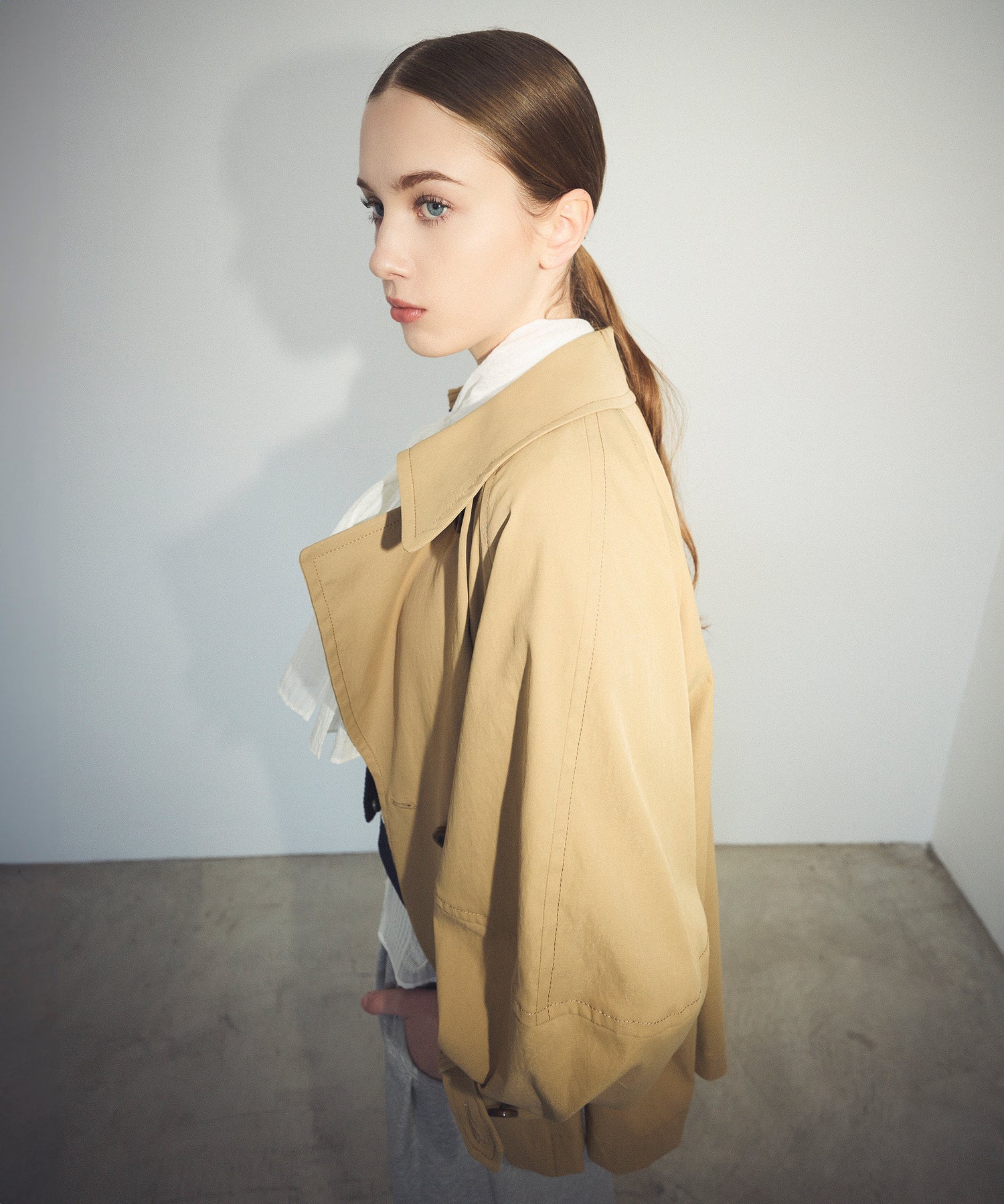 トレンチコートのディテールをベースに、袖にタックを入れてボリュームを持たせた一枚。