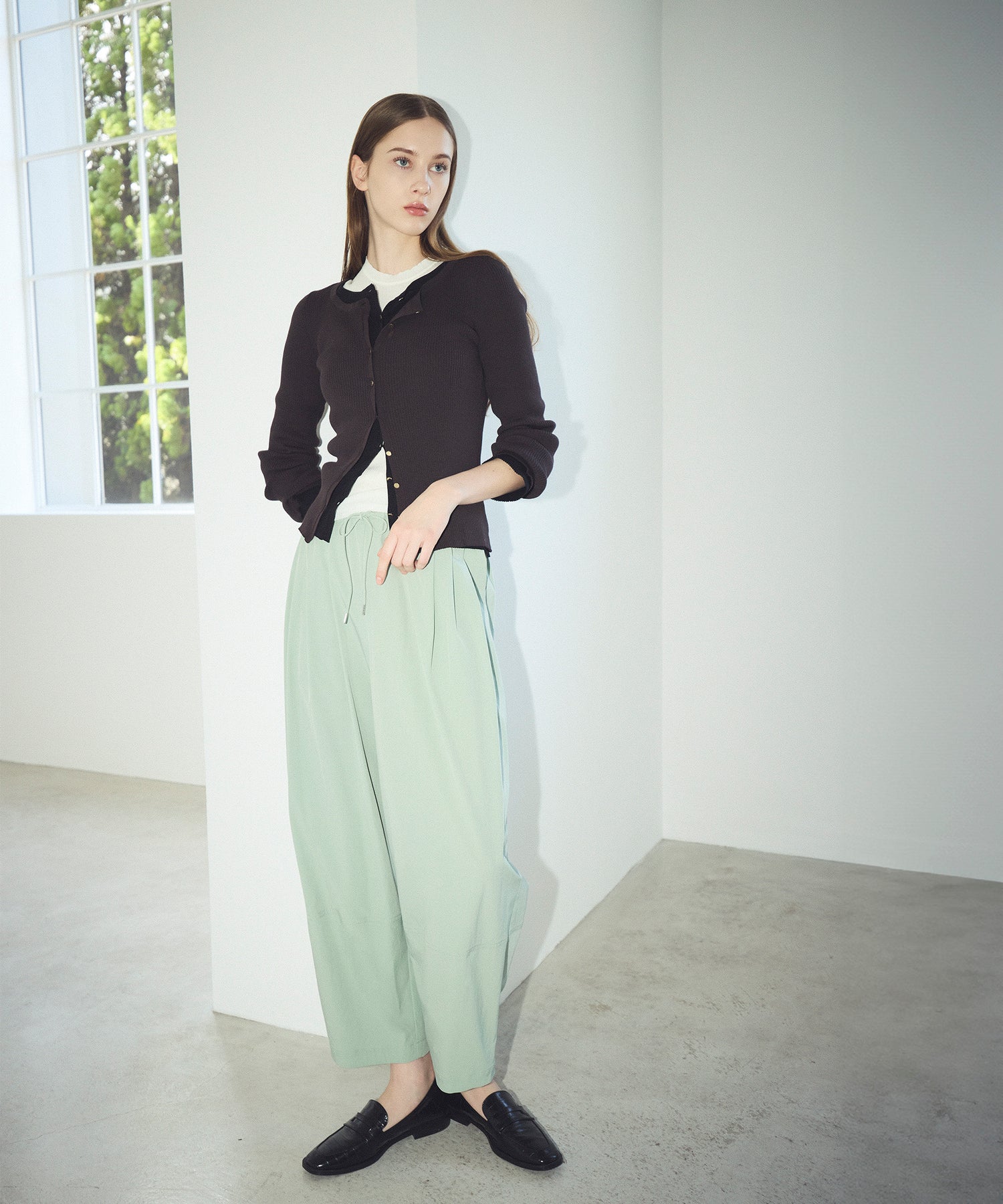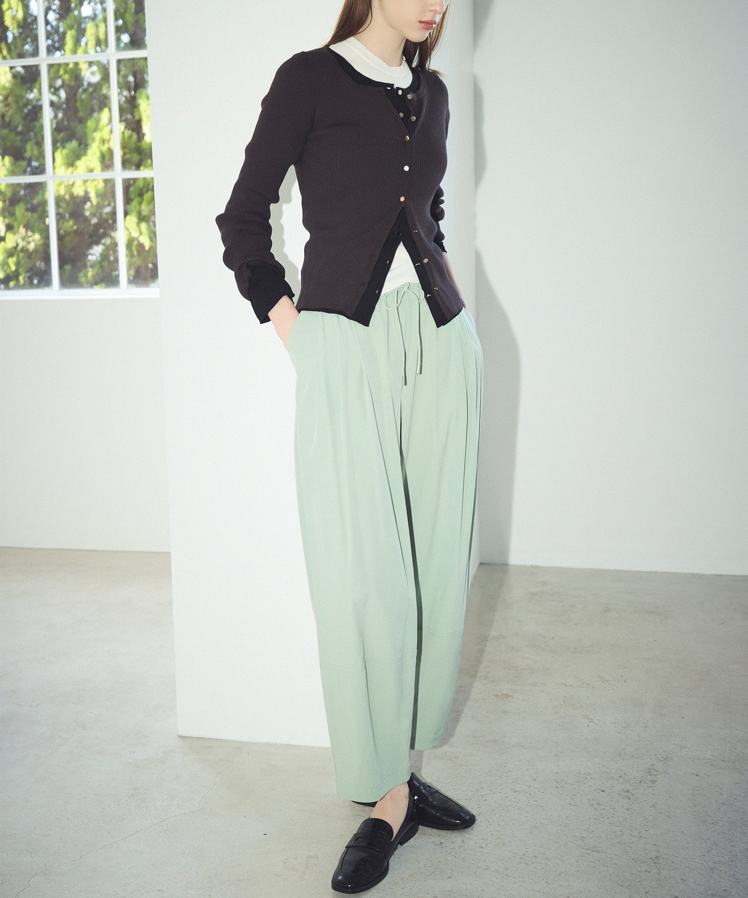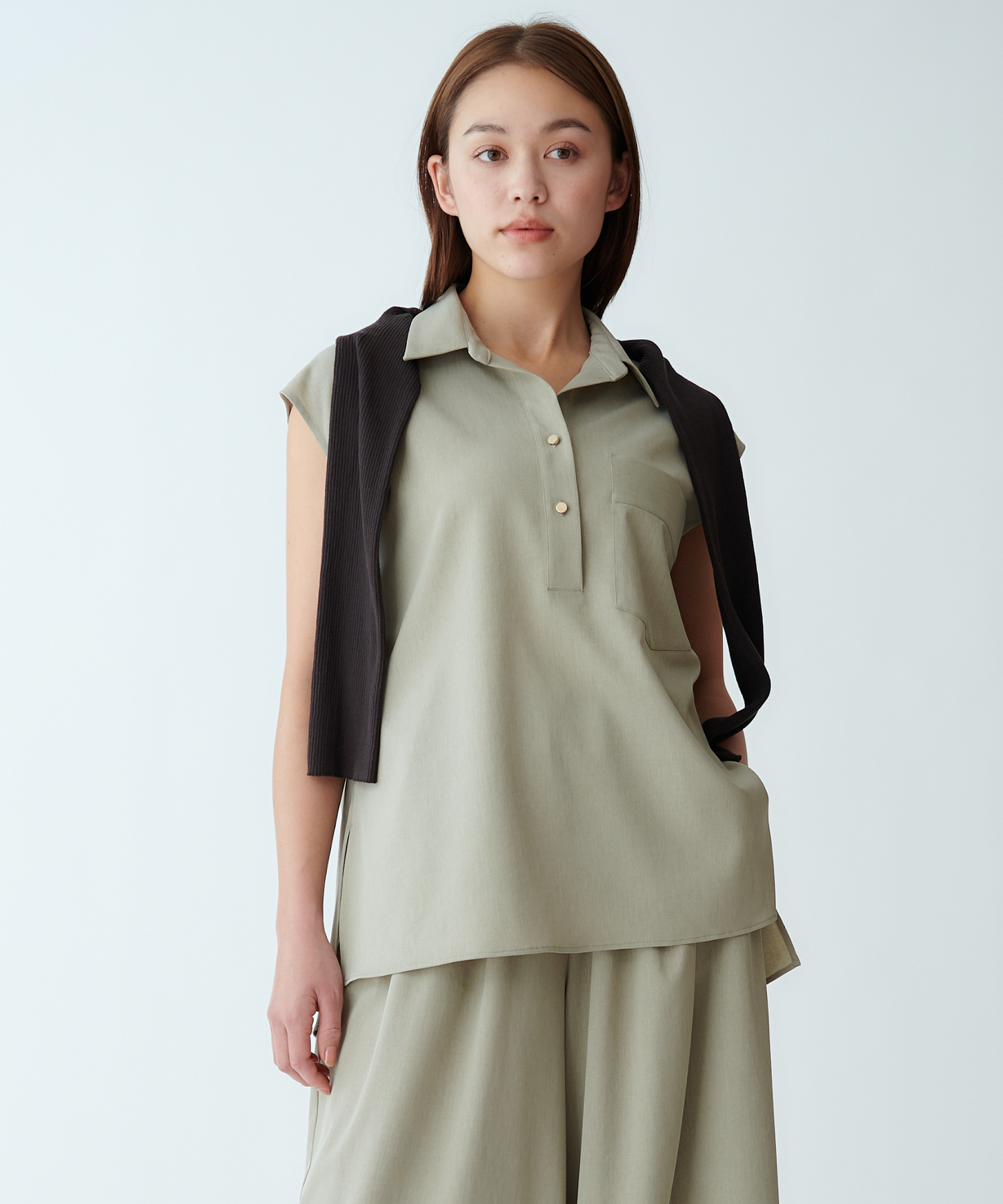 イン・アウトどちらでもバランスの良いシルエットなので幅広いボトムスとの着こなしを楽しんでいただけます。
