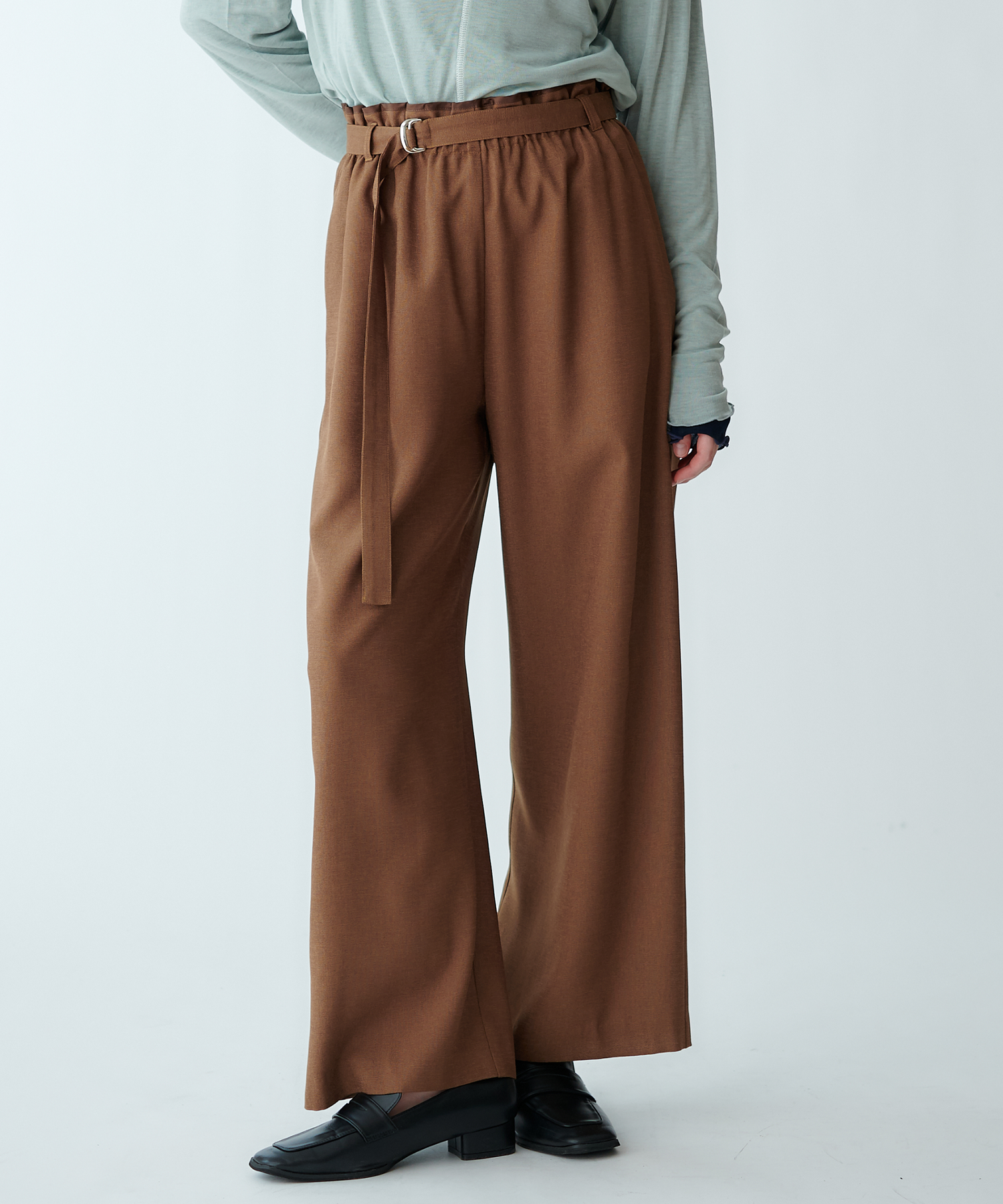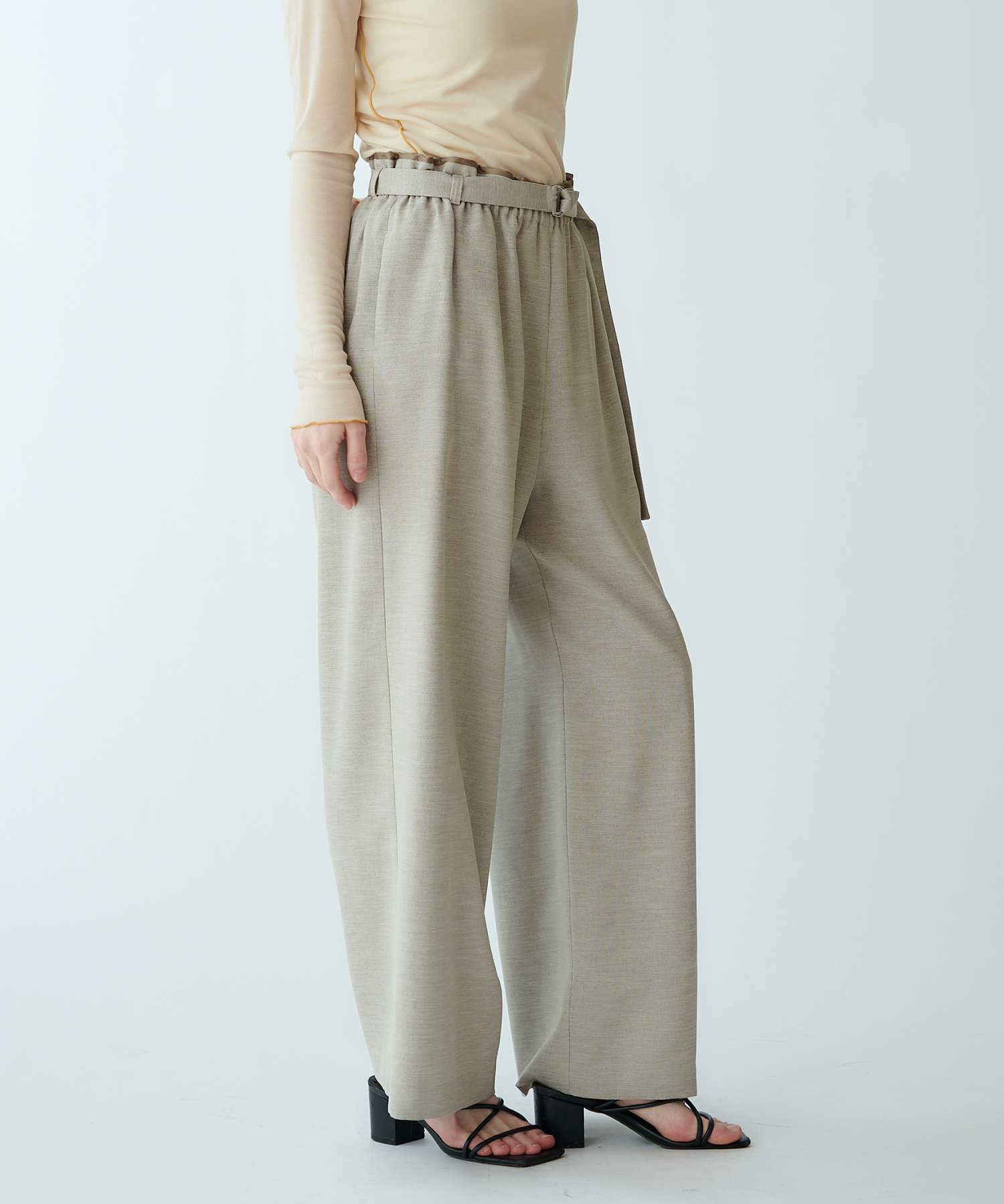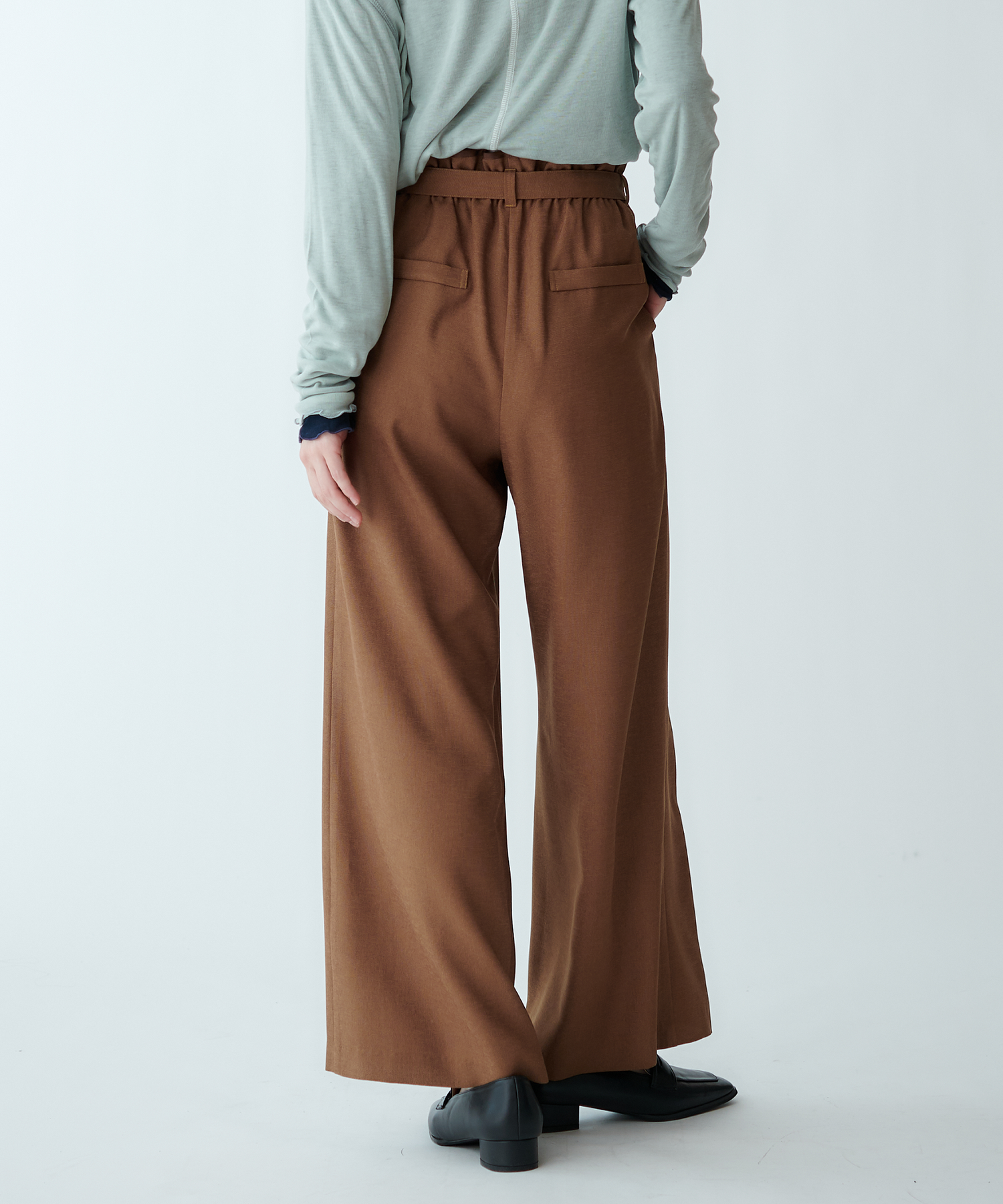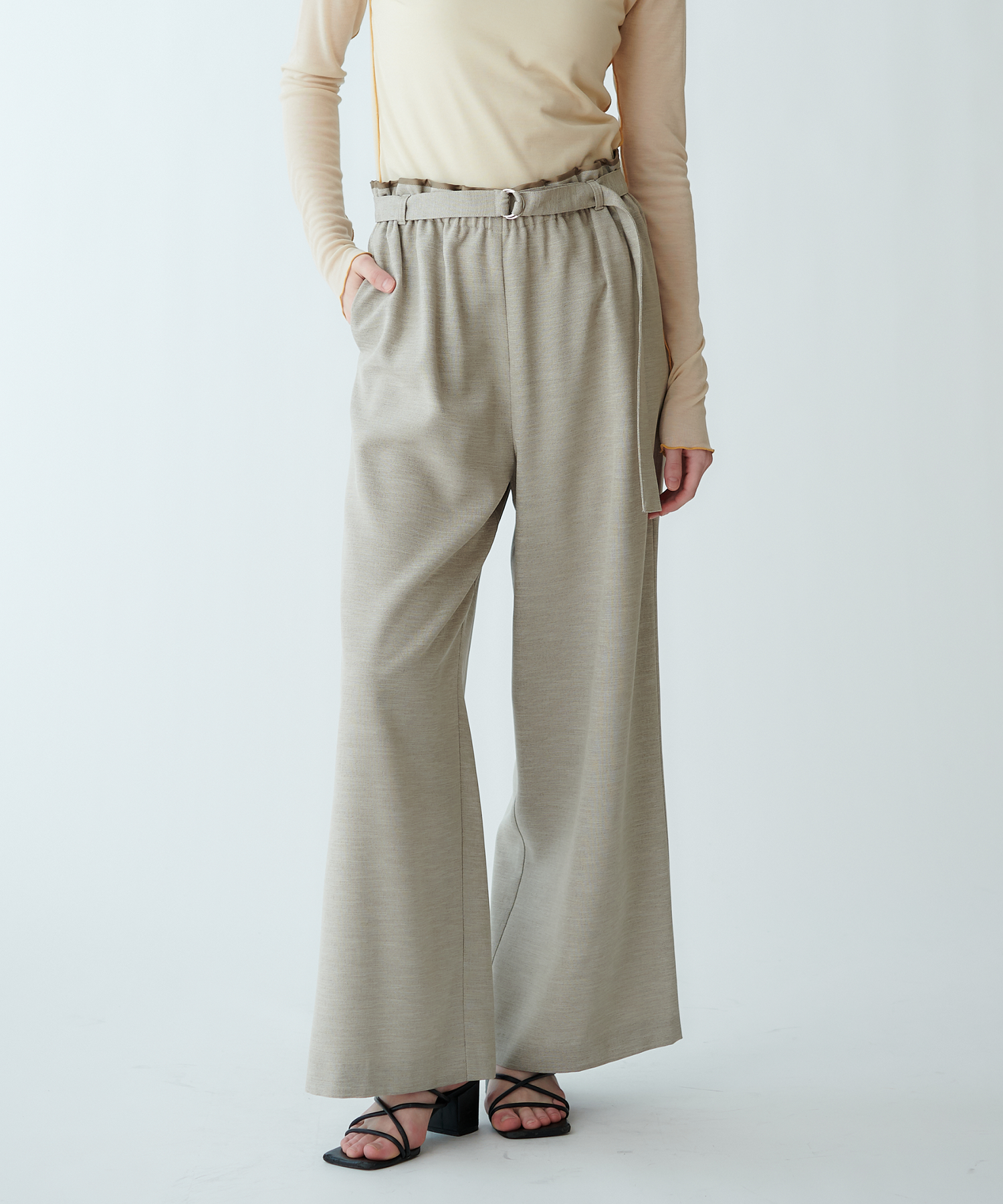 ウエストに同色系の別布パイピングをあしらった、ストレートシルエットパンツ。