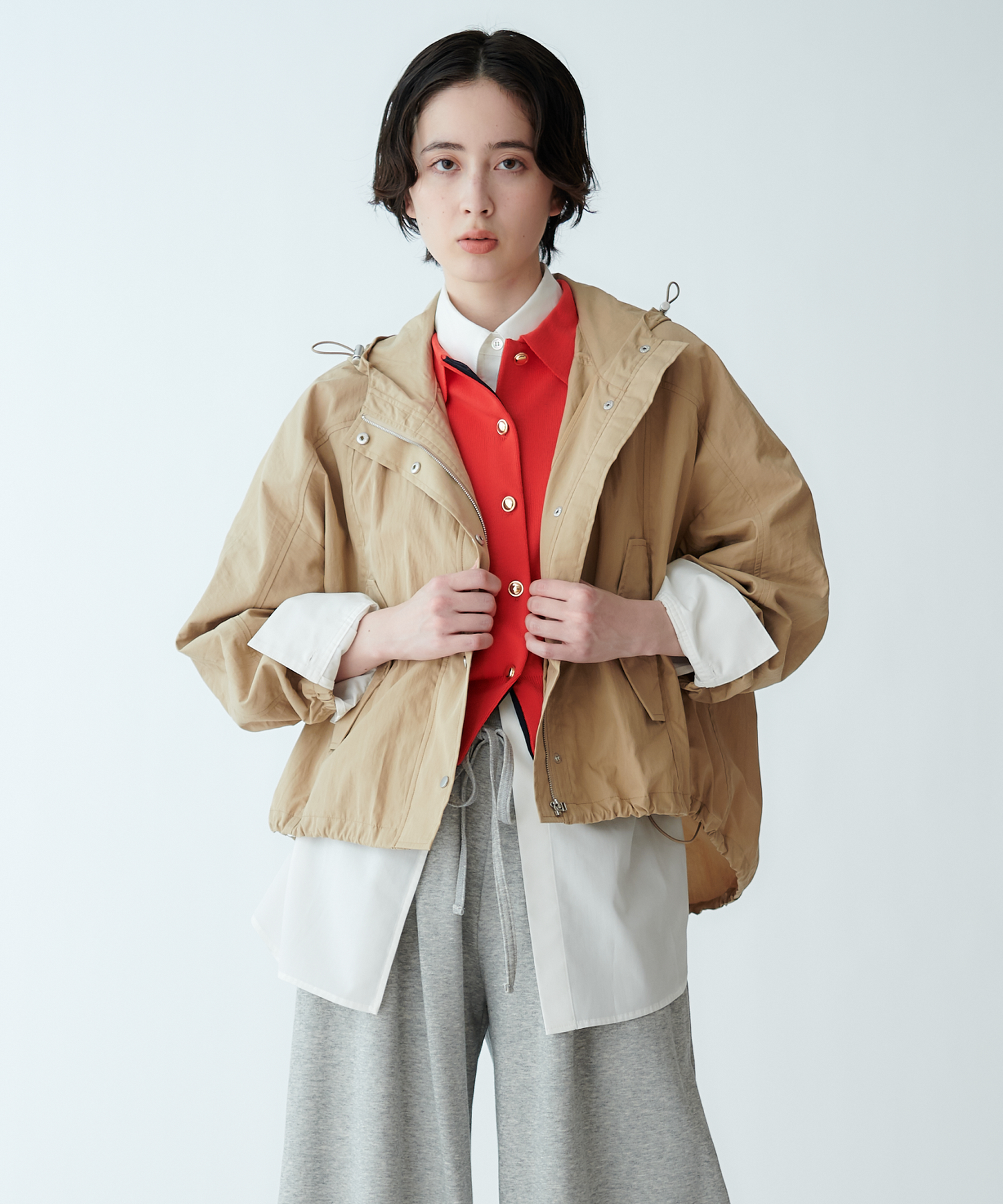 切り替えデザインがアクセントになり、裾のコードで裾幅の調整が可能です。