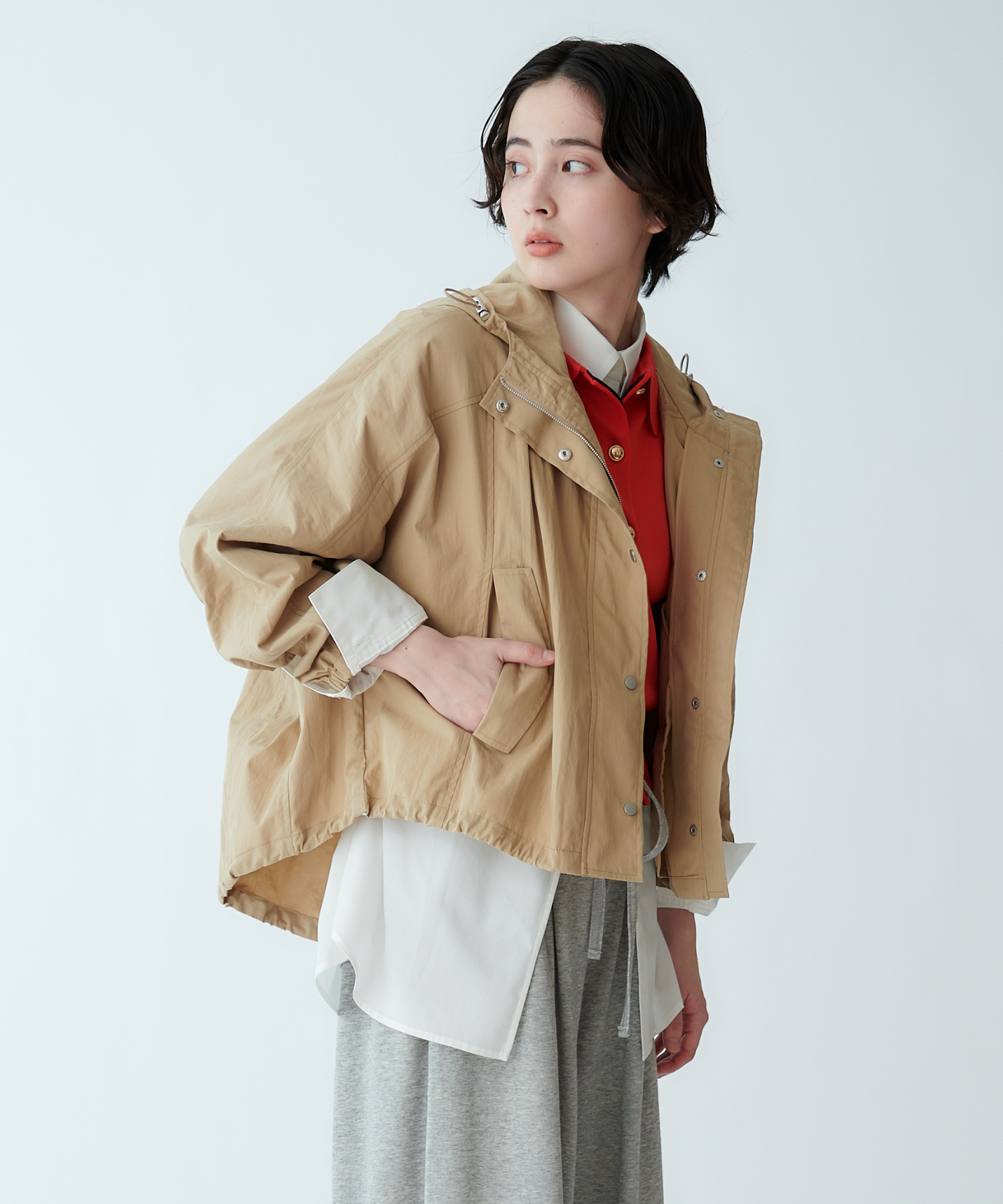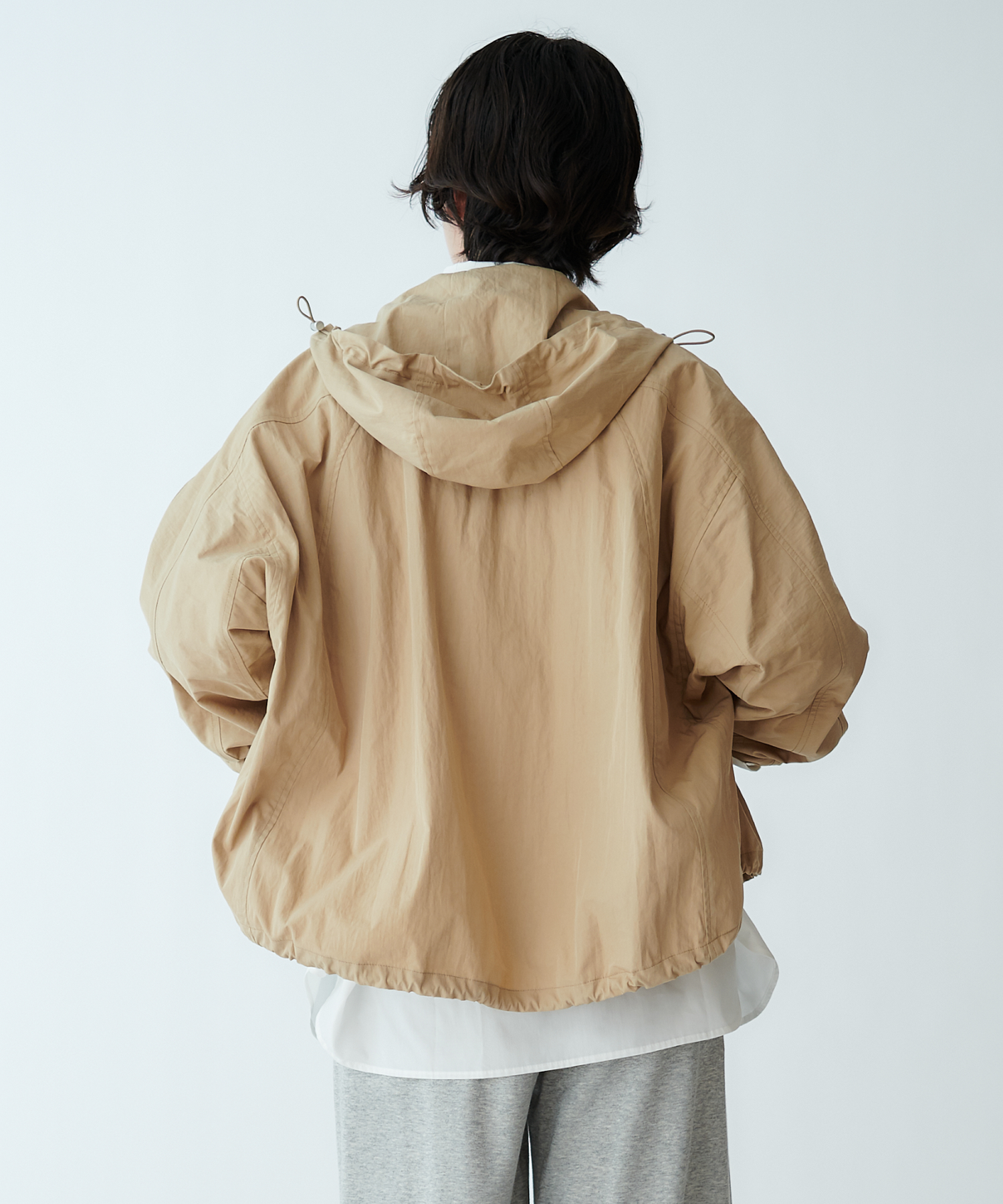 抜け感のあるシルエットを演出する、テントラインのフード付きブルゾン。