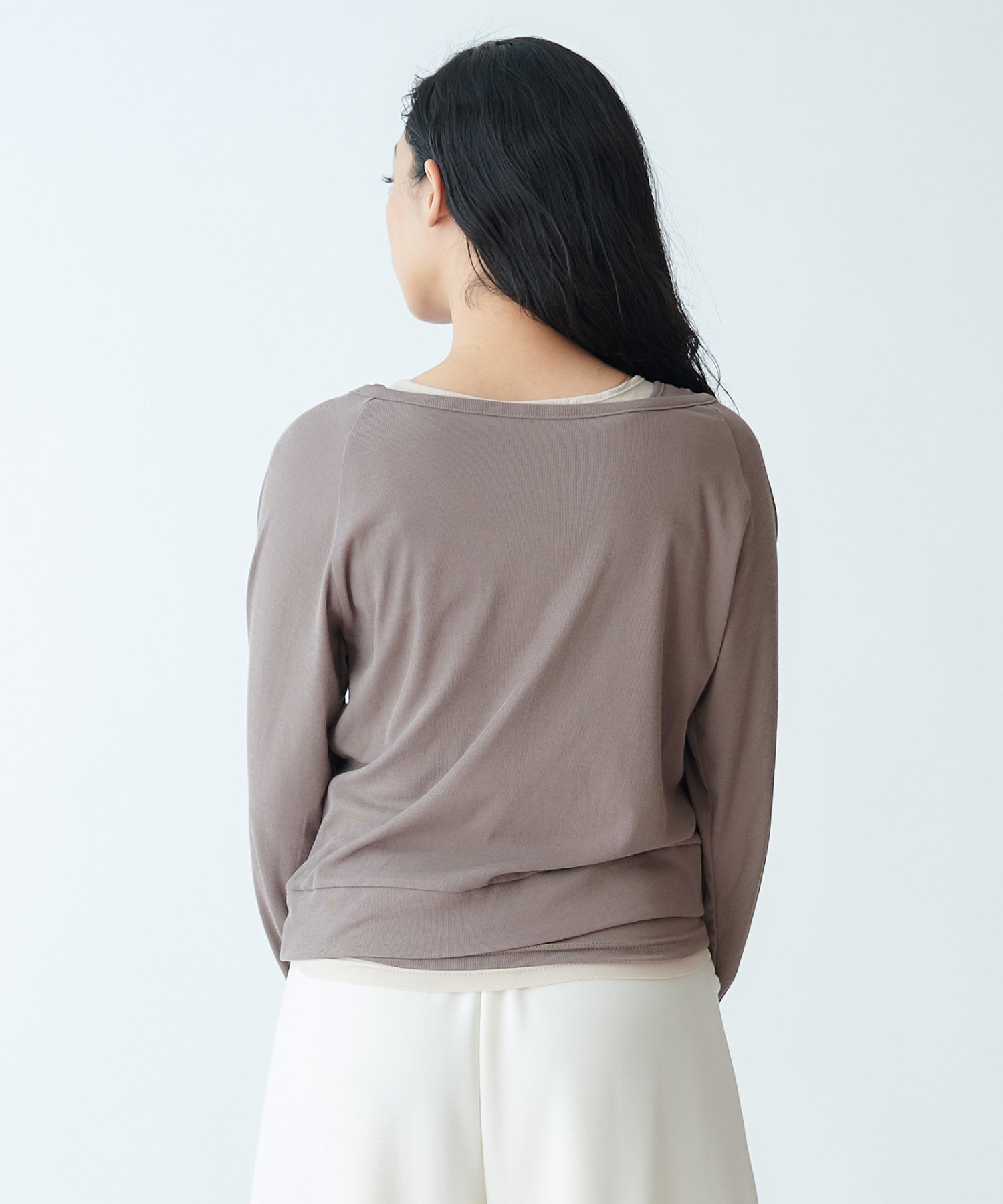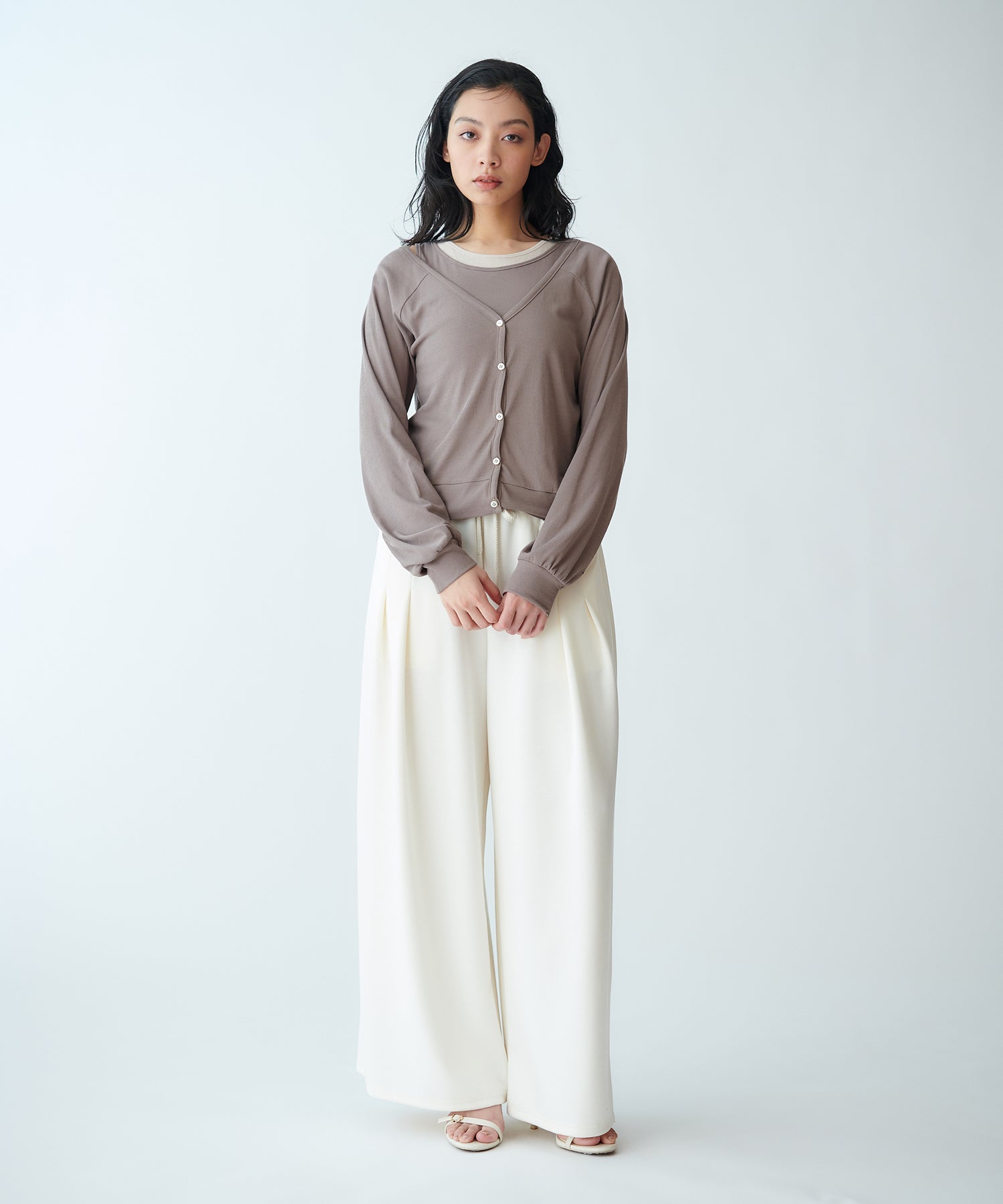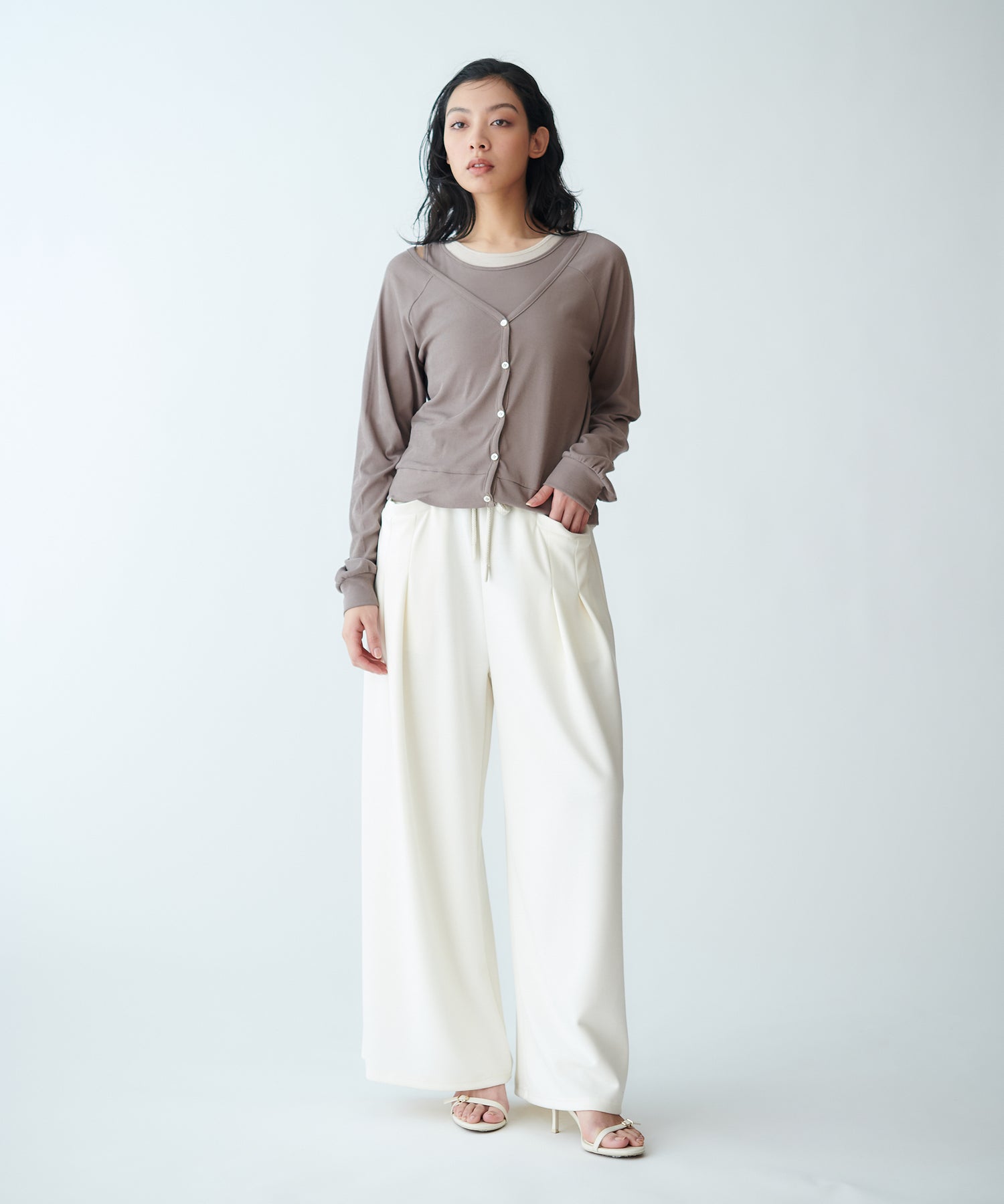 柔らかなトーンのワイドパンツと合わせることで、素材のしなやかな質感が引き立つ、大人のリラックスムード漂うワントーンコーデが完成します。