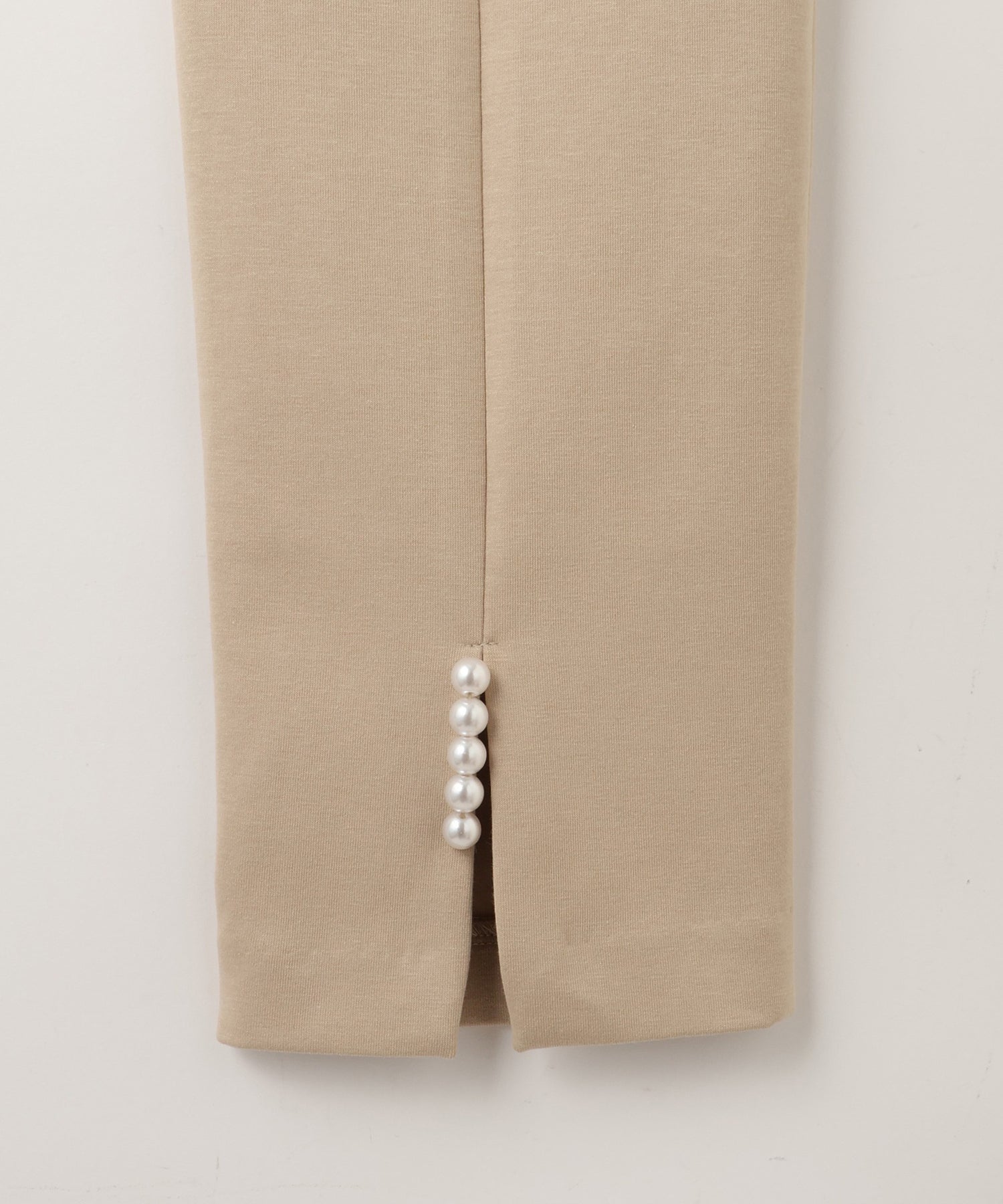 バックのスリットにあしらったパールが、後ろ姿にさりげないアクセントを添え、シンプルな装いに上品な華やかさをプラス。
