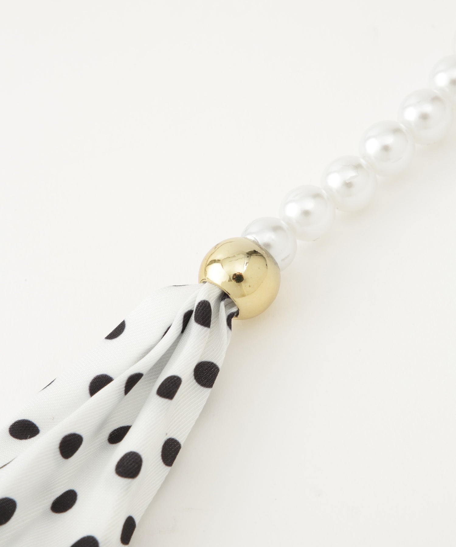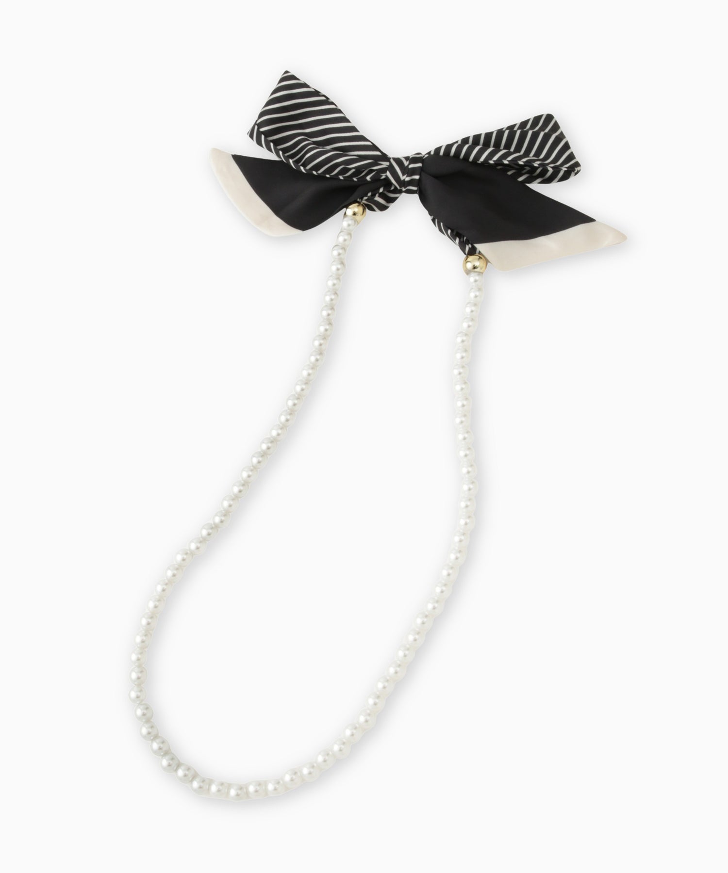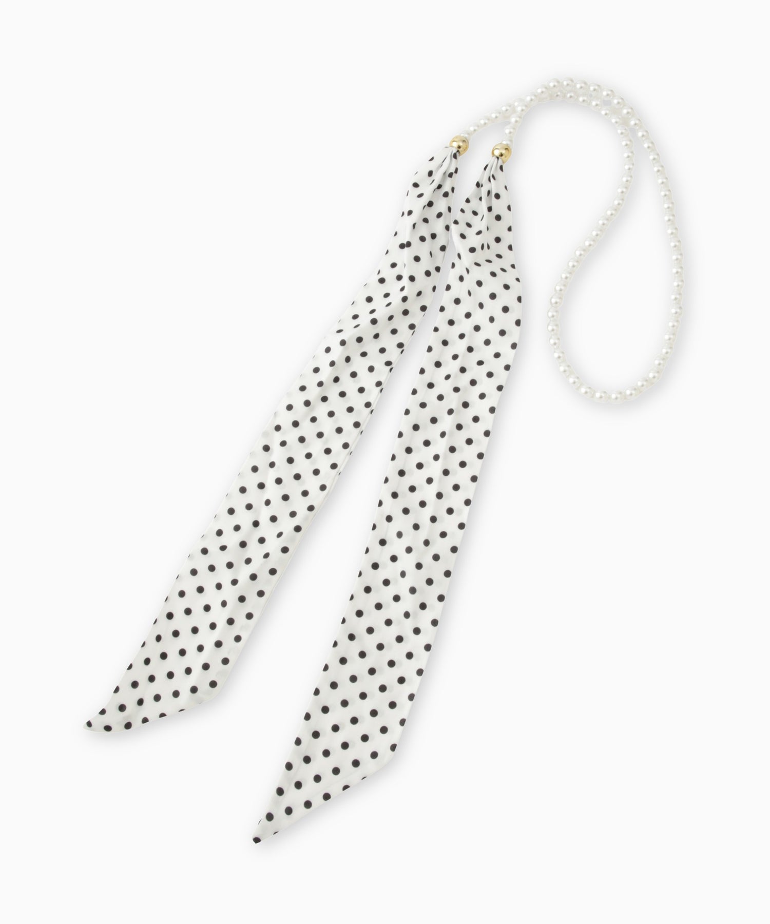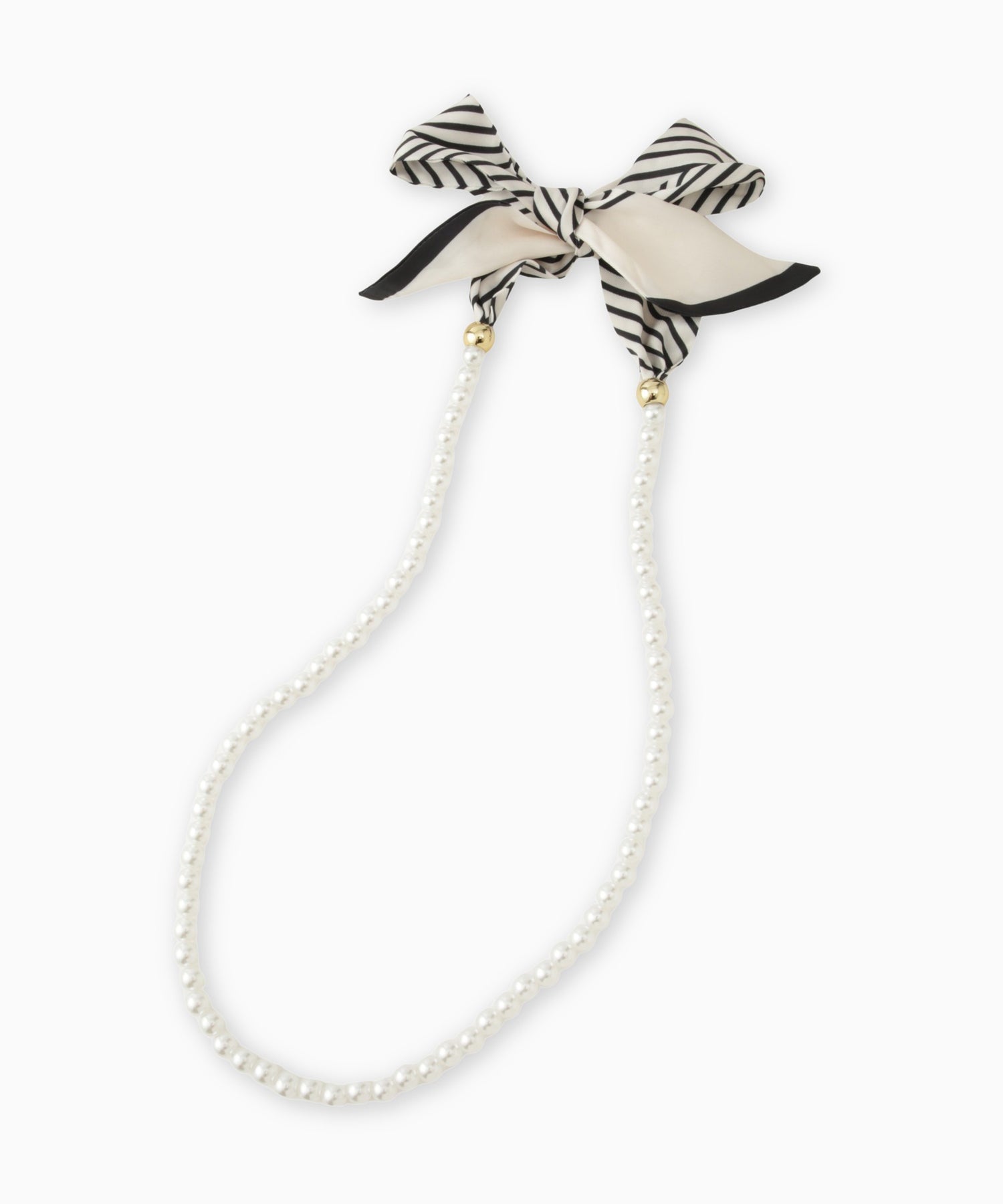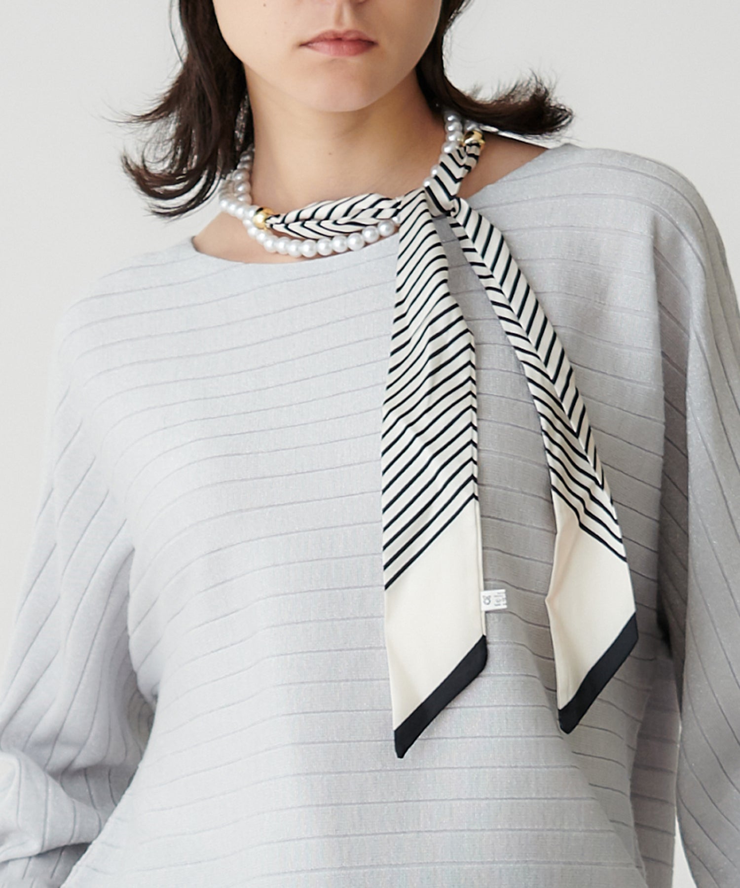 細めのボーダースカーフと上品なパールのセットアイテム。