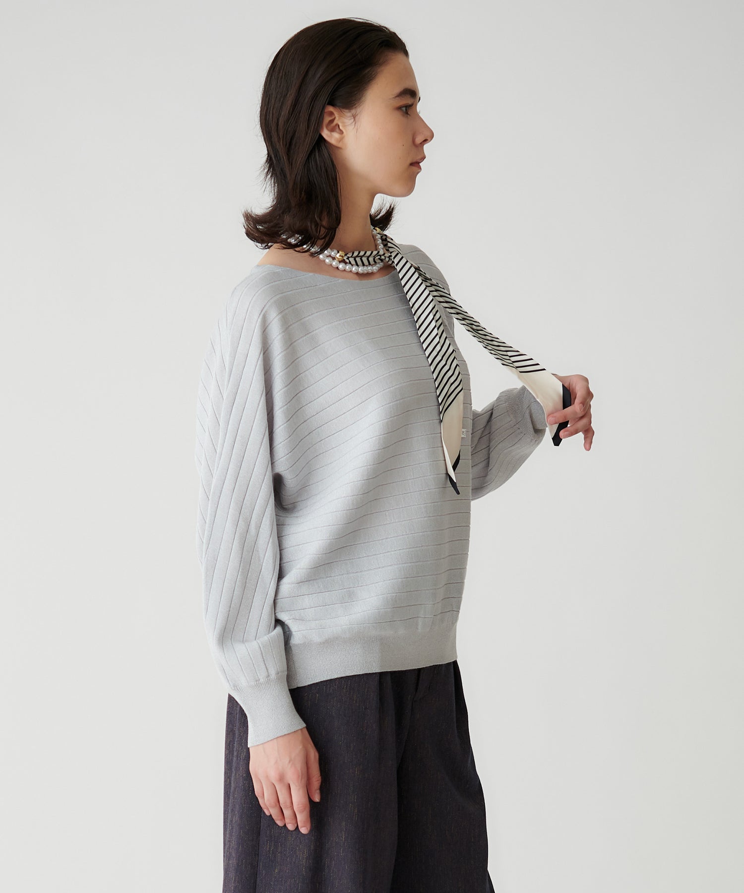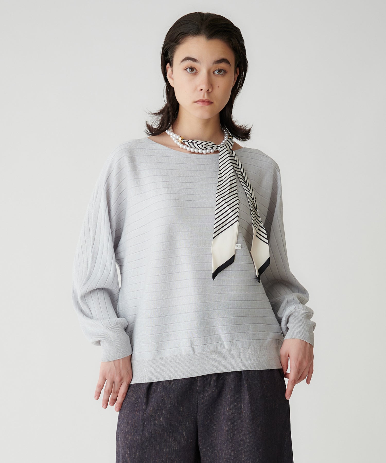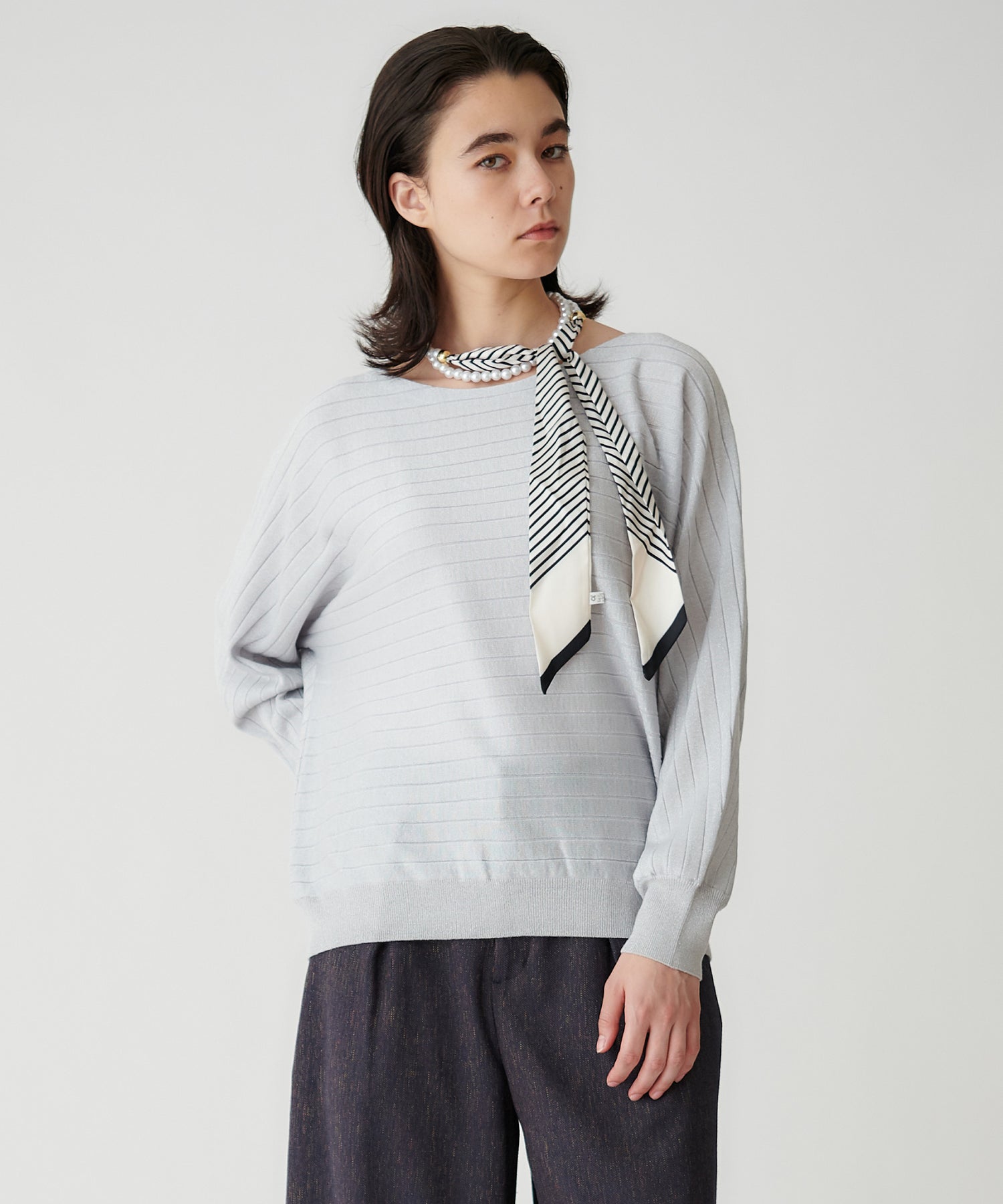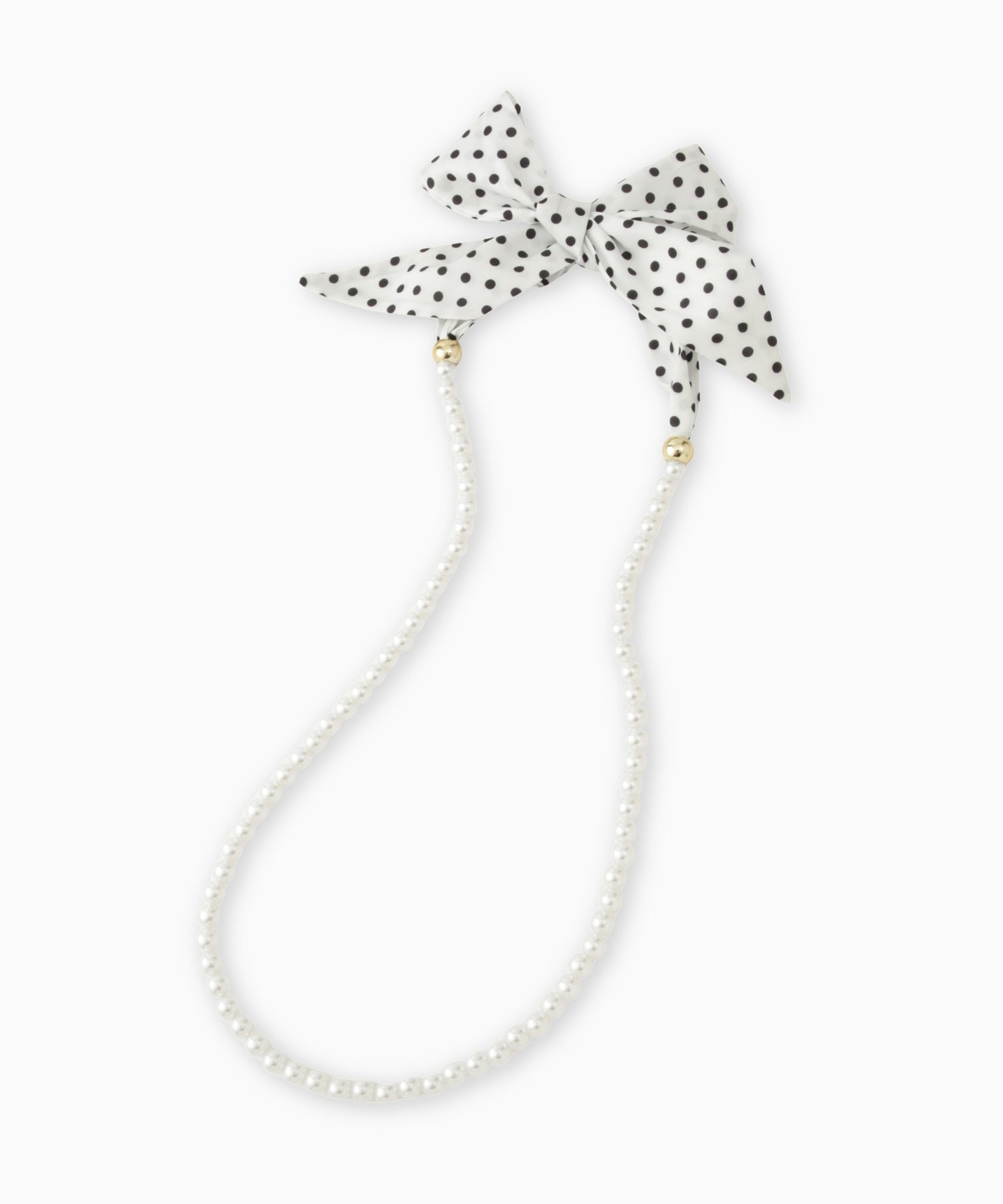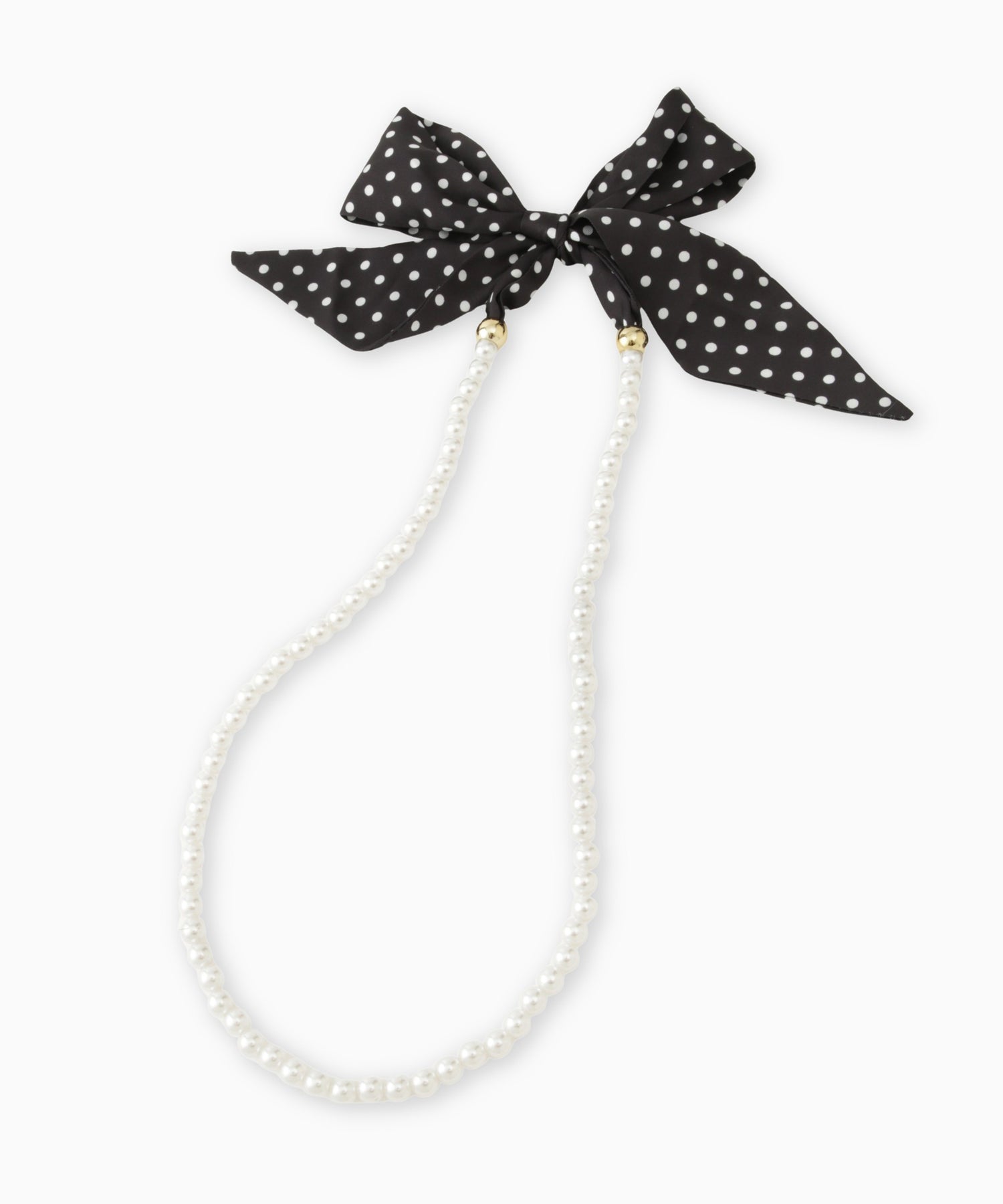 細めのボーダースカーフと上品なパールのセットアイテム。