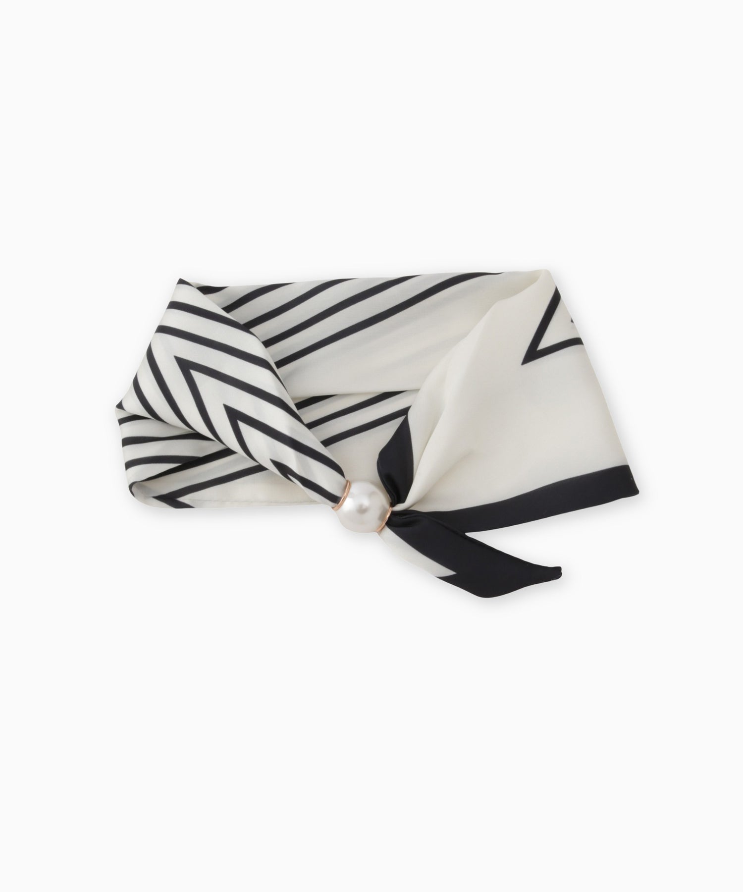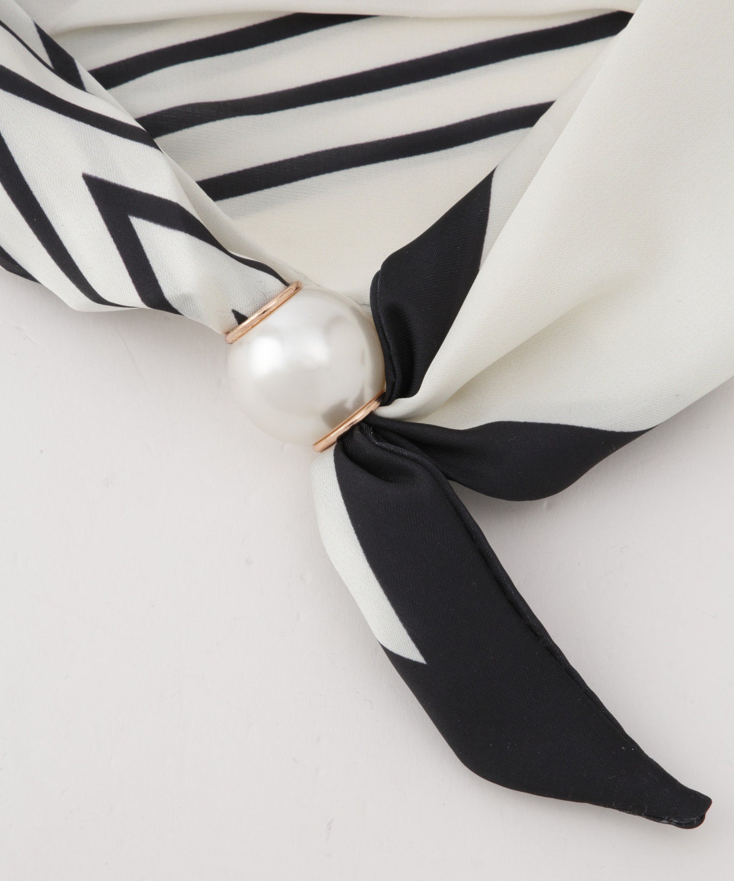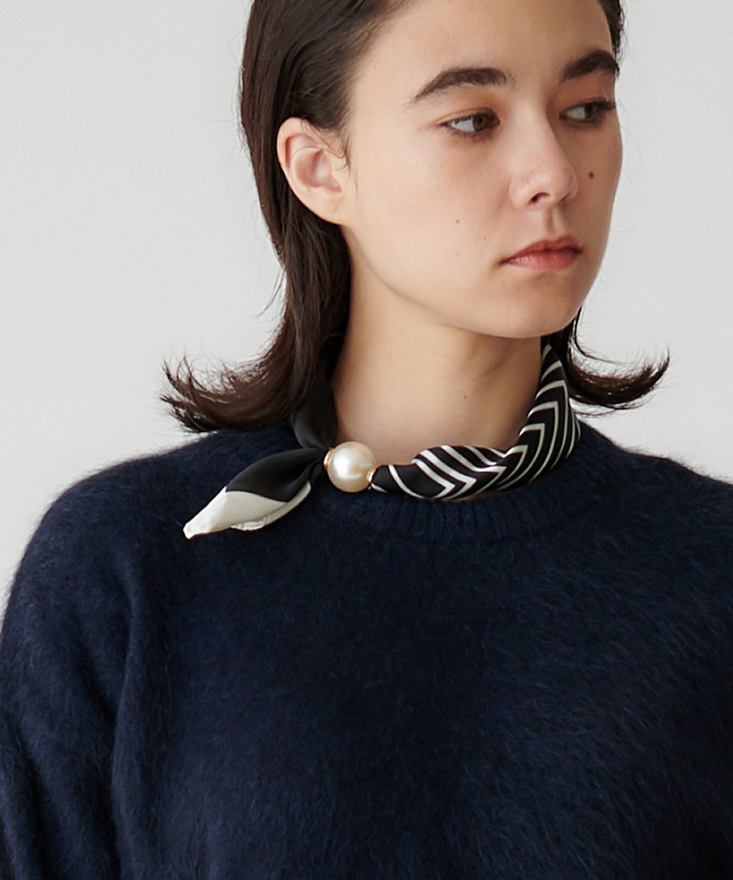 細めのボーダースカーフに大ぶりなパールがついてアクセントに。