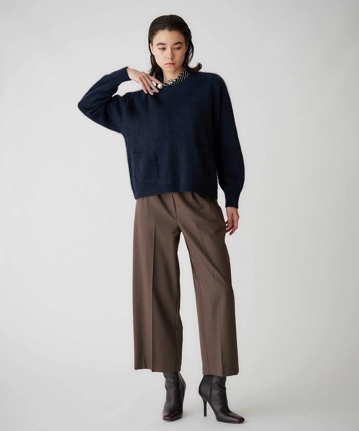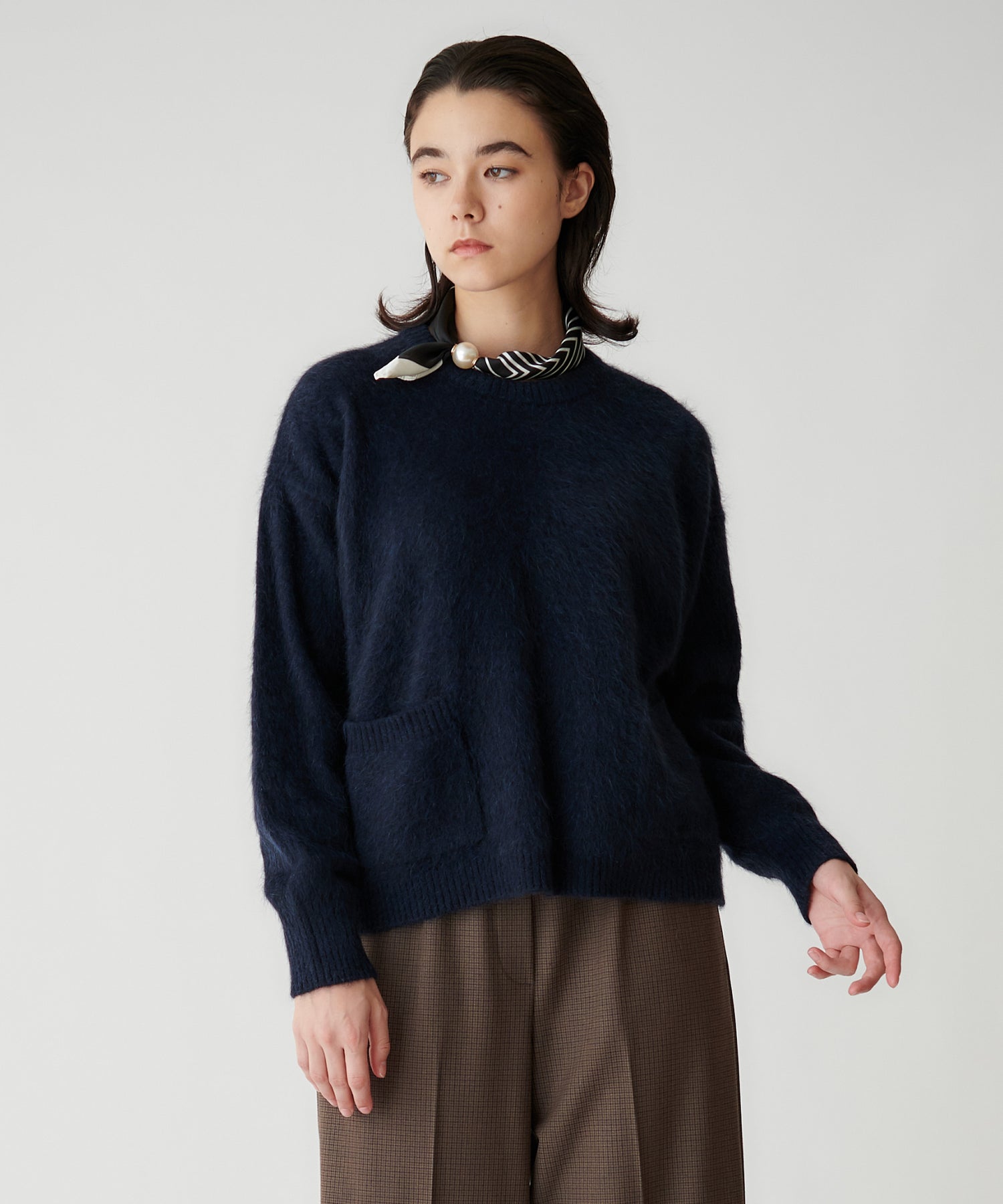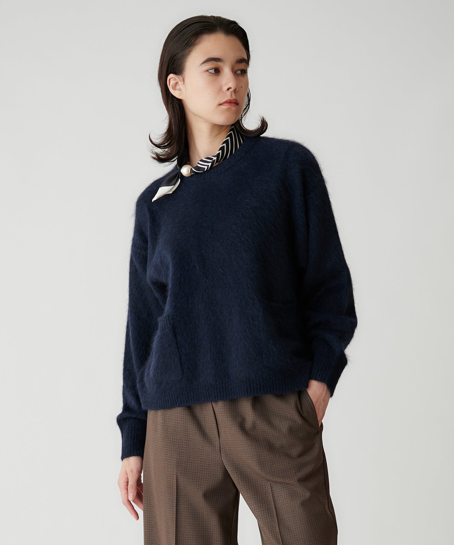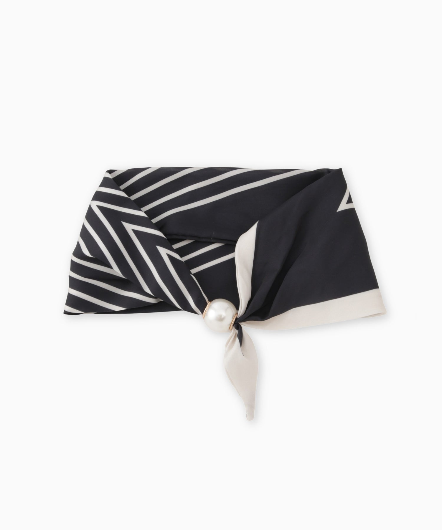 細めのボーダースカーフに大ぶりなパールがついてアクセントに。