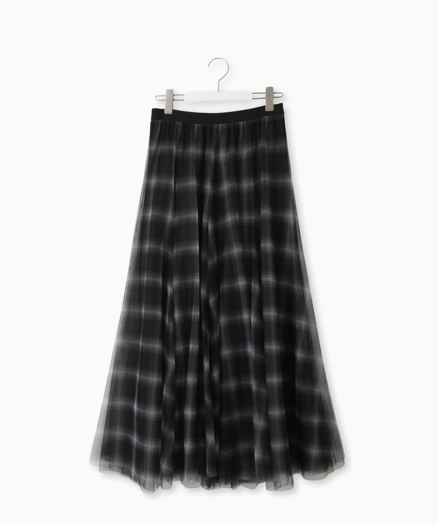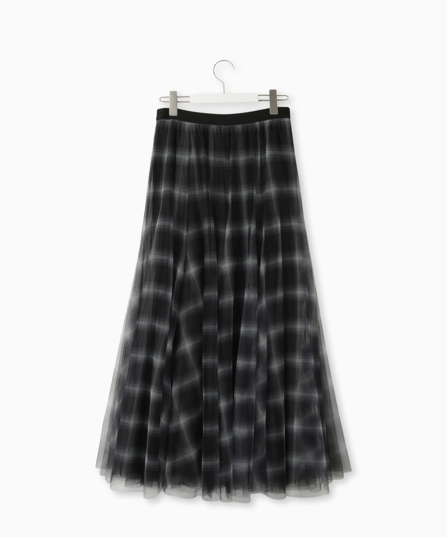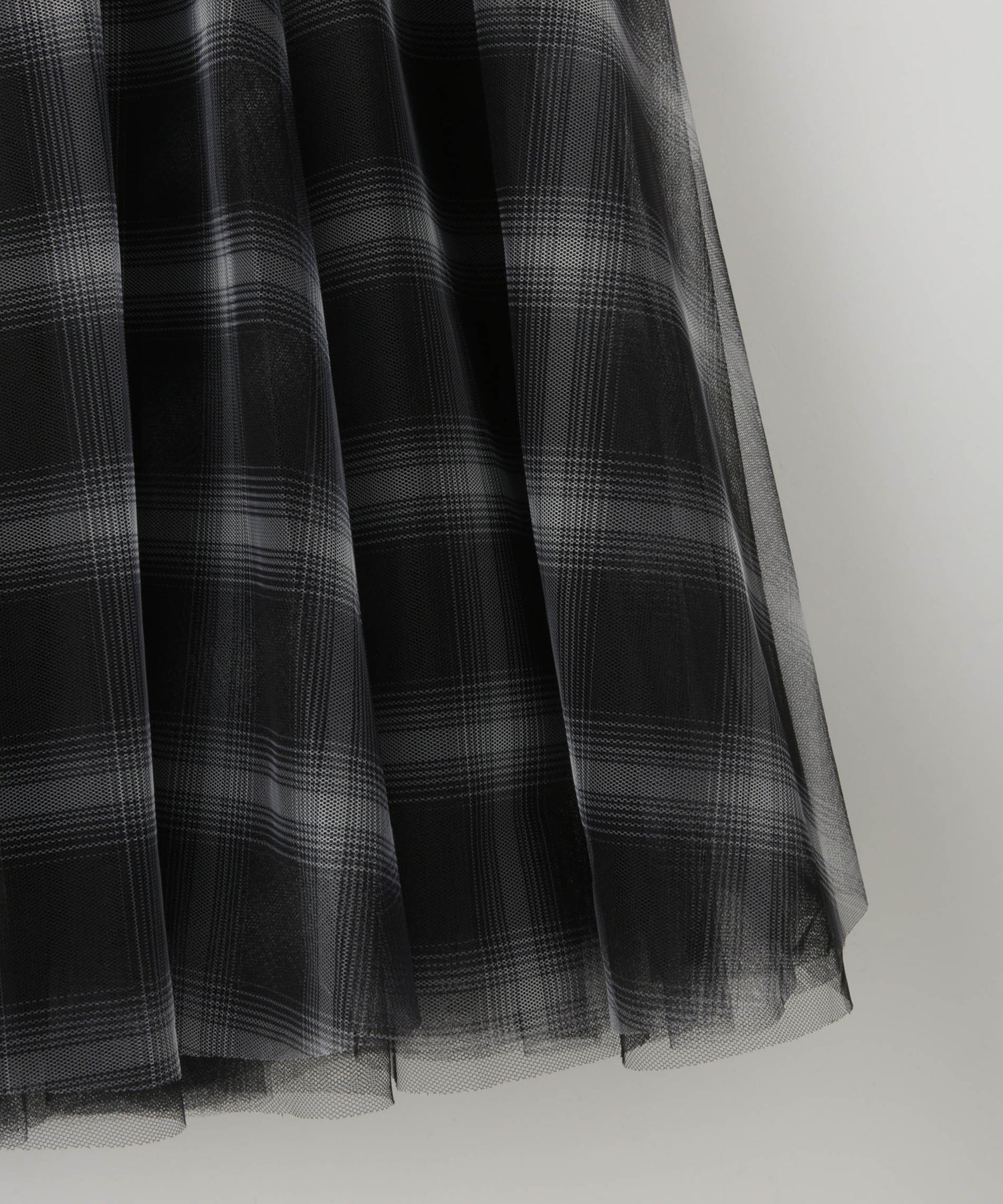 ふんわりと広がるチュールに、チェック柄のスカートを重ねたニュアンスたっぷりのデザイン。軽やかさと柄が組み合わさり、コーデにモード感をプラス。