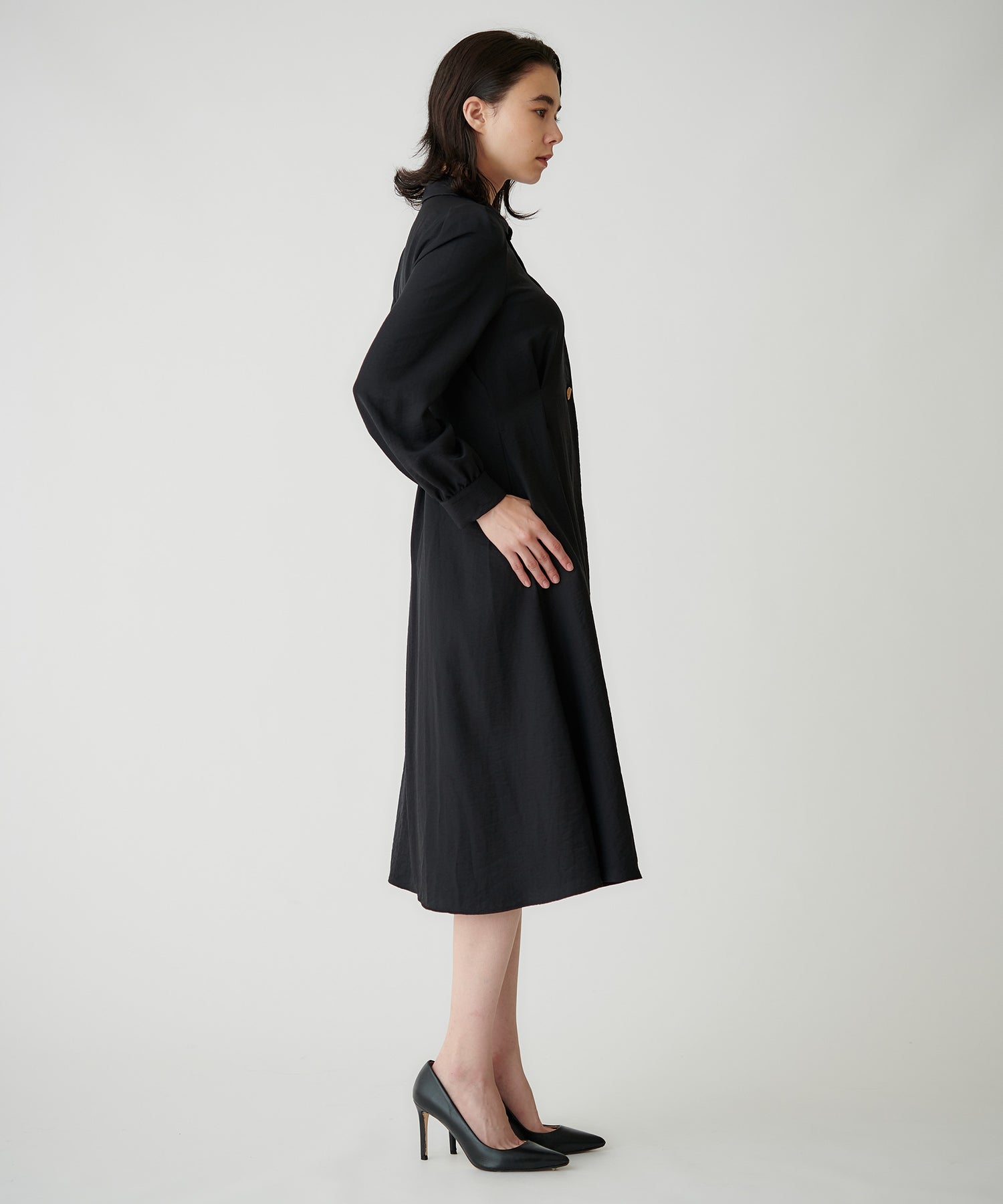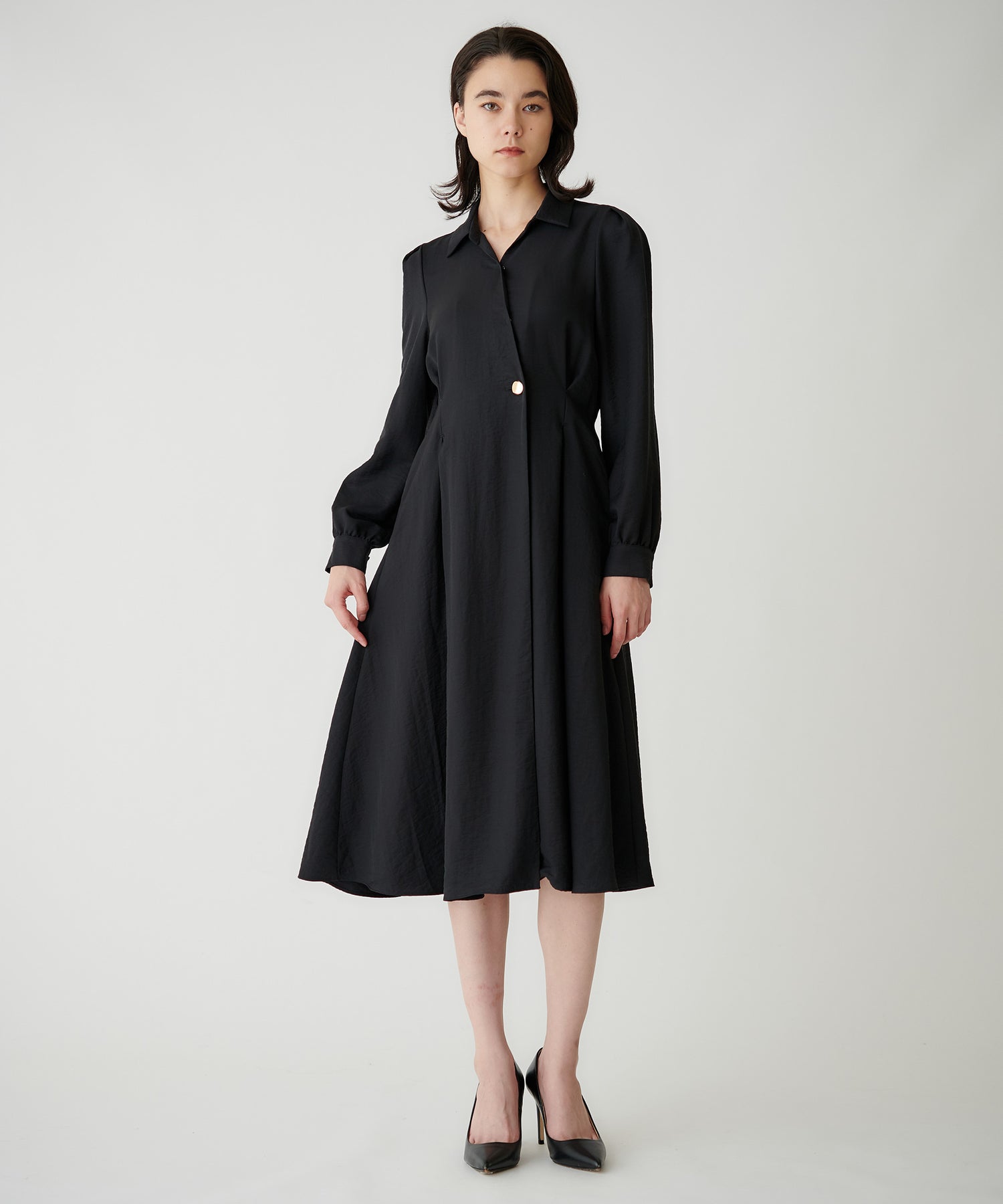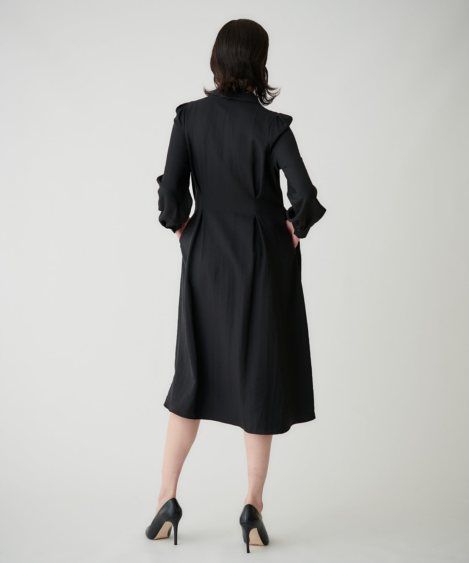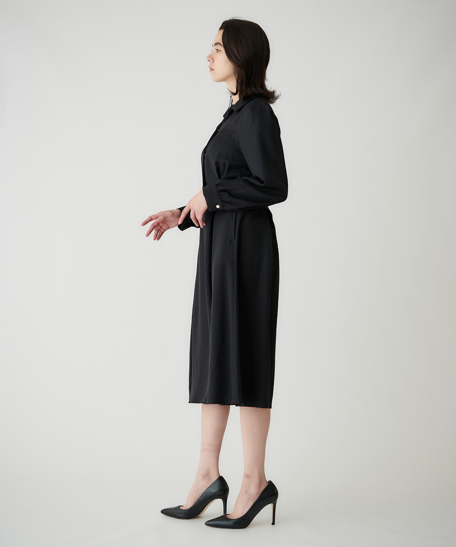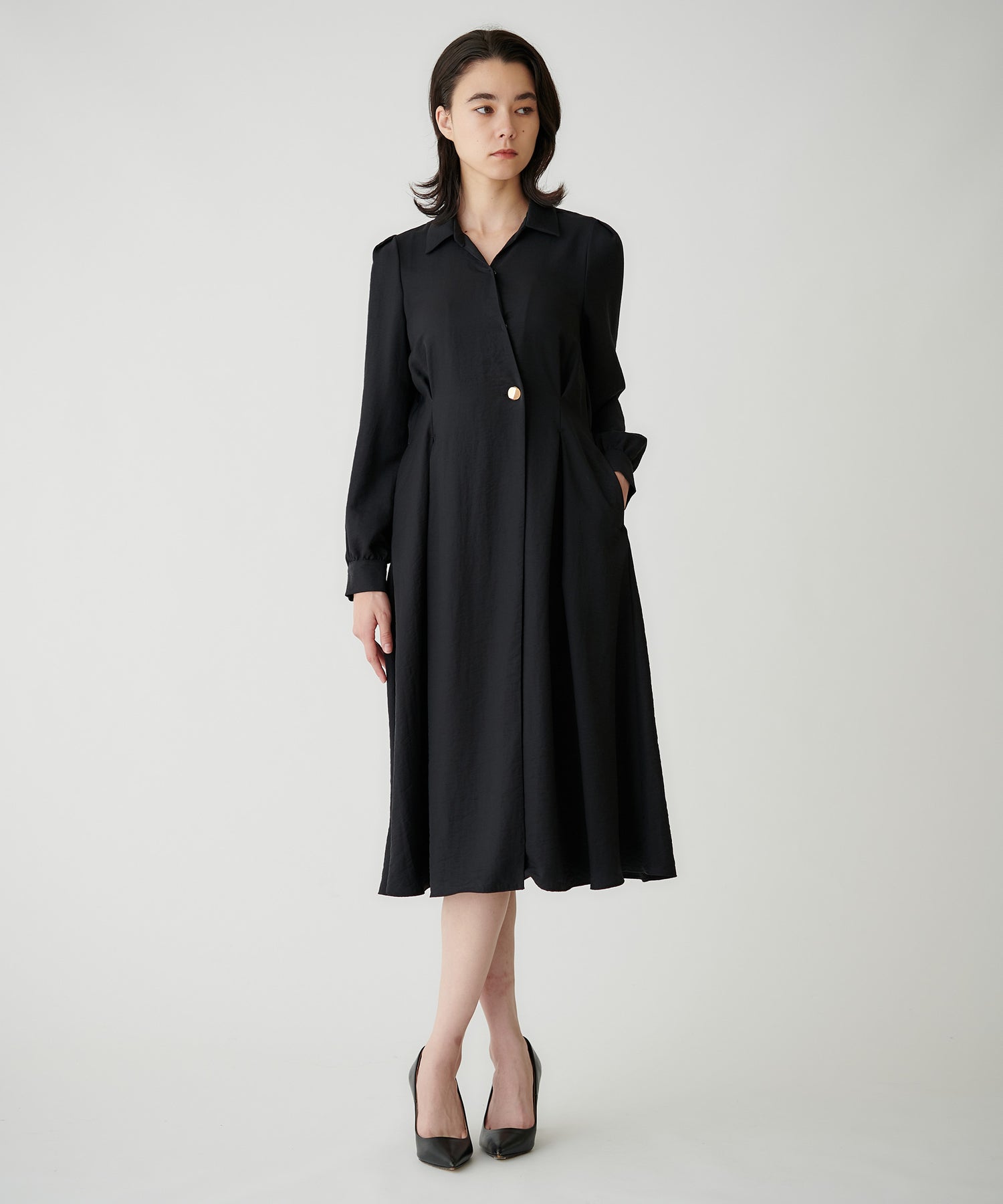 シャツライクな衿ぐりと見せかけスリットが女性らしい一枚です。