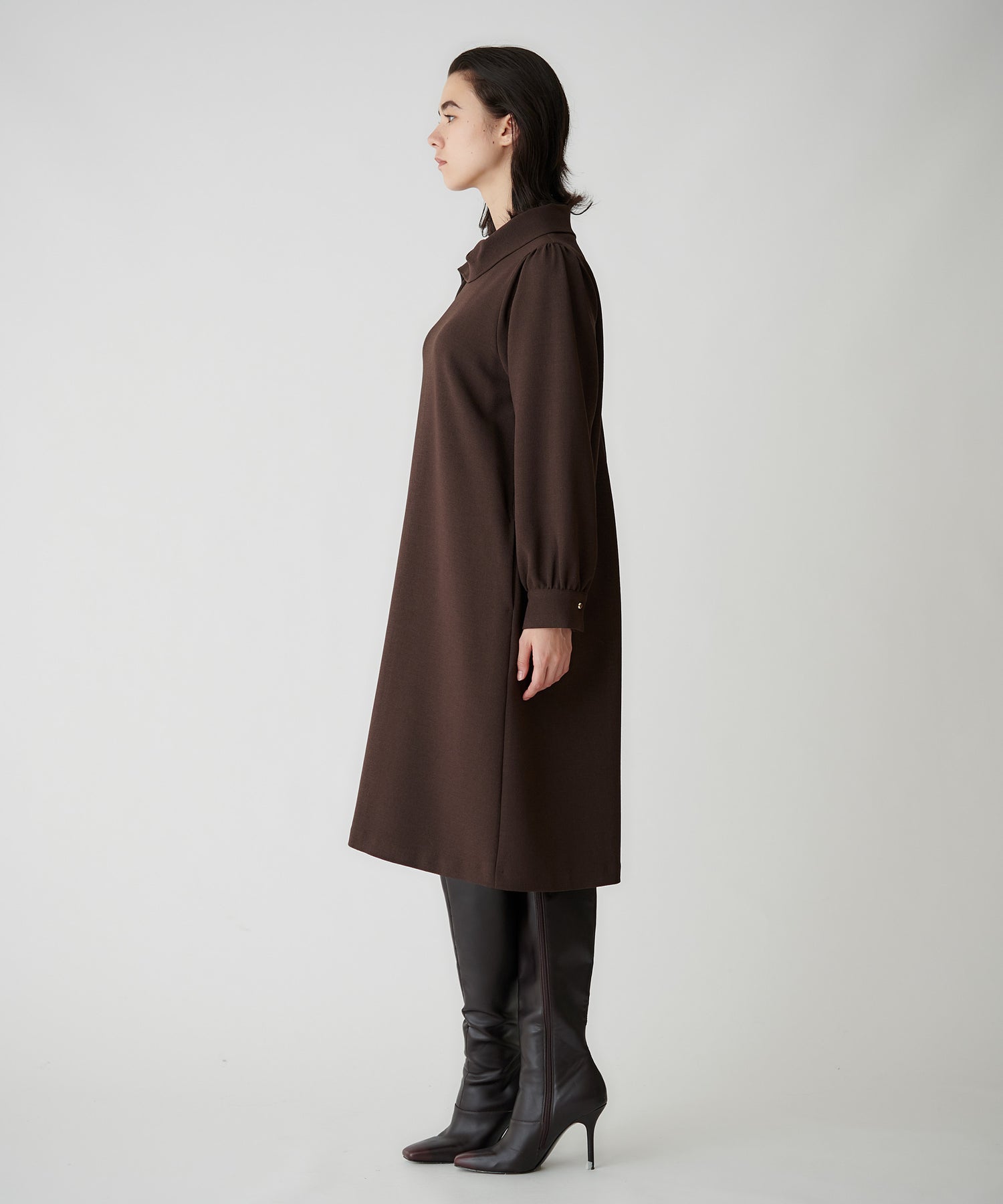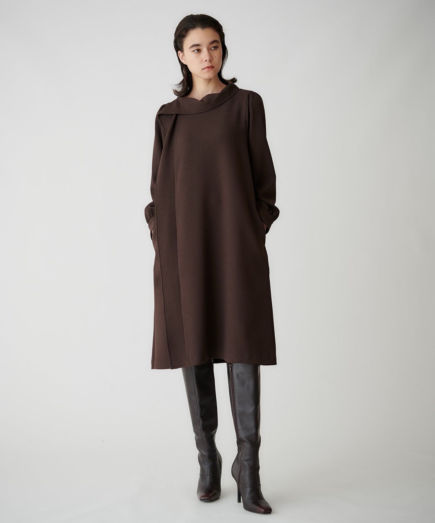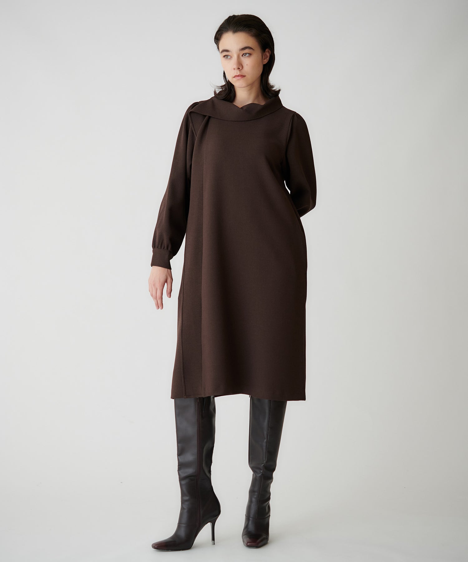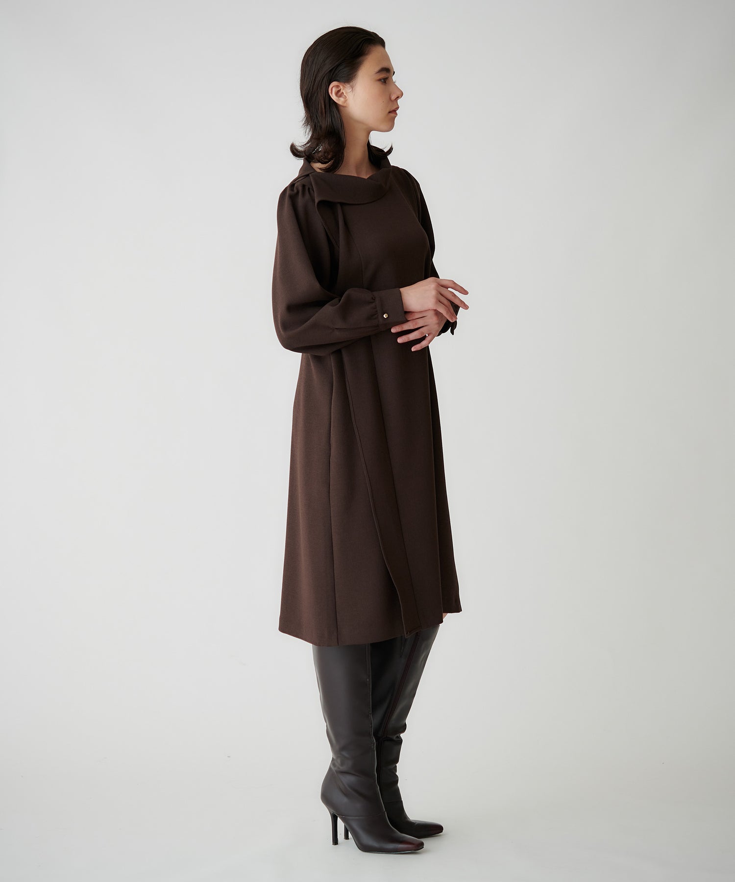 首周りを華奢に見せるネックラインと肩から流れるように入るフリルドレープが上品な印象をつくるワンピース。縦のラインがすっきり見え、1枚で決まる存在感のあるデザインです。
