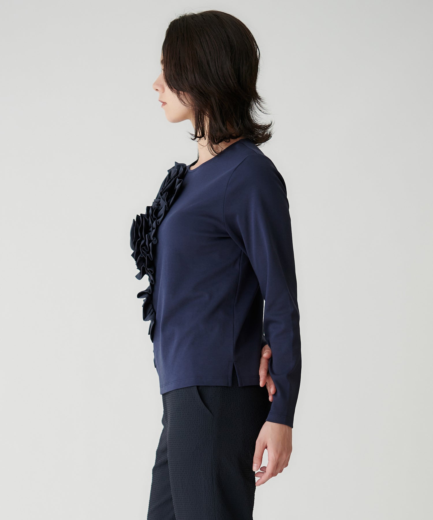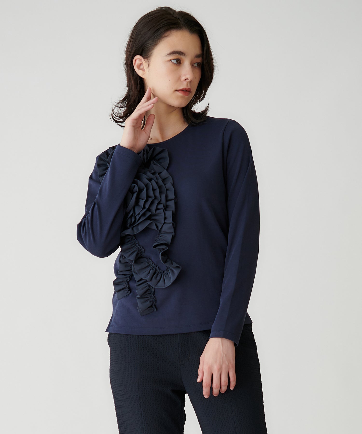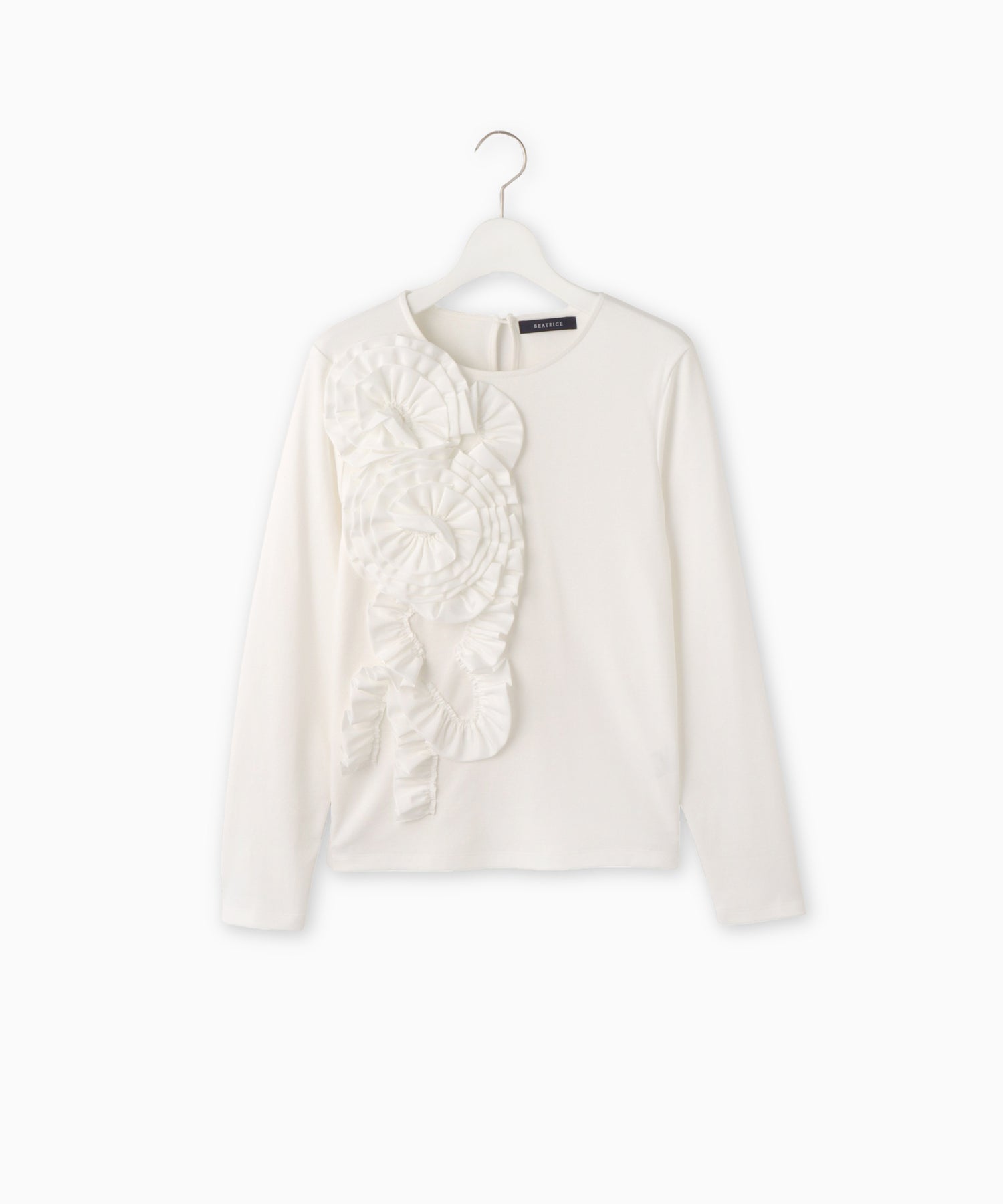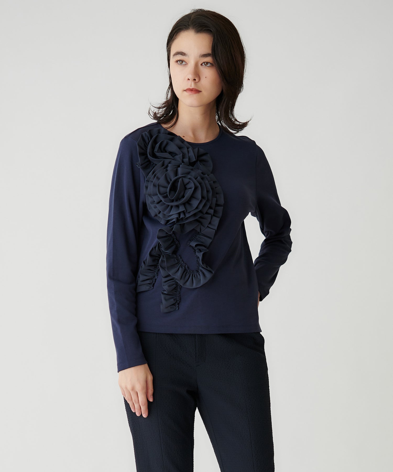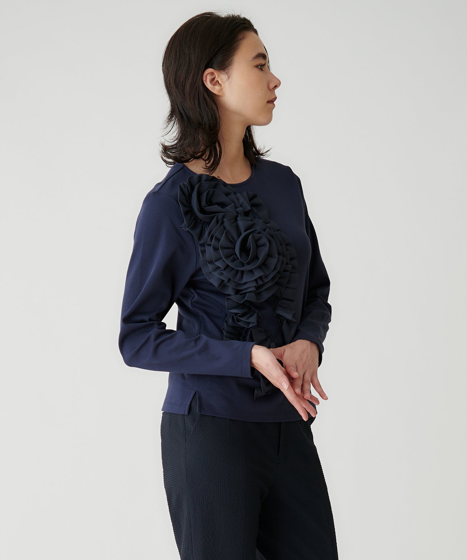 フラワーモチーフのように施した3Dフリルが目を引く、存在感のあるプルオーバー。