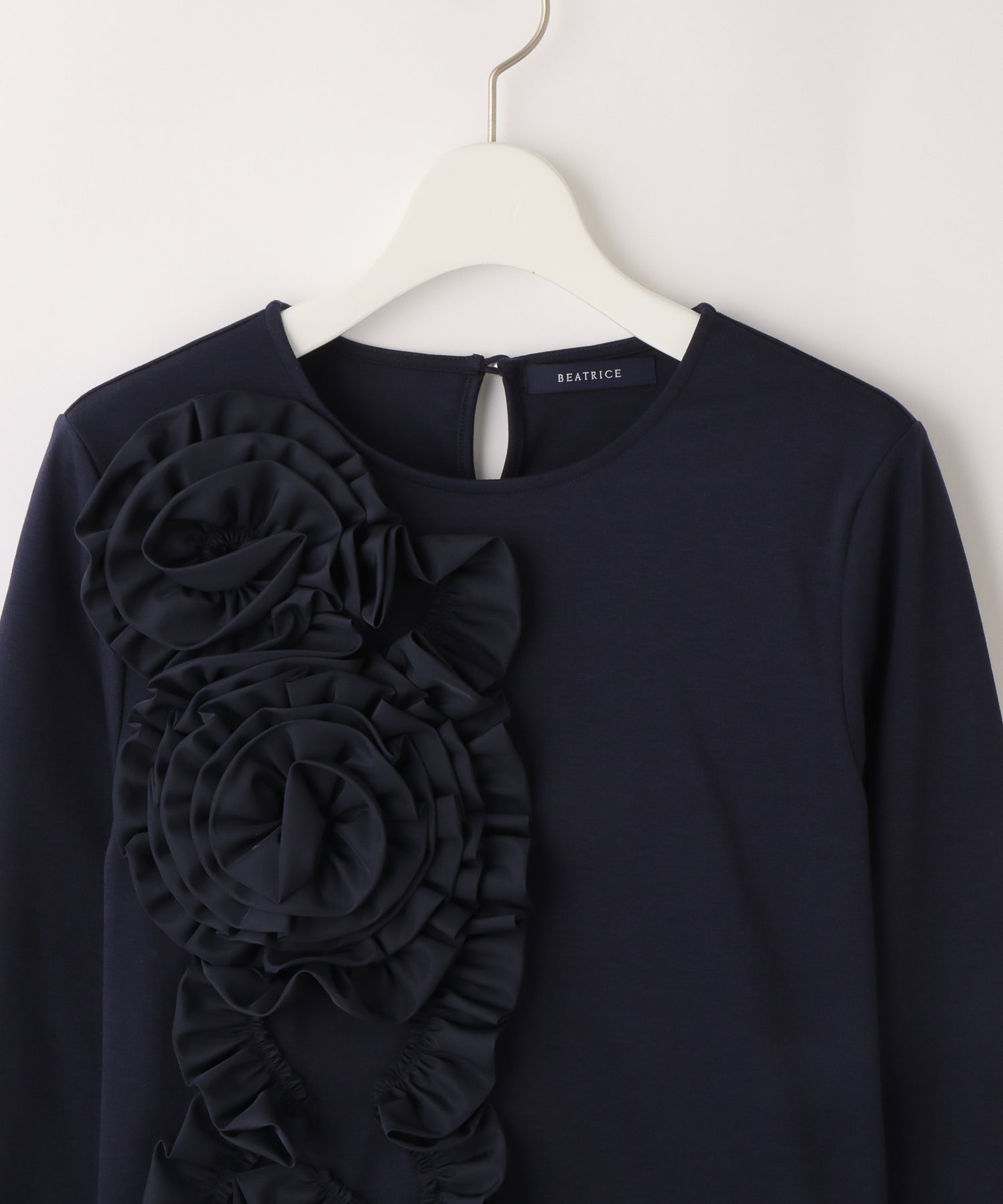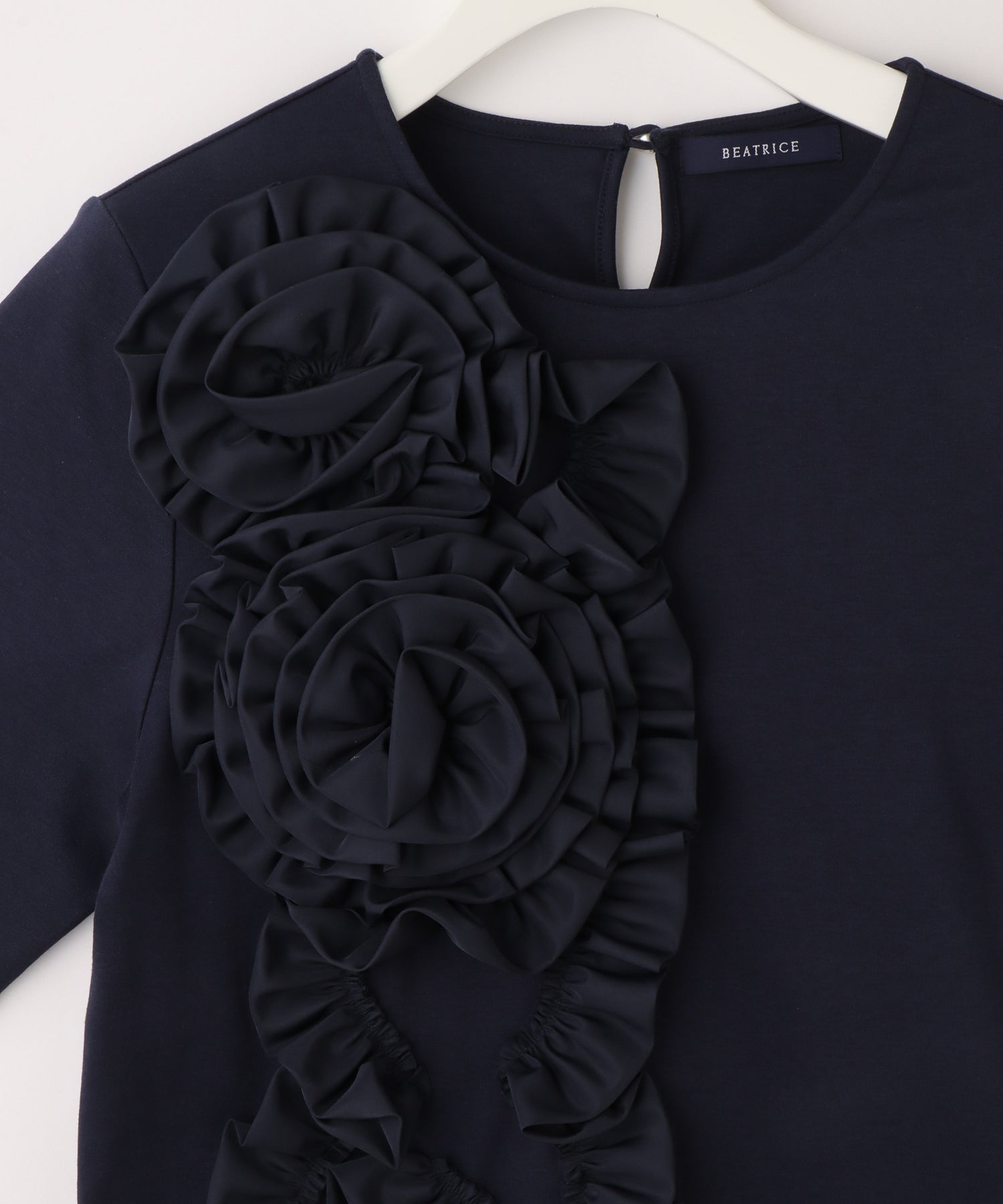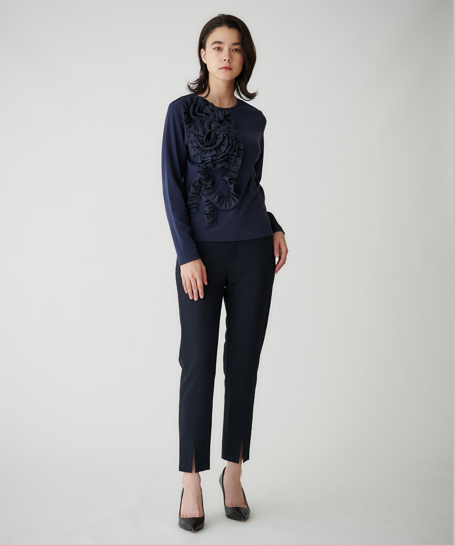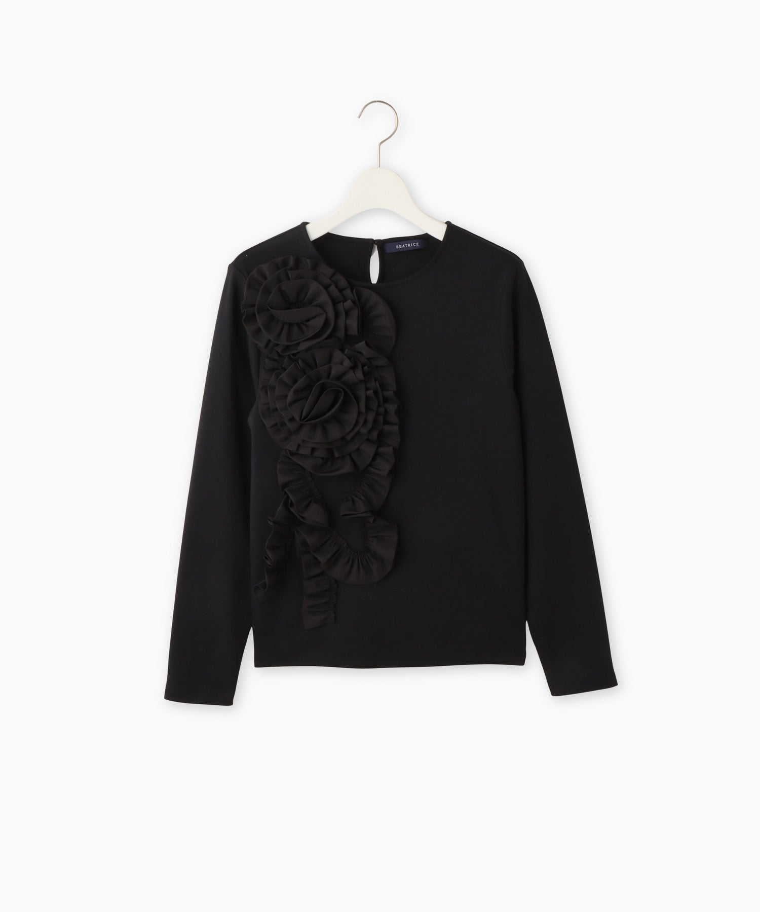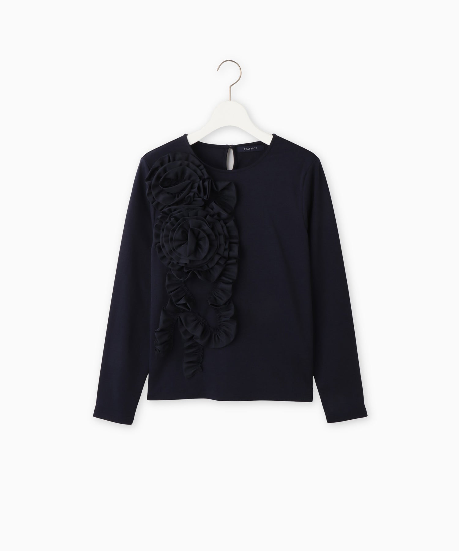 フラワーモチーフのように施した3Dフリルが目を引く、存在感のあるプルオーバー。