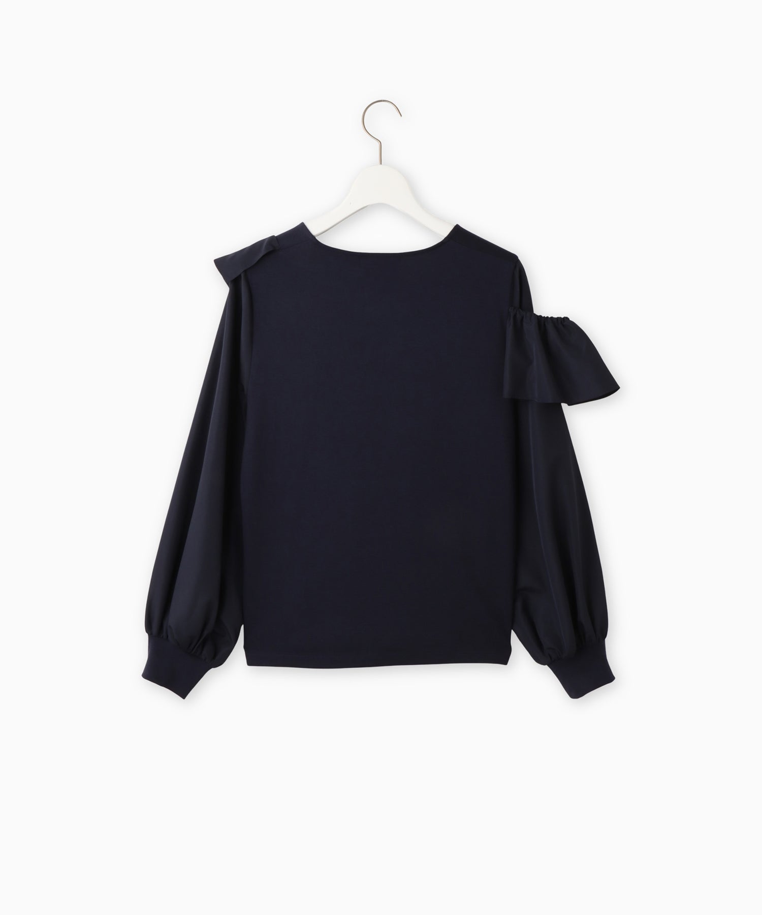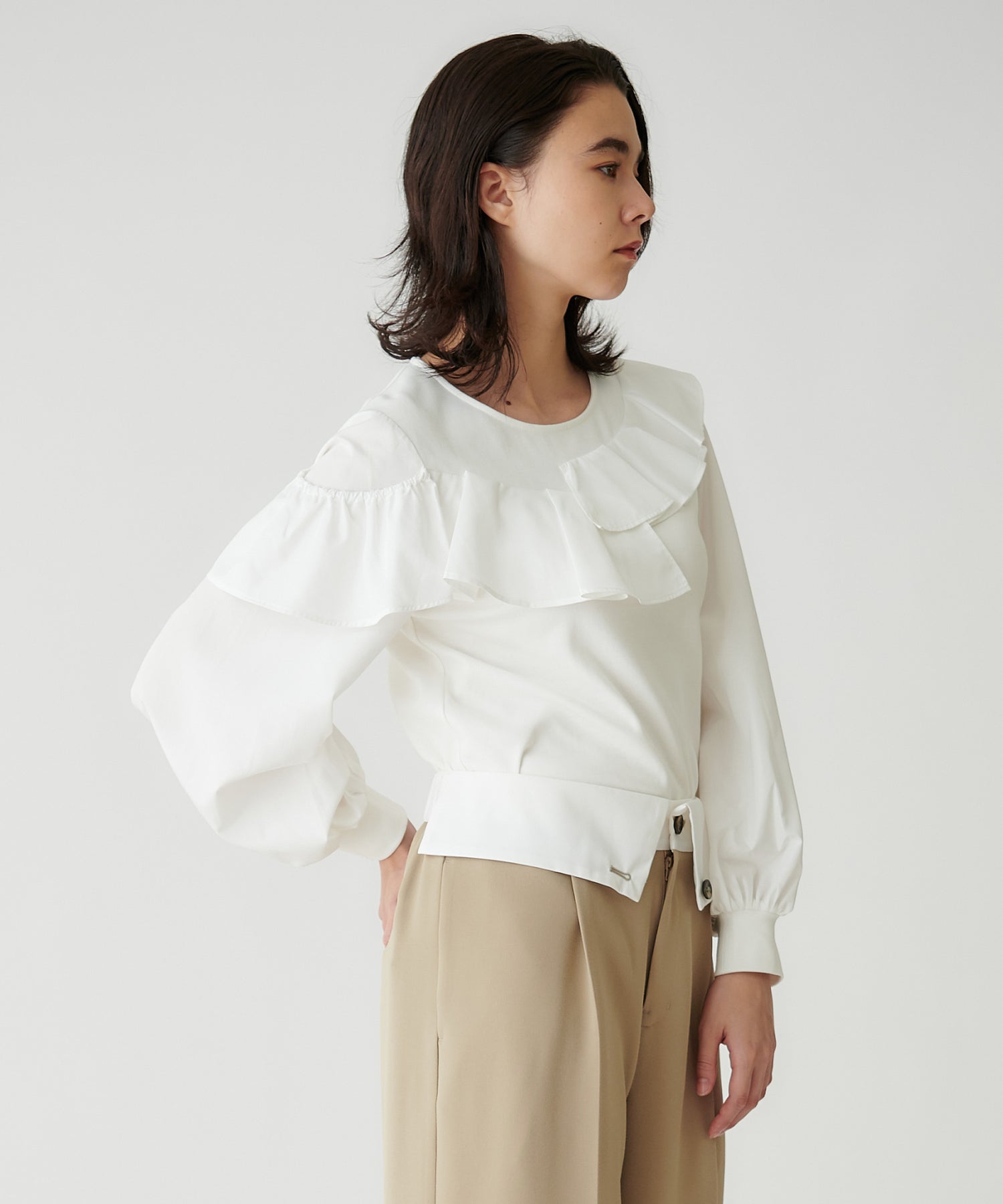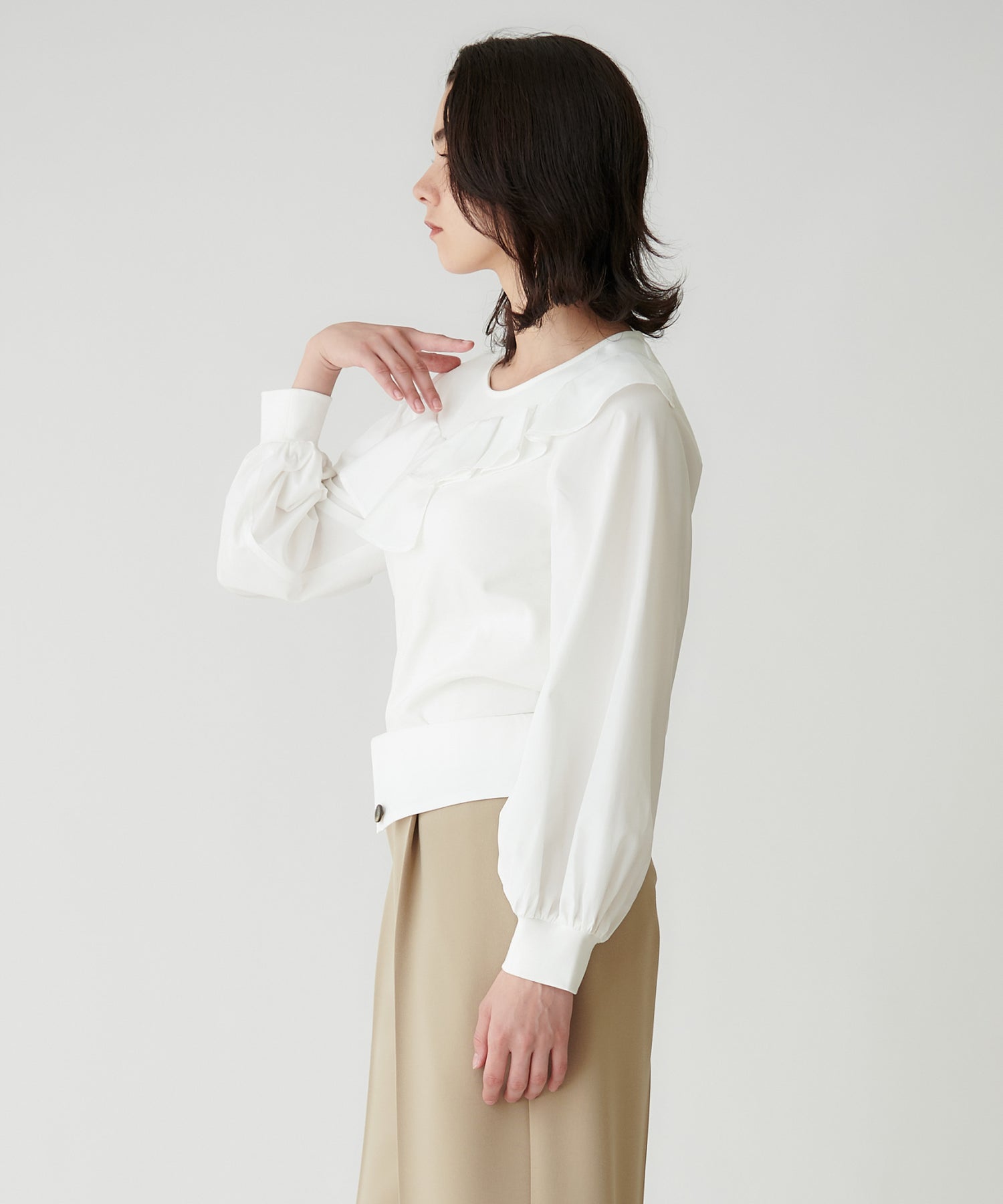 右肩のフリルは、肩にのせてもオフショル風に下ろしても着用できます。