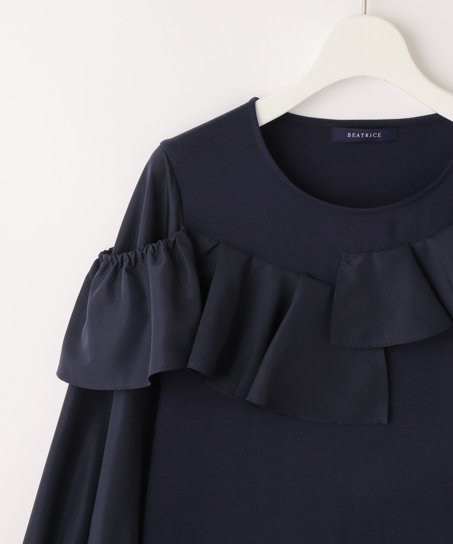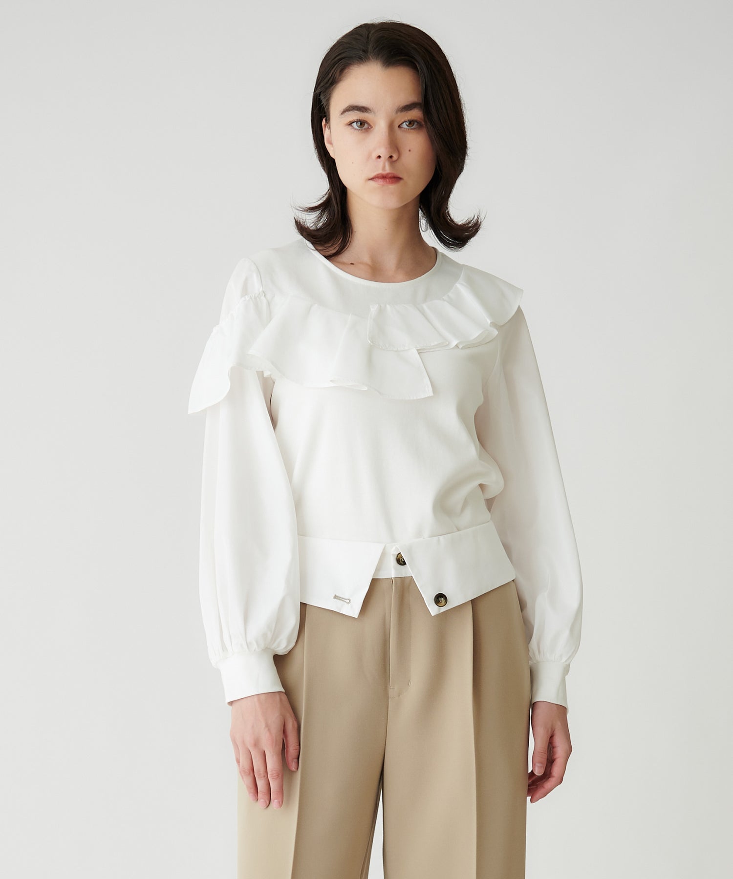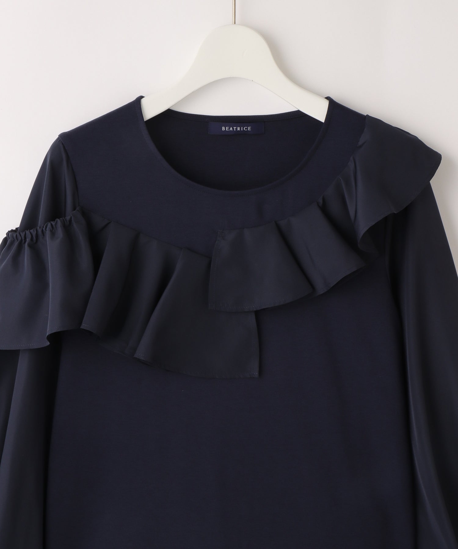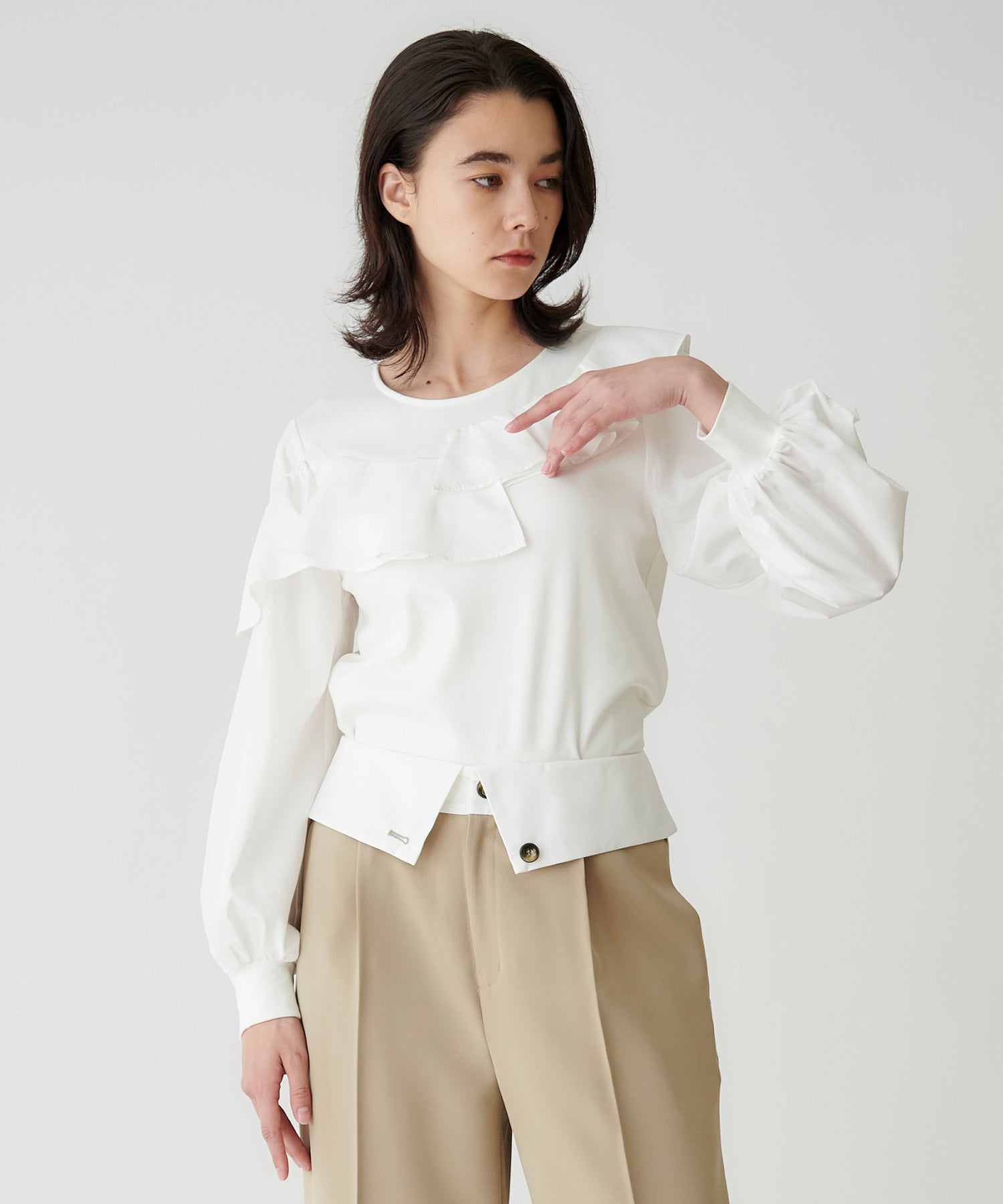 右肩のフリルは、肩にのせてもオフショル風に下ろしても着用できます。