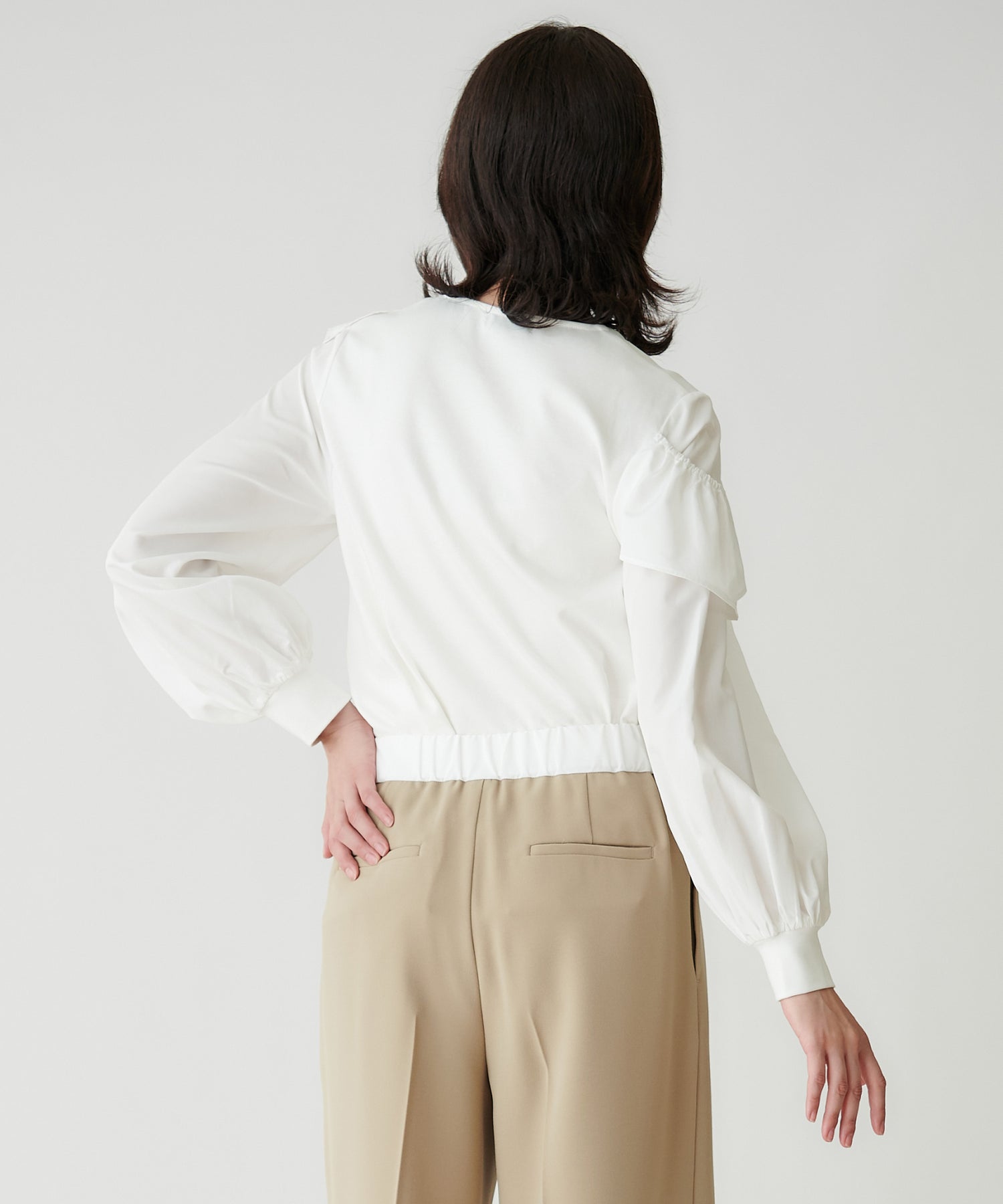 タックフリルがアクセントのドッキングトップス。