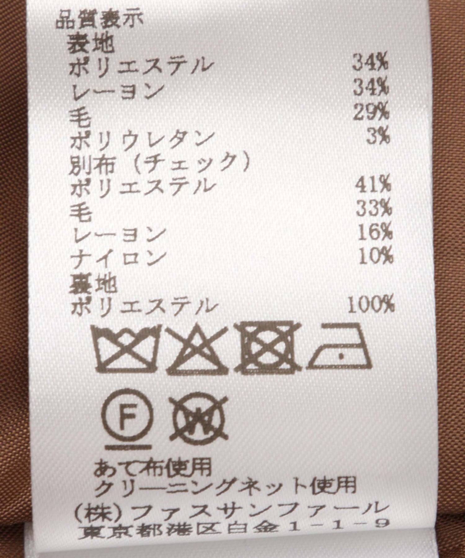 別布(チェック):ポリエステル41% 毛33% レーヨン16% ナイロン10%