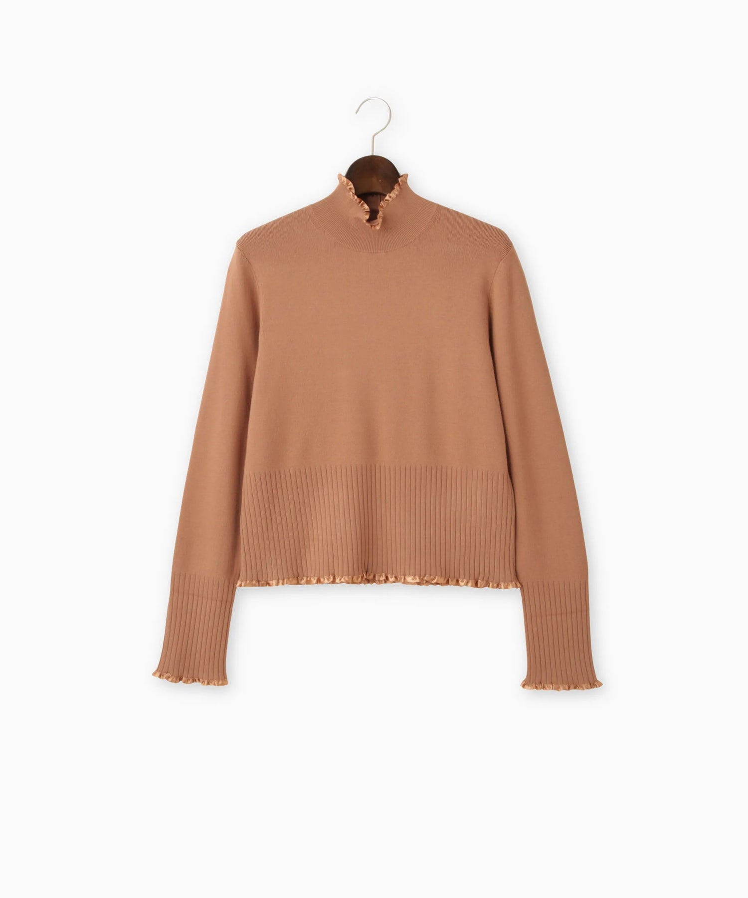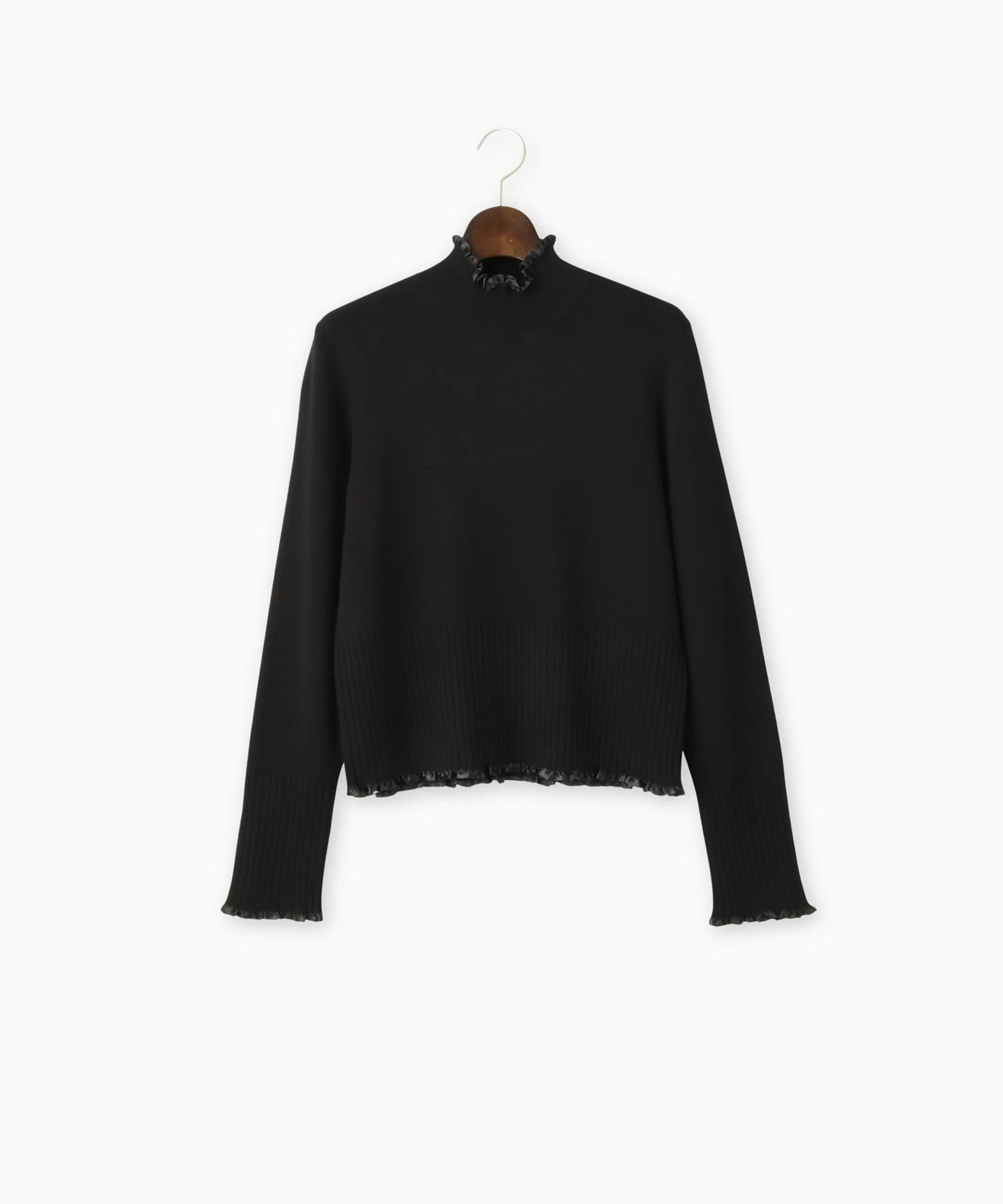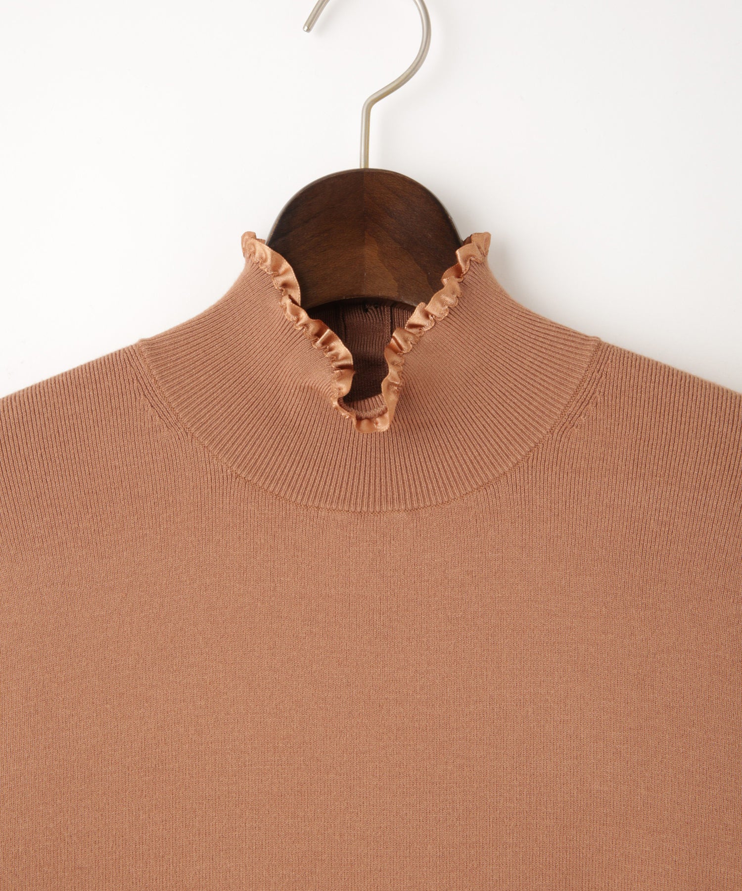 さり気ないサテンテープフリルが上品で大人のフェミニンさを演出するニット。