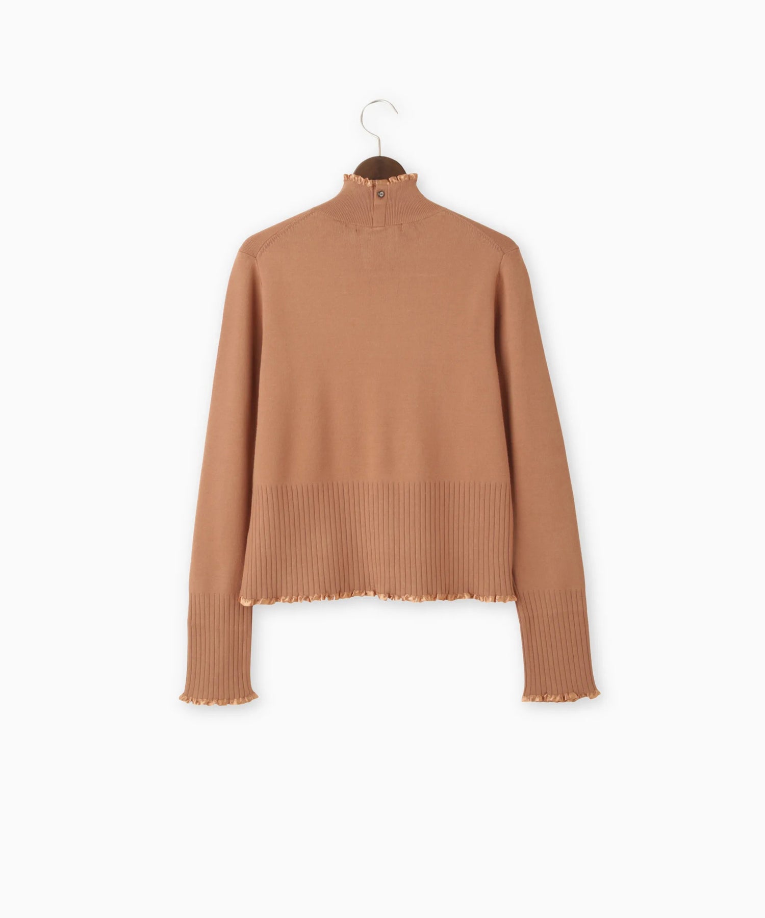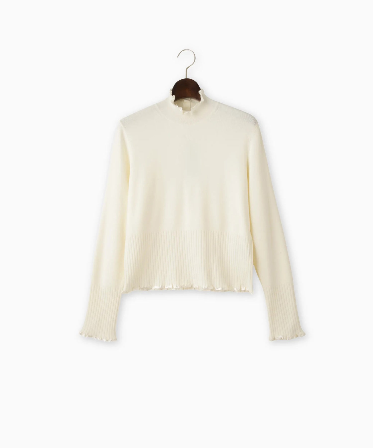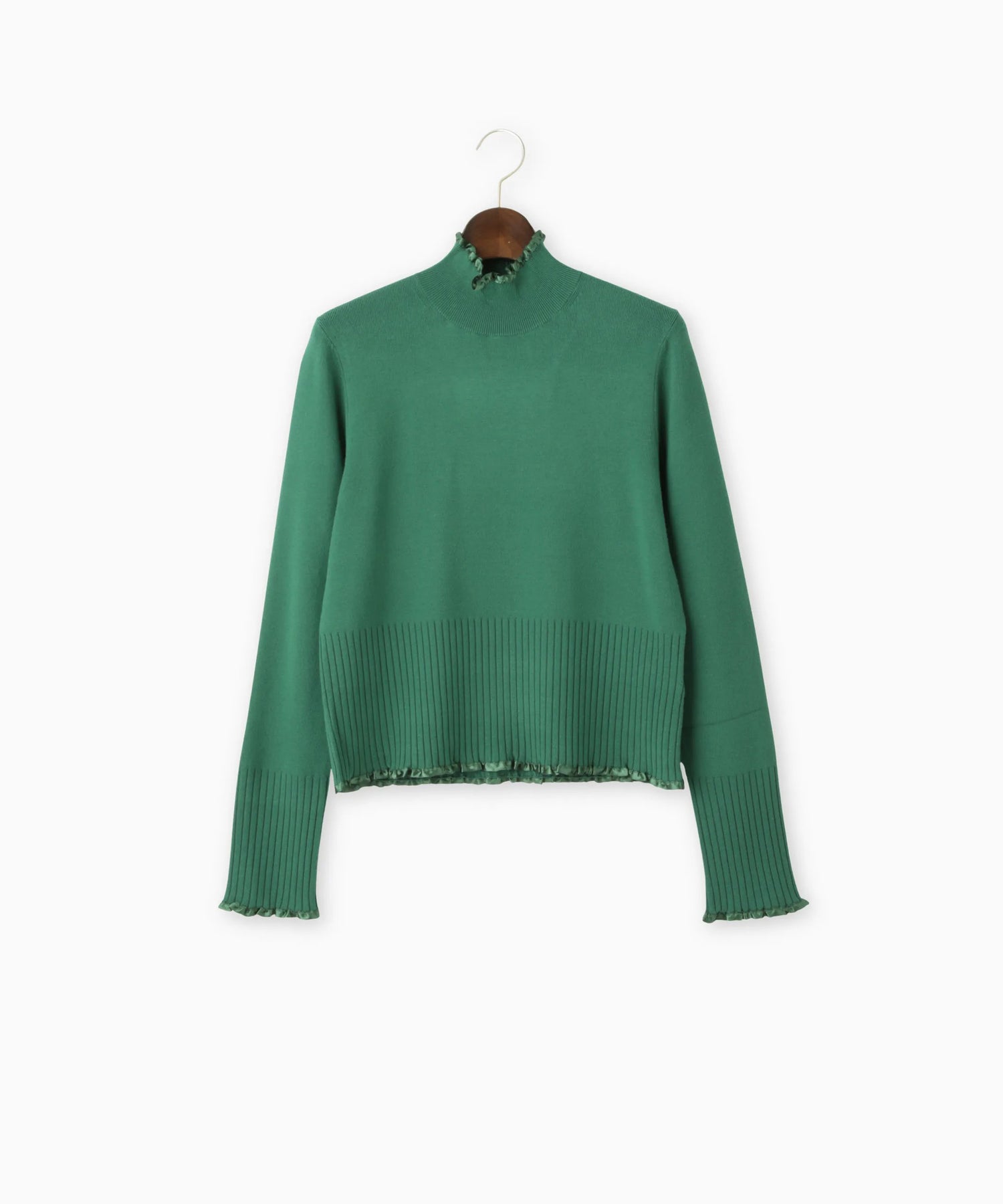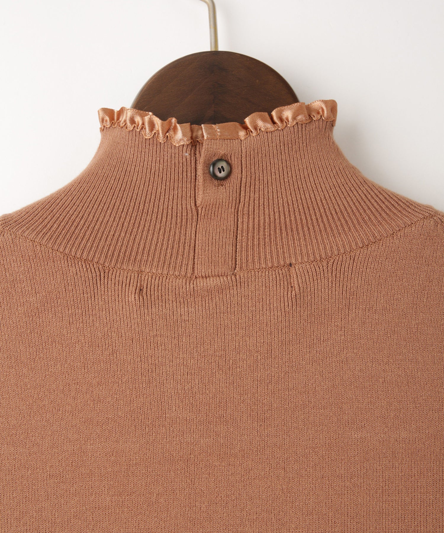 さり気ないサテンテープフリルが上品で大人のフェミニンさを演出するニット。