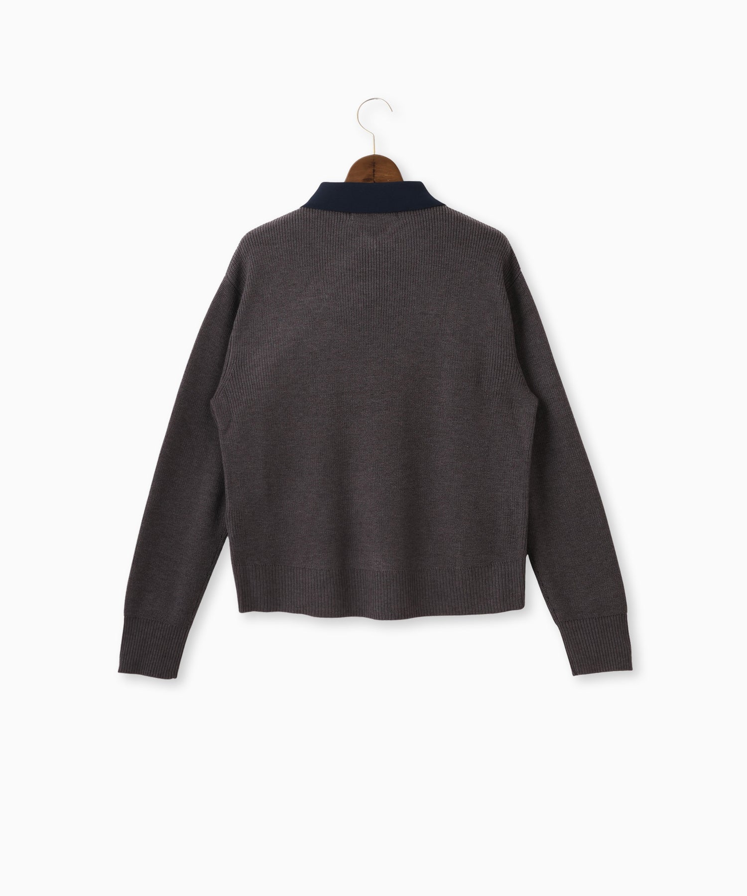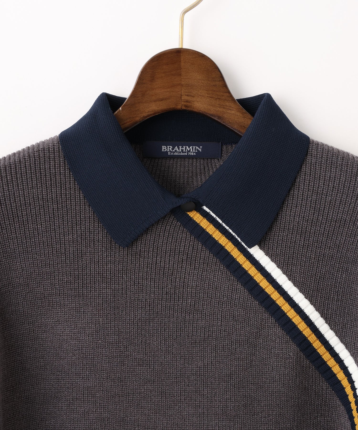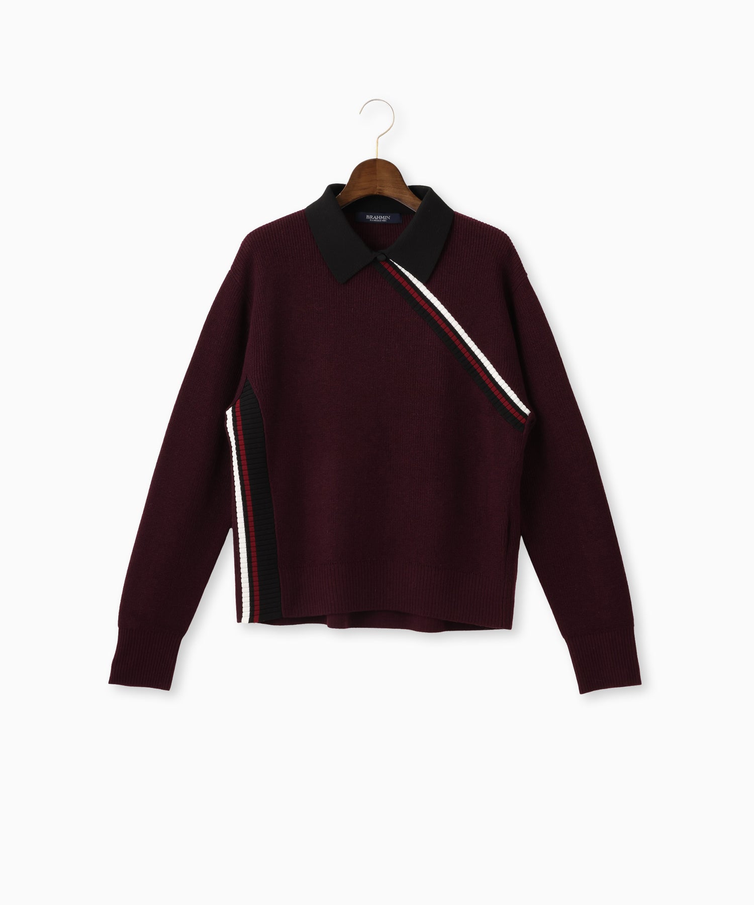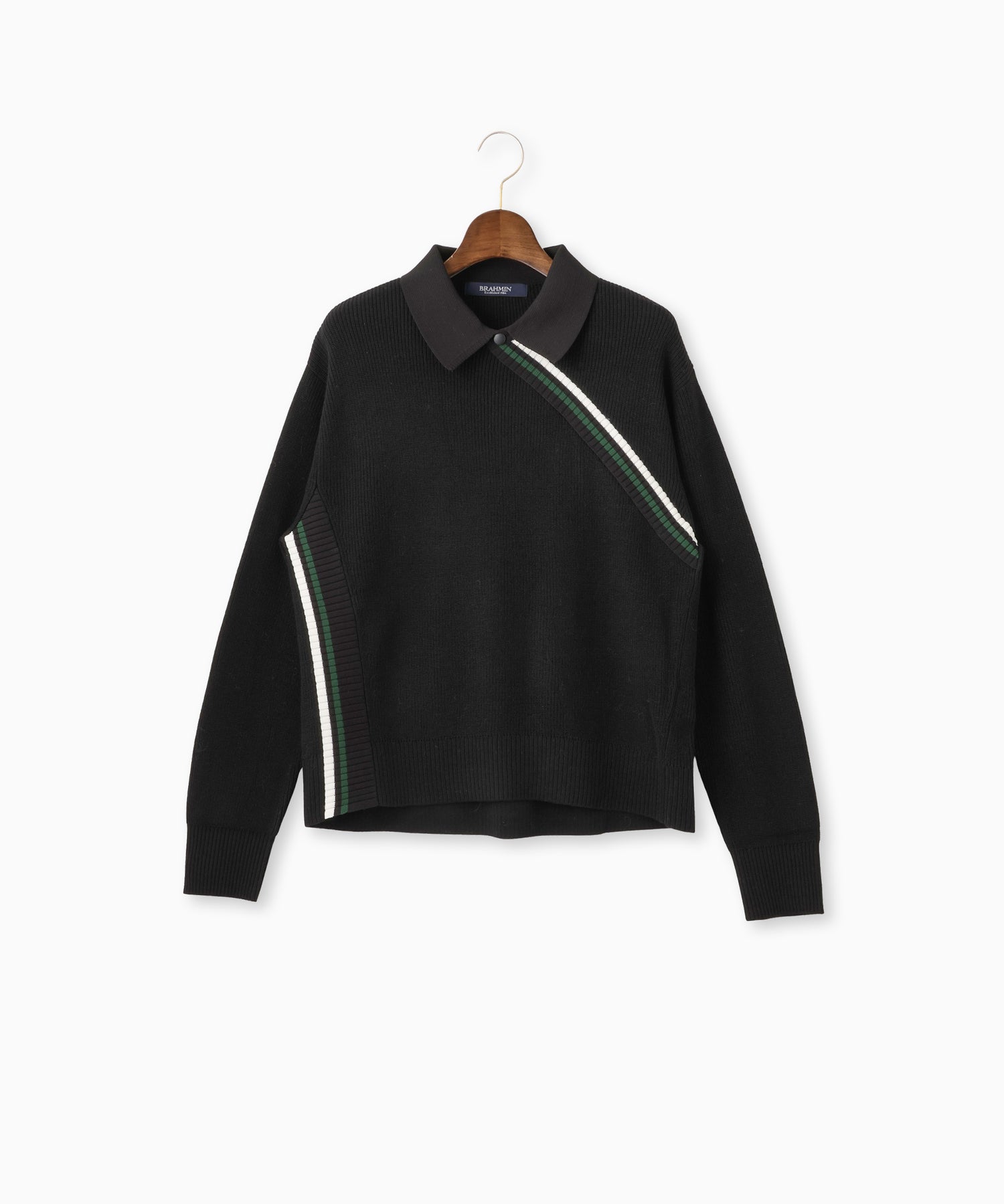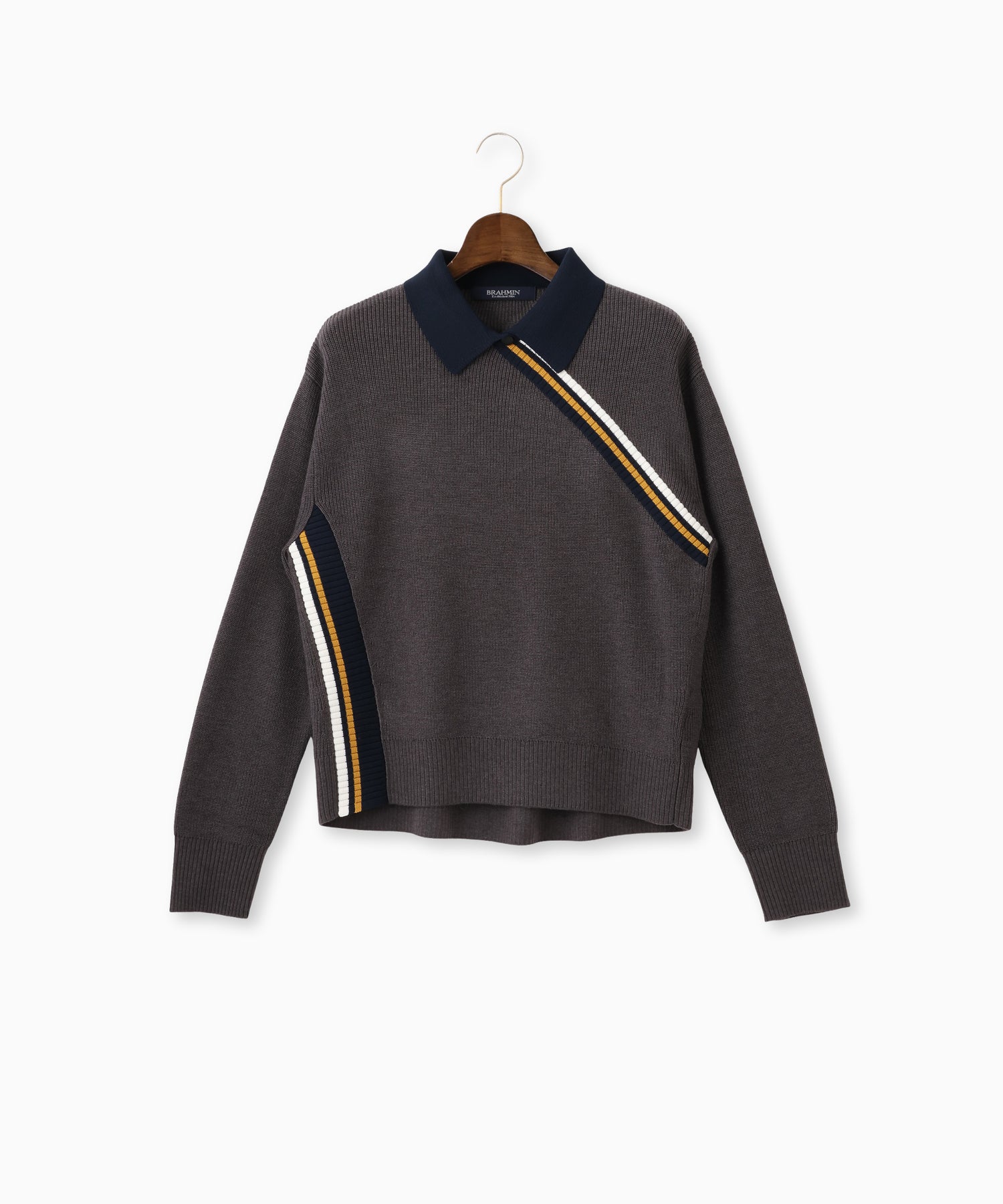 カラーライン使いがアクセントのトレンド感ある衿付きニット。