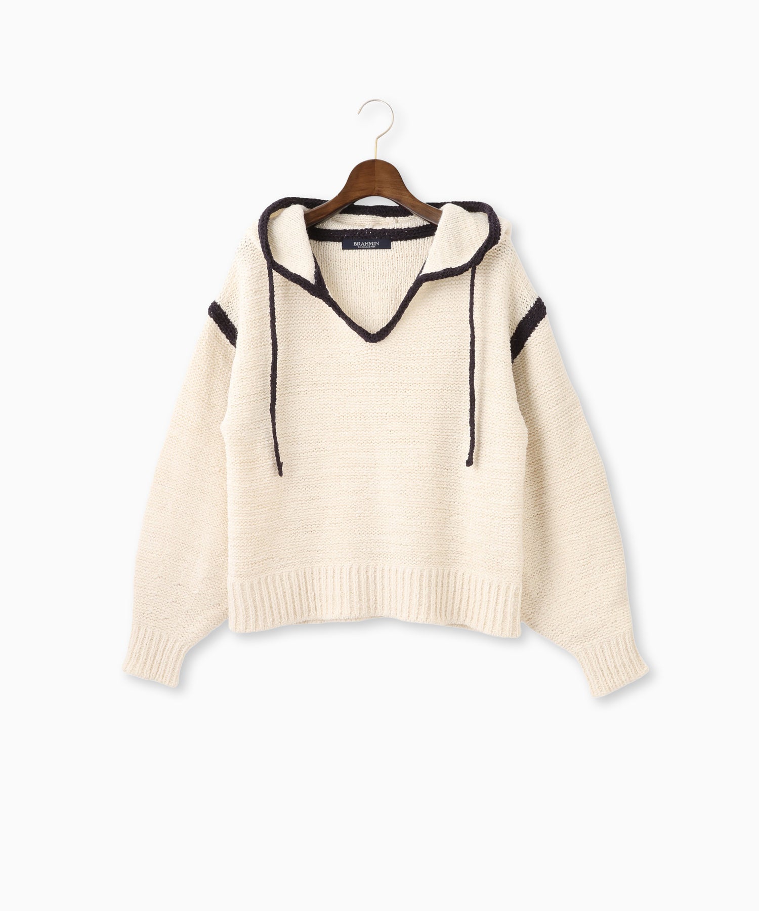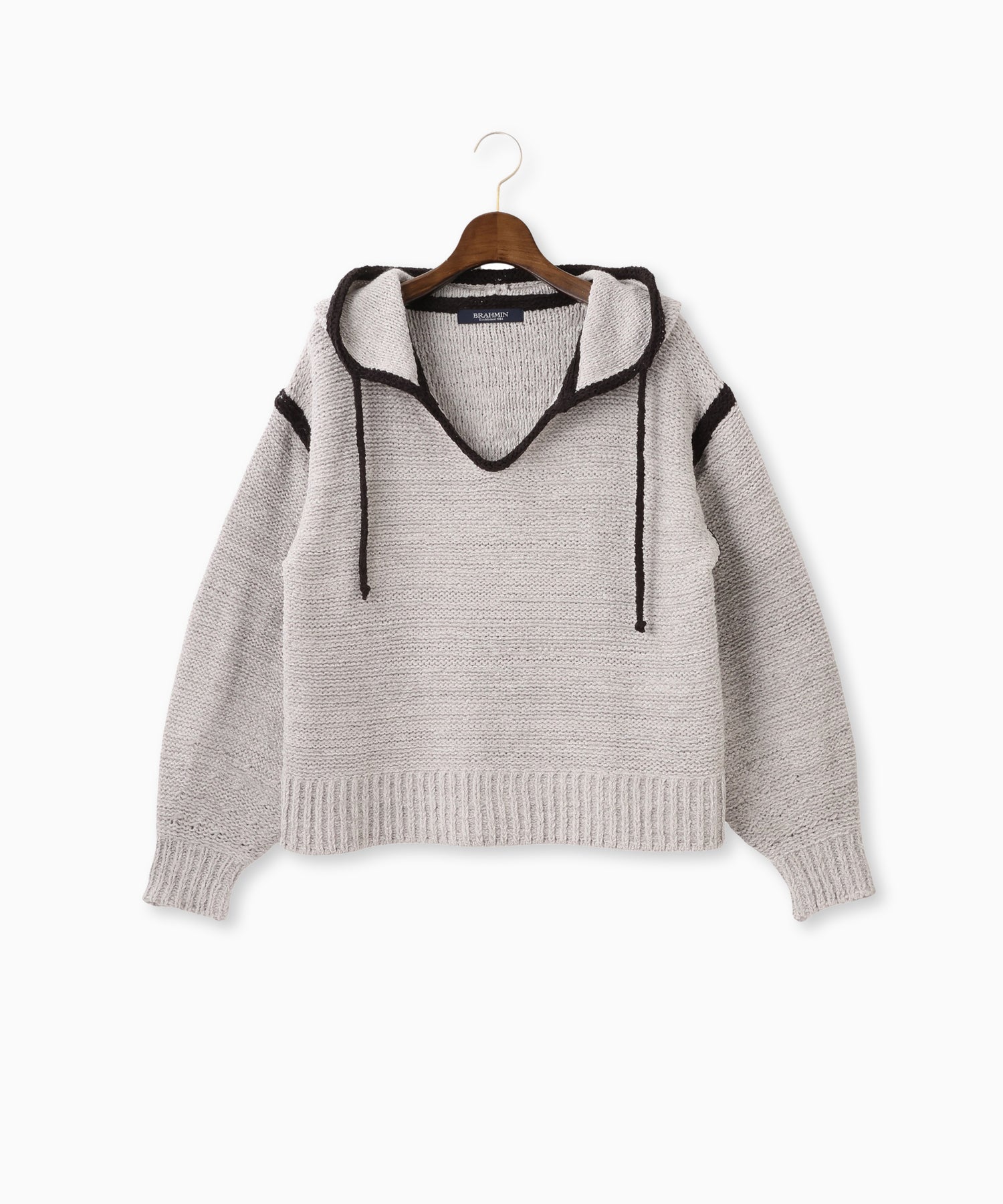 軽やかな素材感で暖冬シーズンにも快適に着られる、フード付きプルオーバーニット。