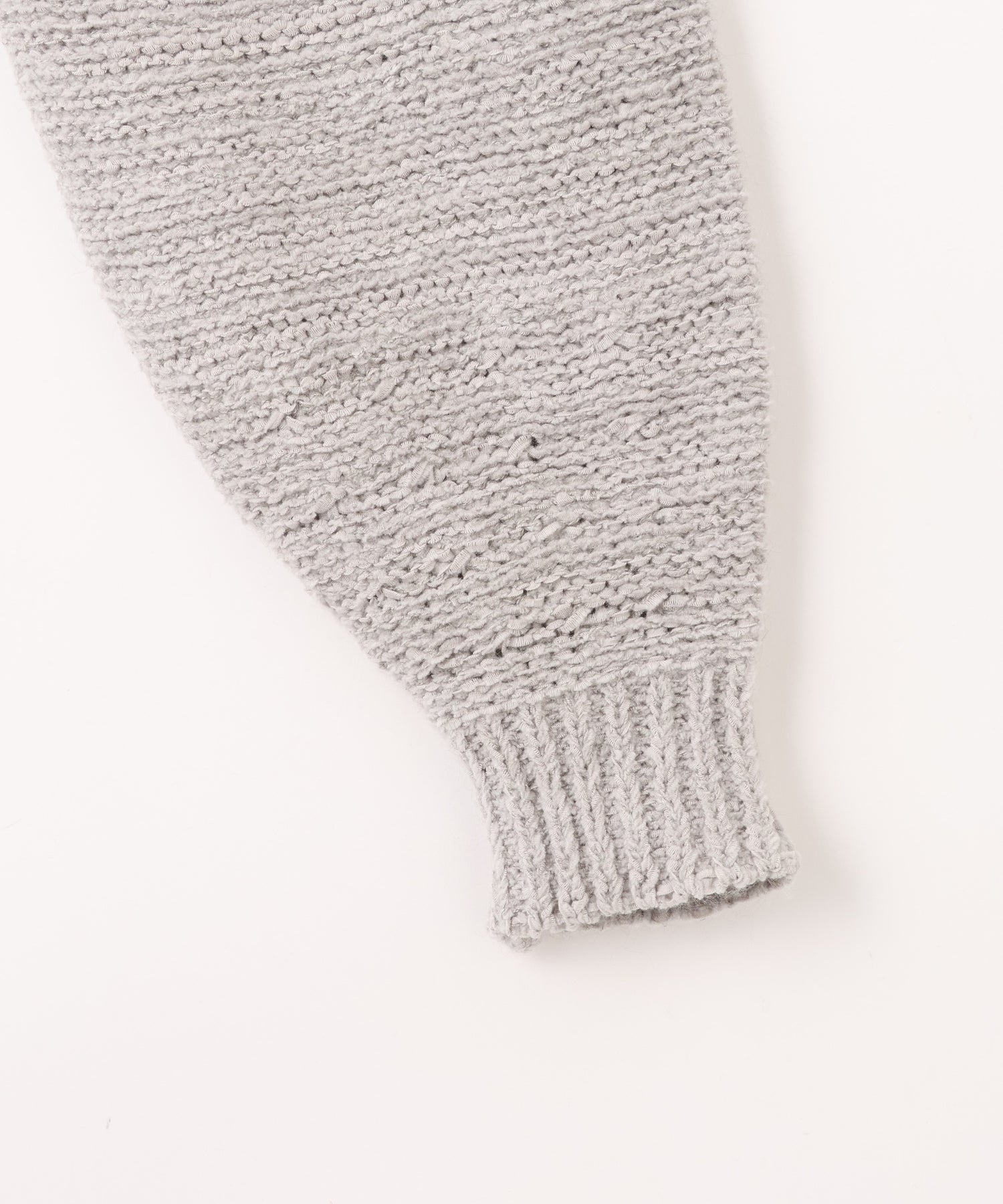 モールのテープヤーンにモヘア混の毛羽糸を引き揃えた軽やかな素材を使用。