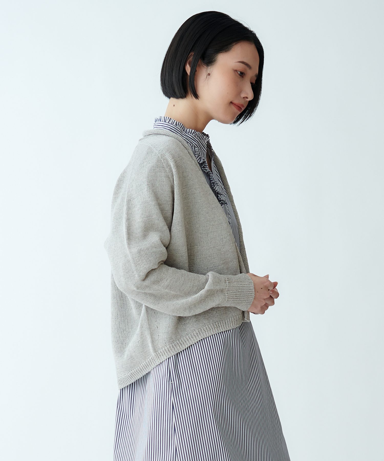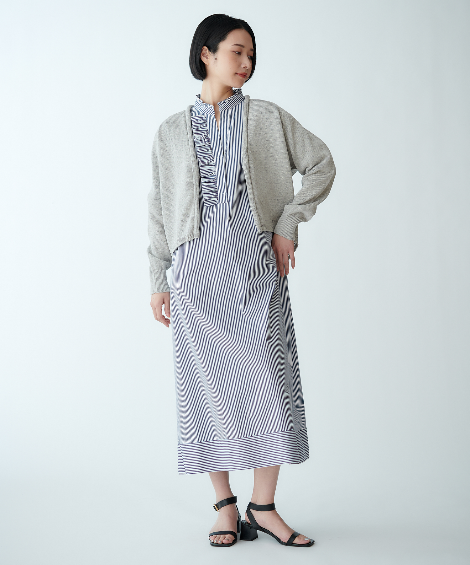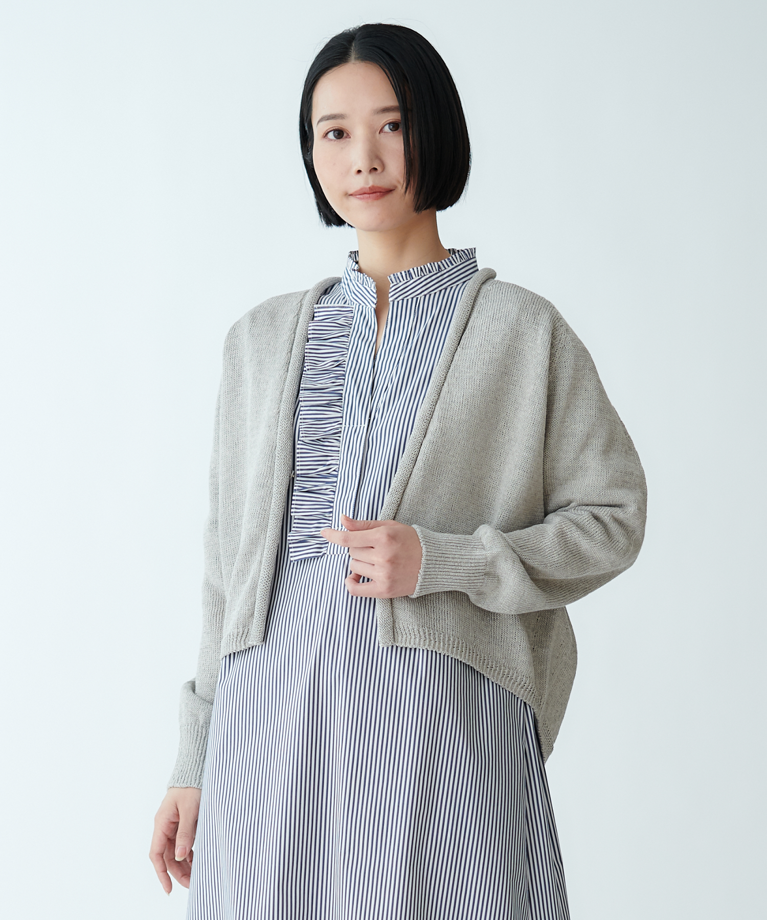 ボレロのようなコンパクトなカーディガンは、短め丈でさまざまなスタイリングに活躍。