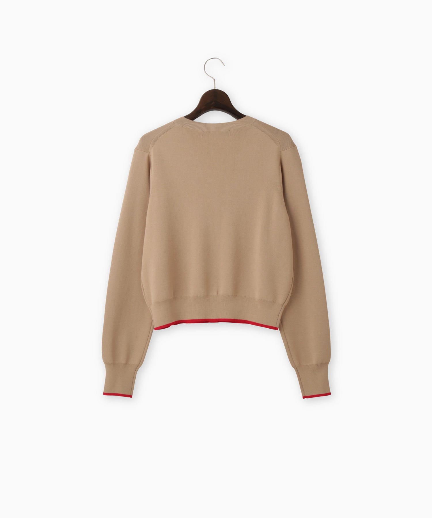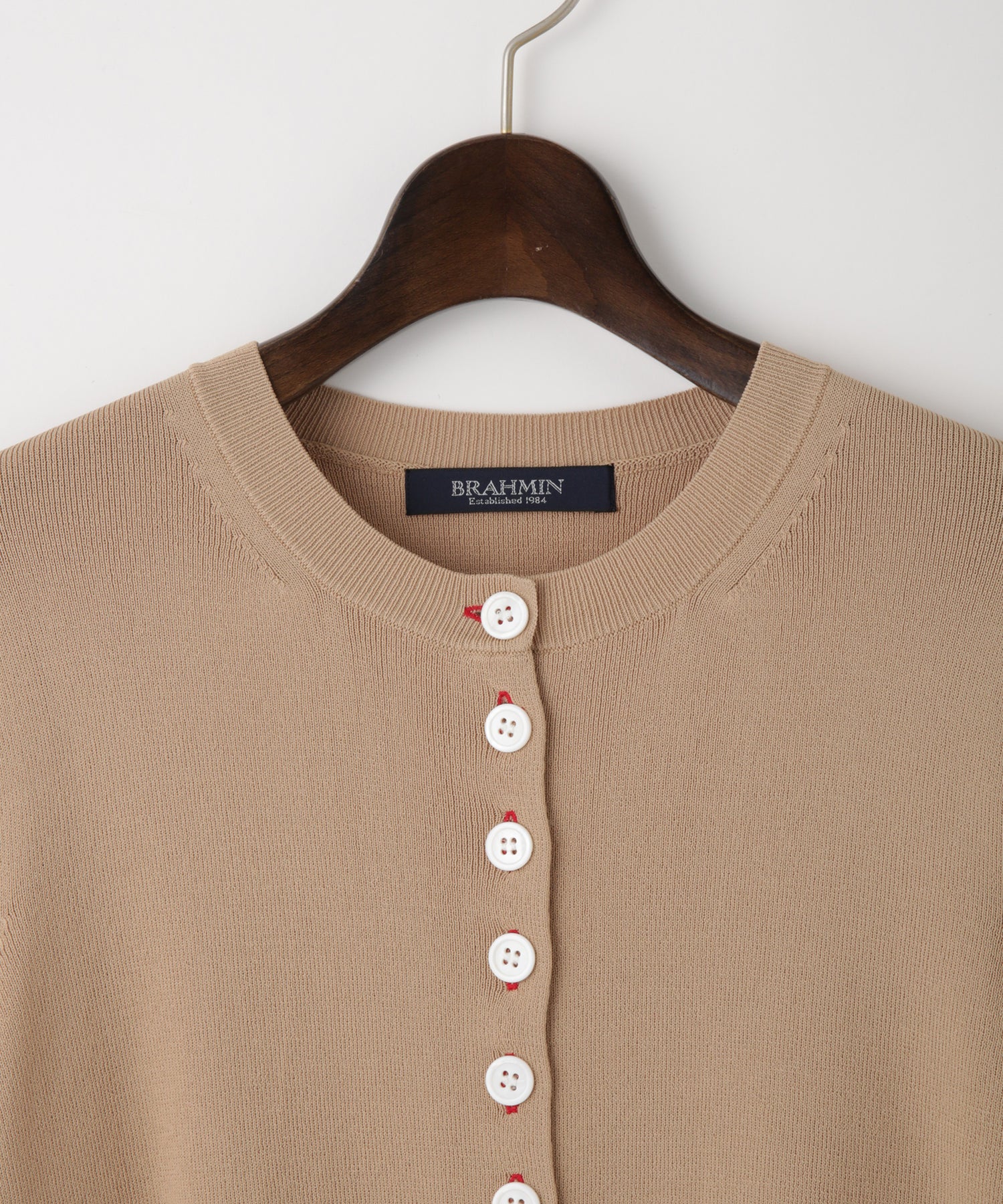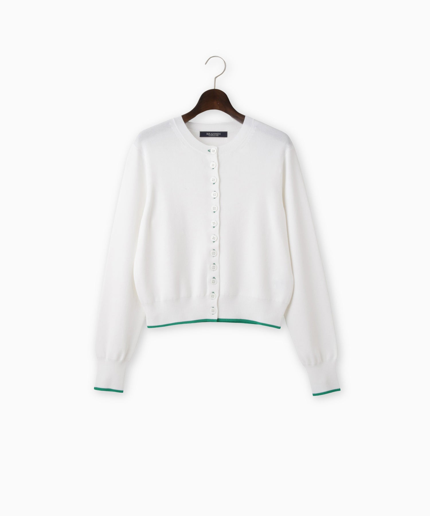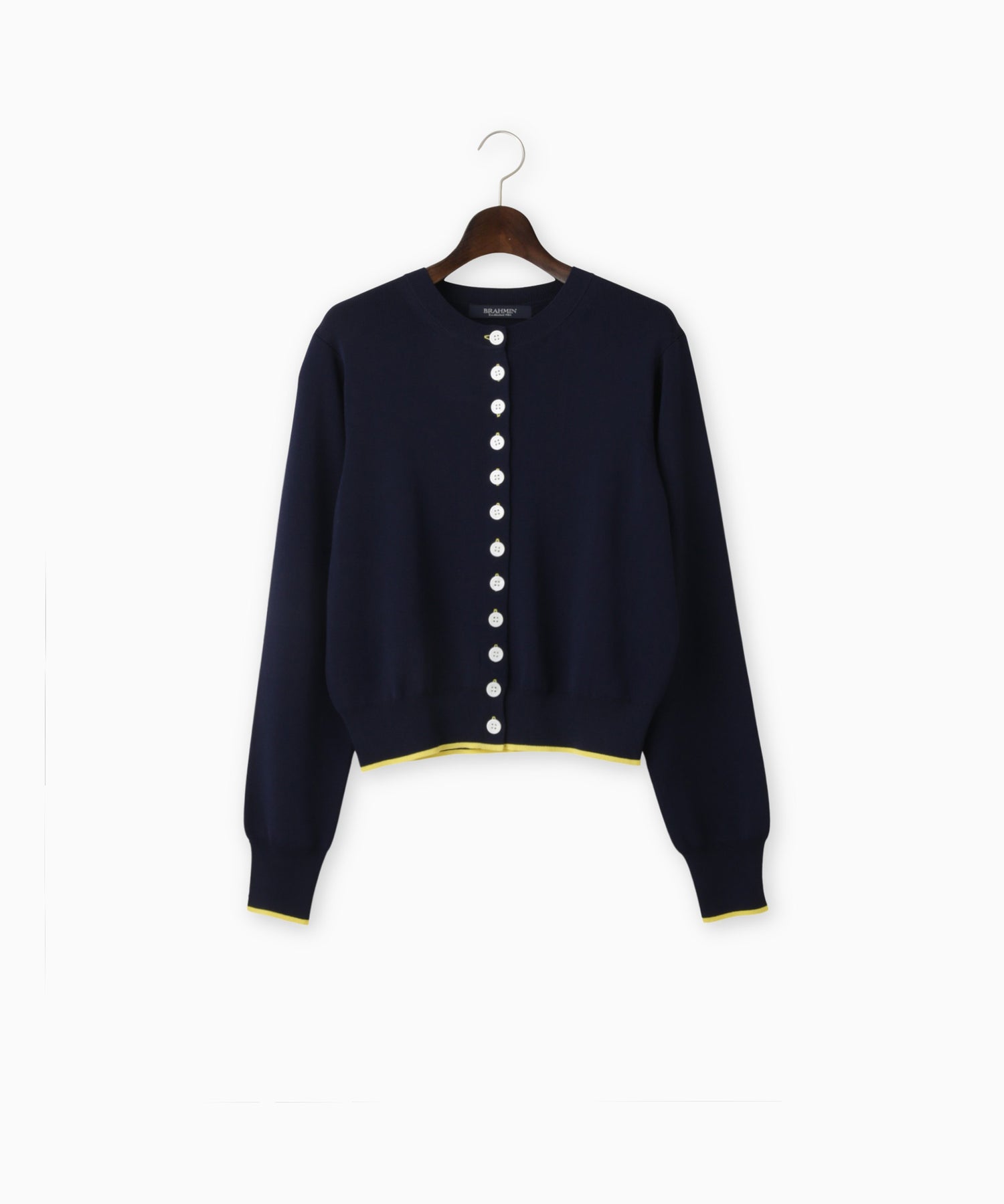 配色のボタンホールがさりげないアクセントのニットカーディガン。