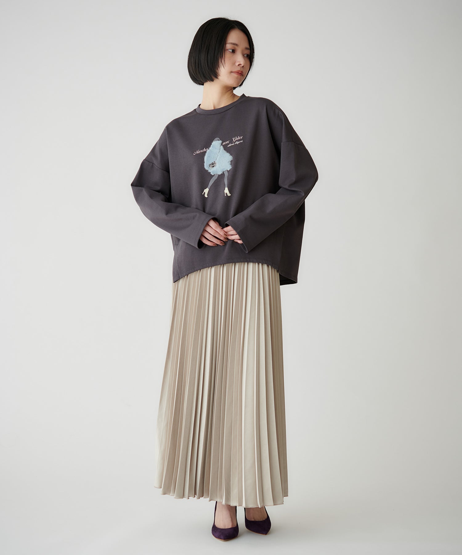 スカートの上品な光沢感と美しいプリーツを主役に、シンプルなニットやカットソーを合わせるのがおすすめです。