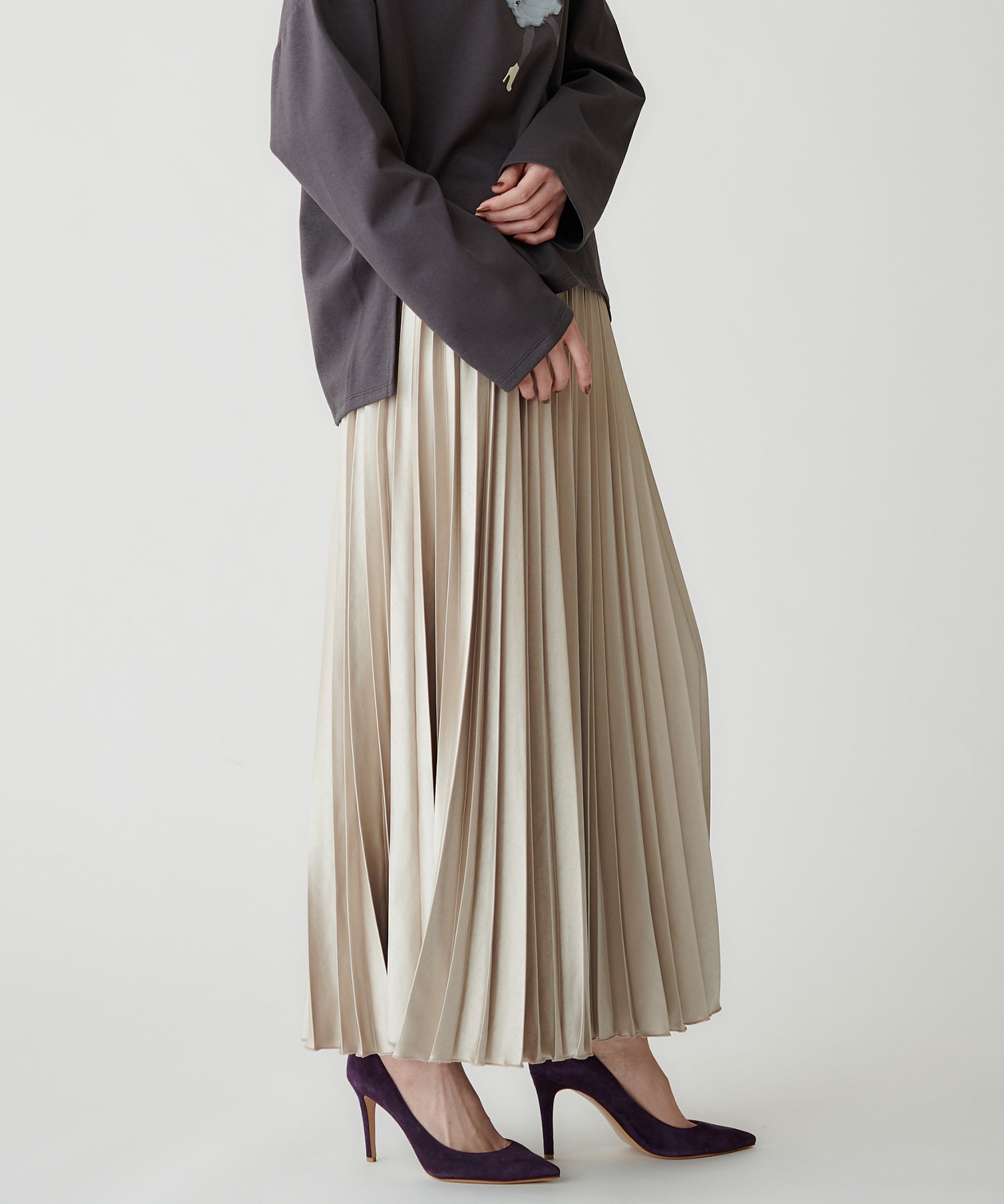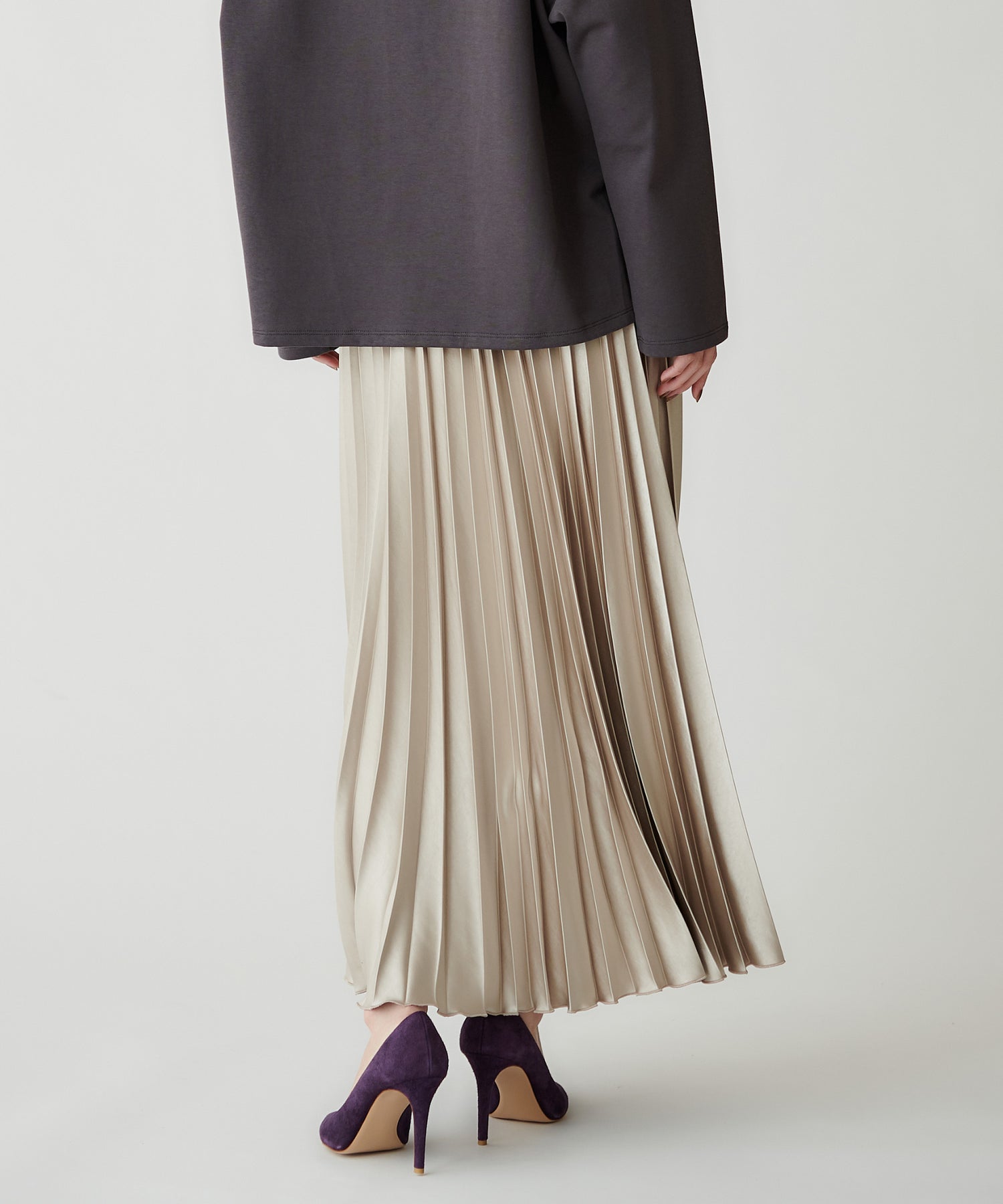 上品なツヤ感を持つサテン素材で、ドレープ性が高く、プリーツのひだが美しく揺れます。