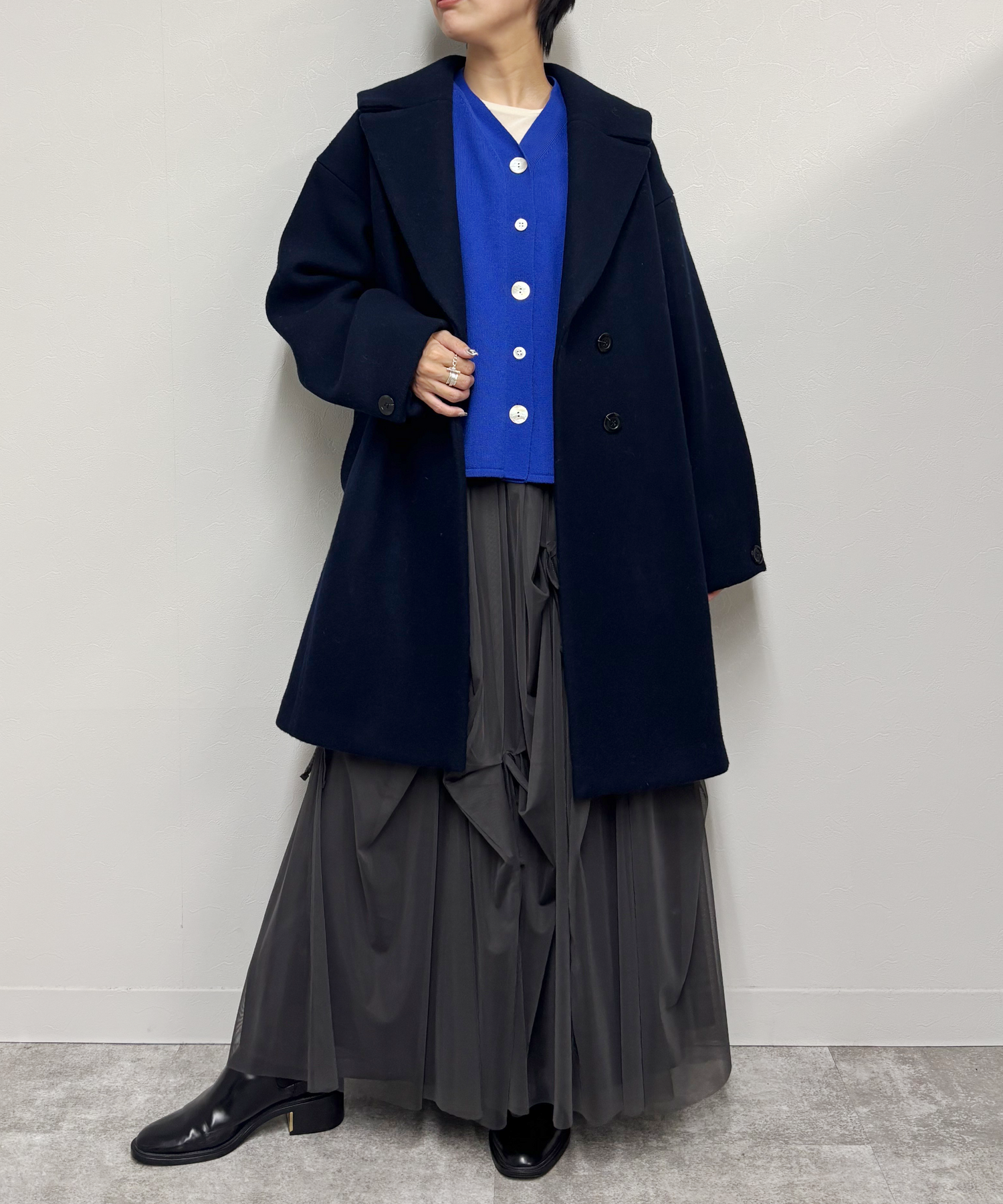 丸衿やタックディテールを活かし、ワンピースやスカートなどフェミニンなアイテムと好相性。