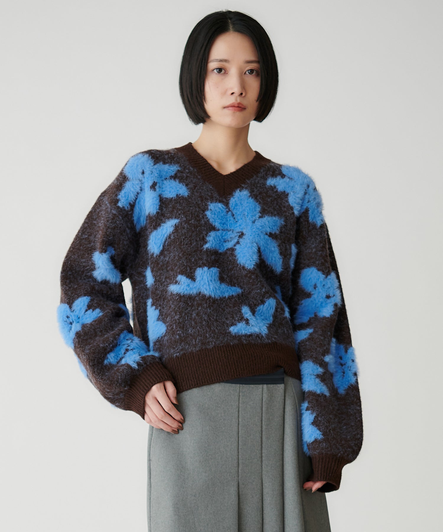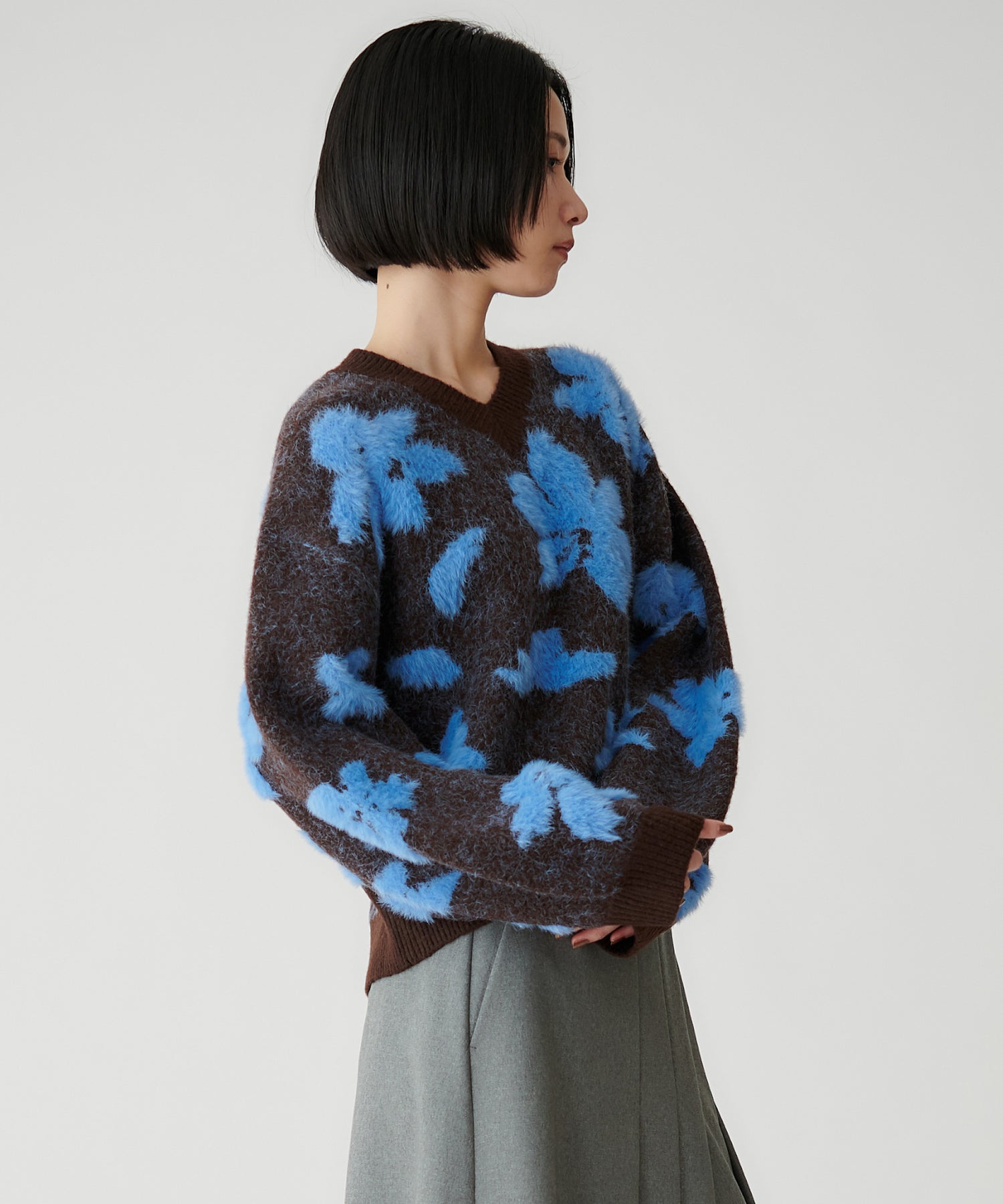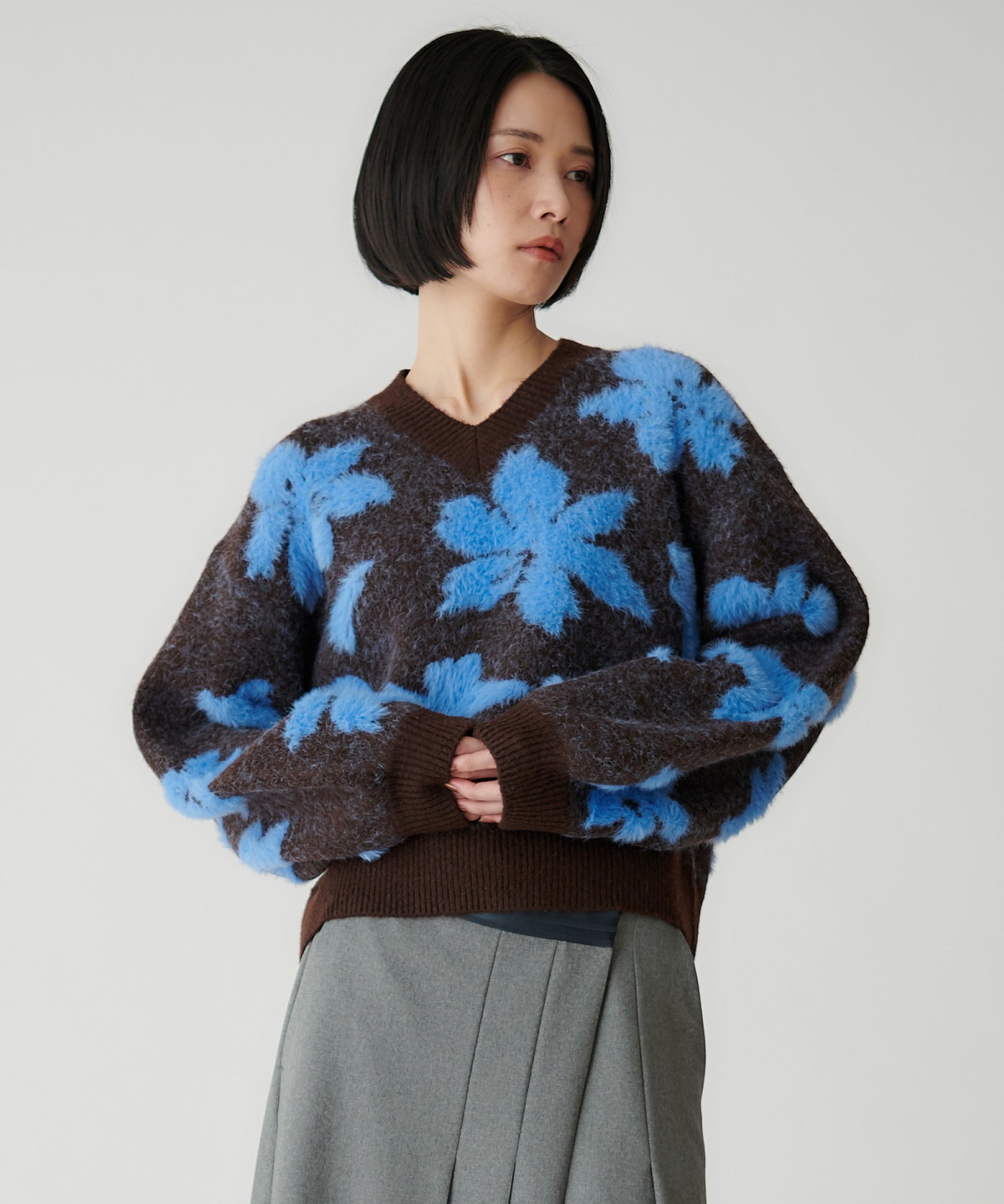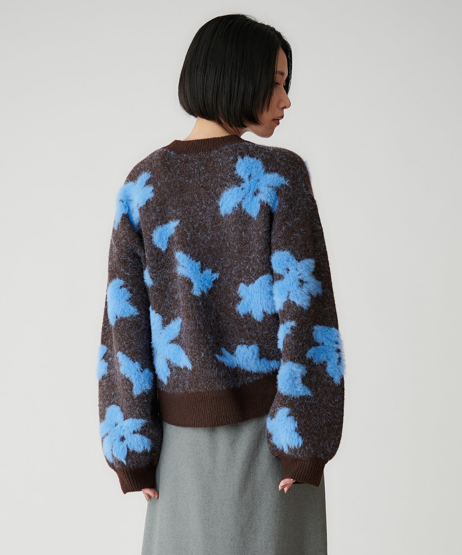 大きめな花柄を毛足のあるフェザーヤーンで表現したジャガードニット。
