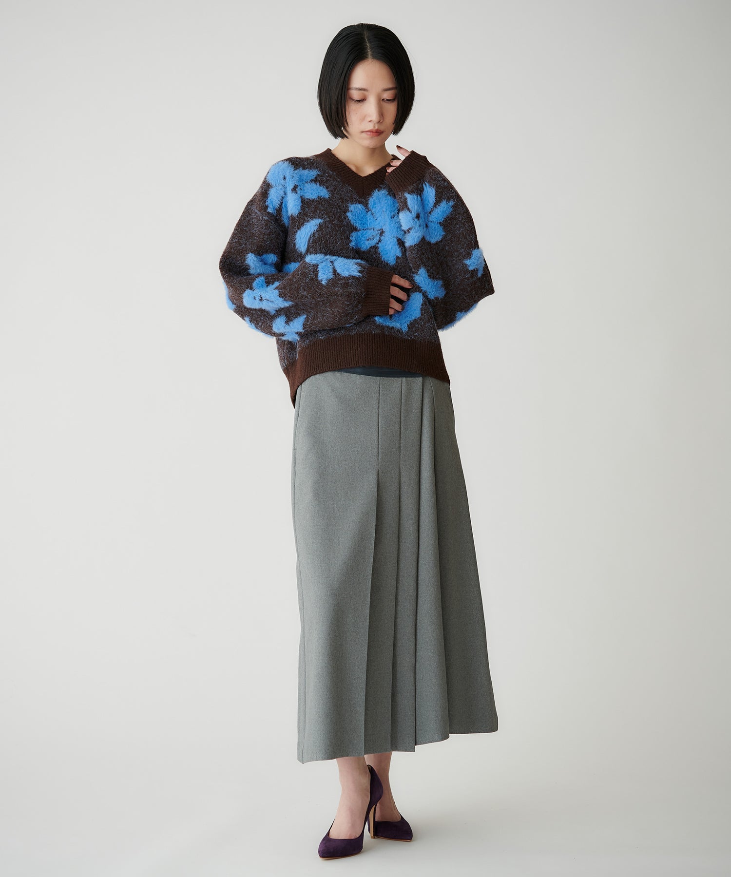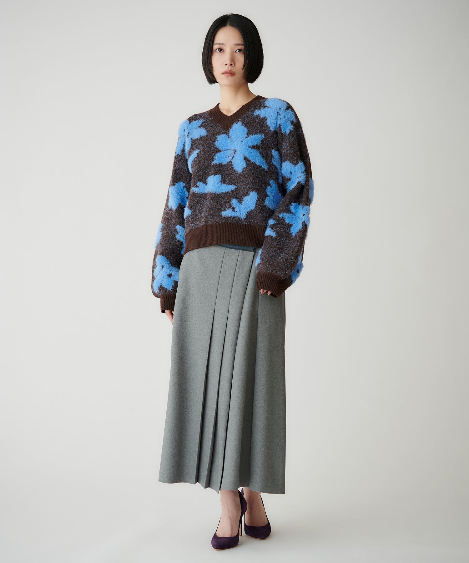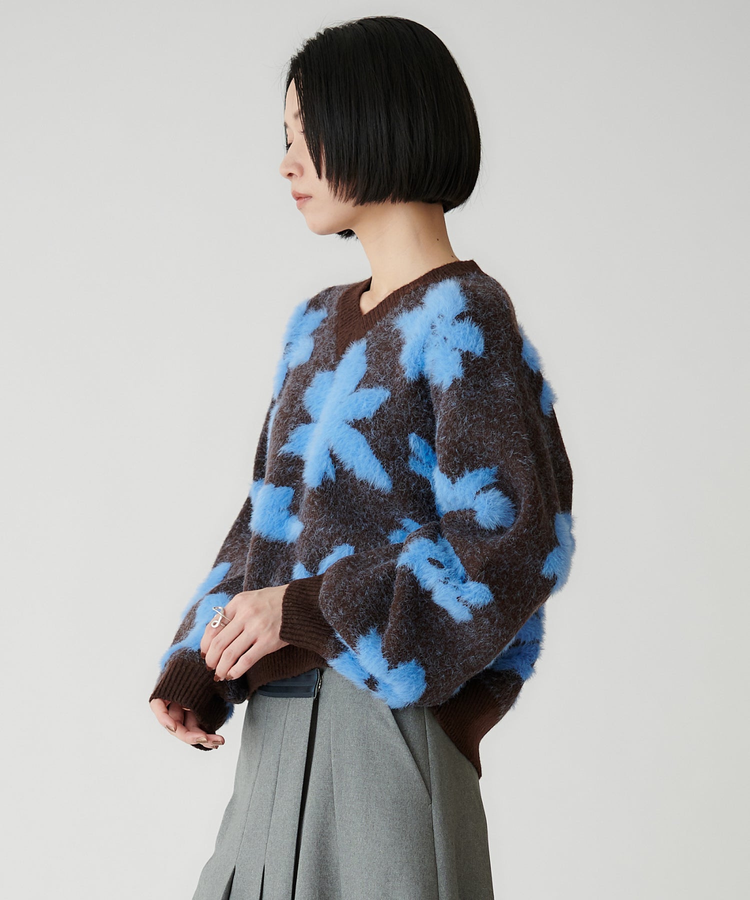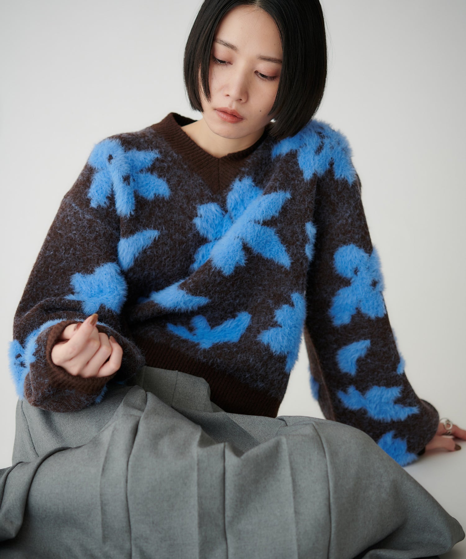 大きめな花柄を毛足のあるフェザーヤーンで表現したジャガードニット。