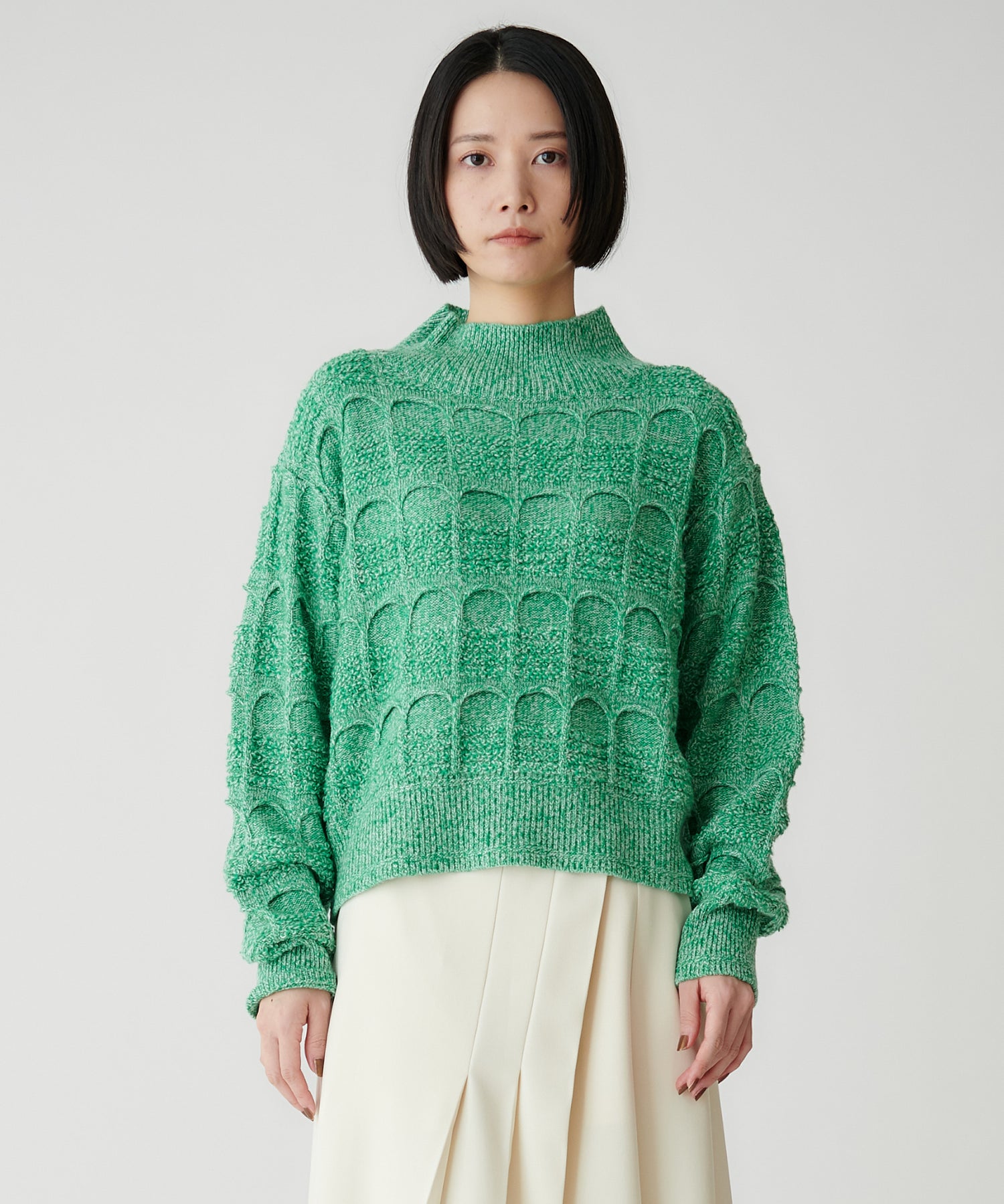 アーチ柄の編み地を2色杢で表現した印象的なニット。