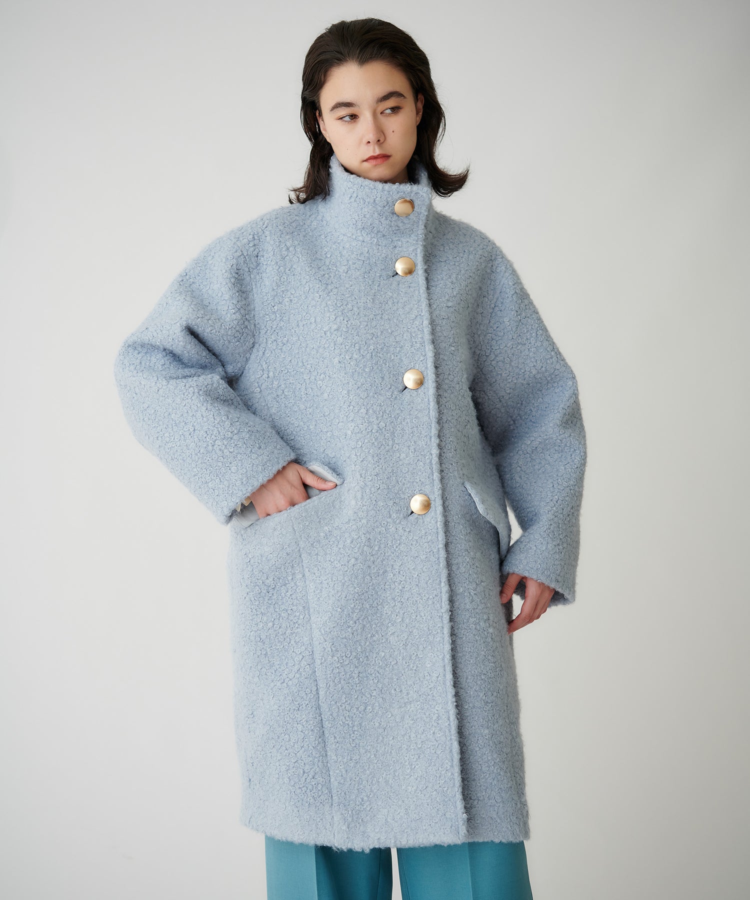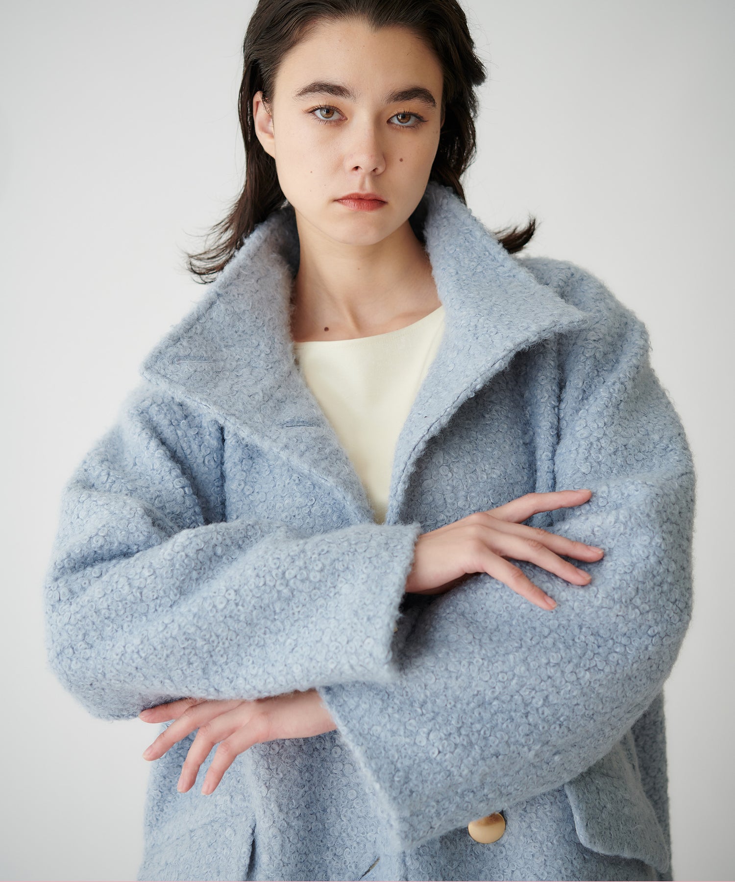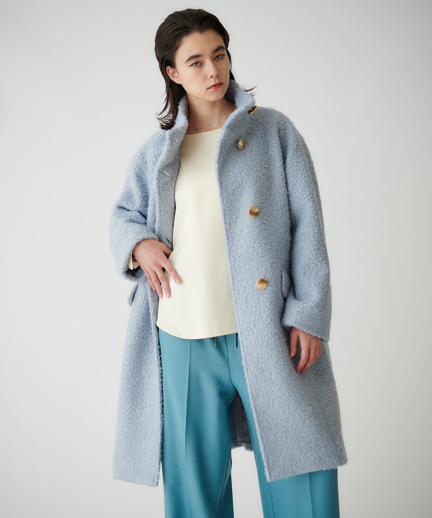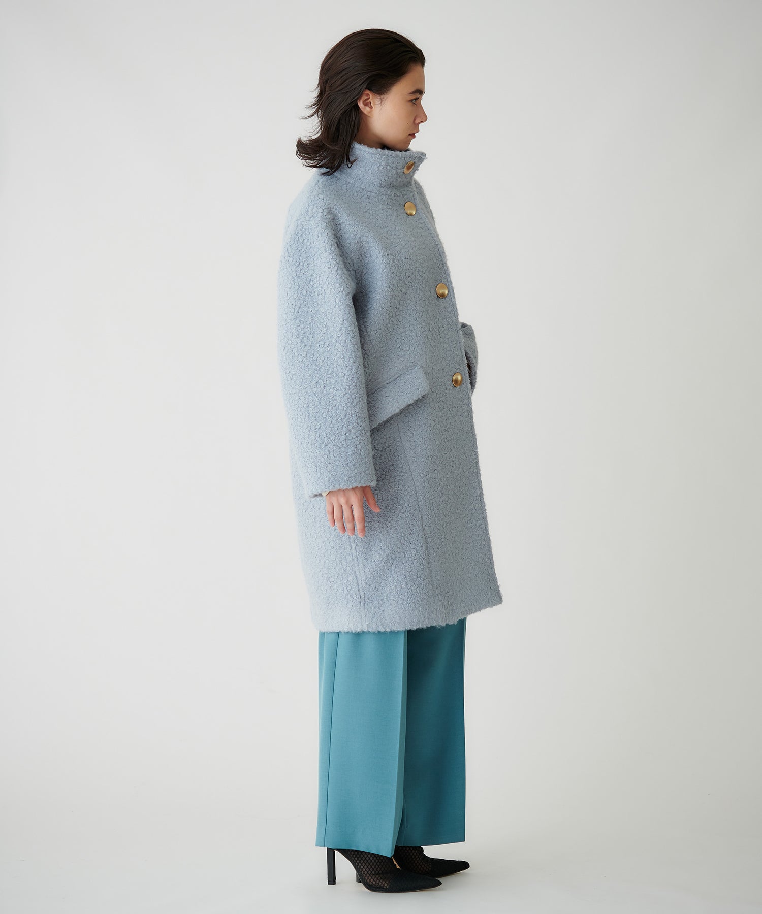丸みのあるフォルムが女性らしさを引き立てつつ、すっきりと立ち上がる首元が上品さをプラスします。ゴールドボタンがアクセントになり、シンプルな中に華やぎと存在感を添える一着です。
