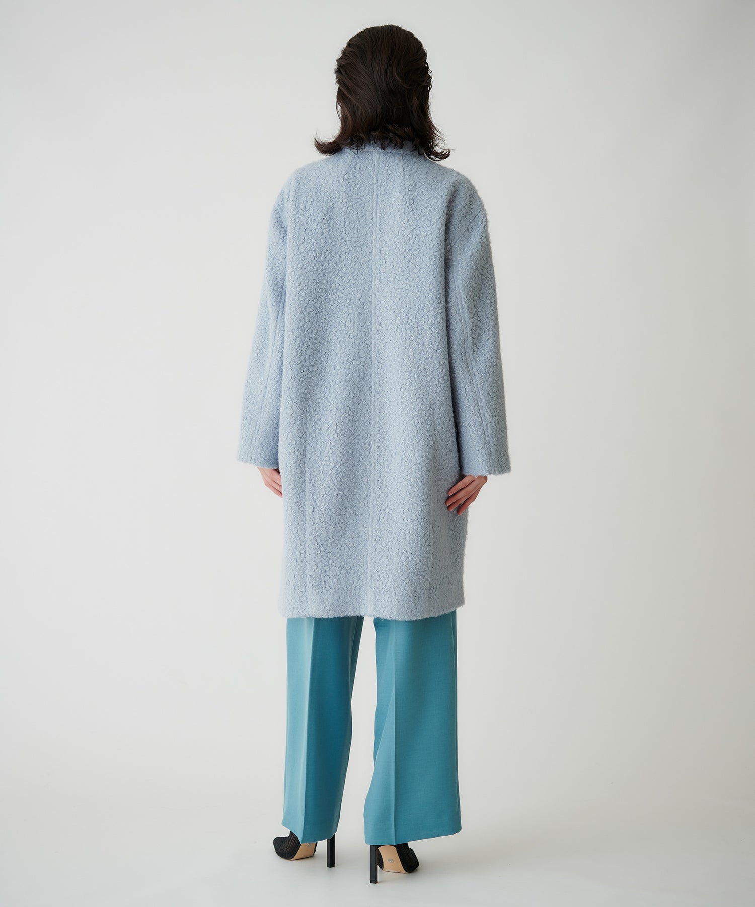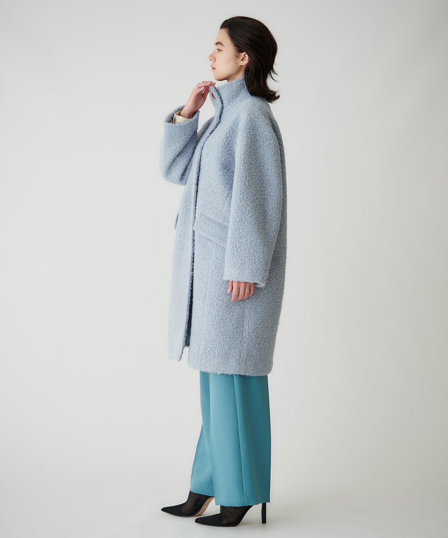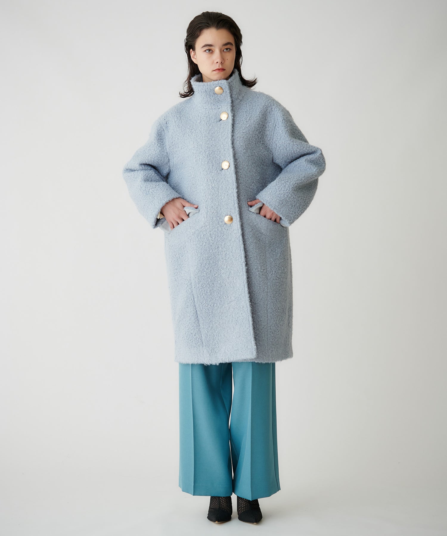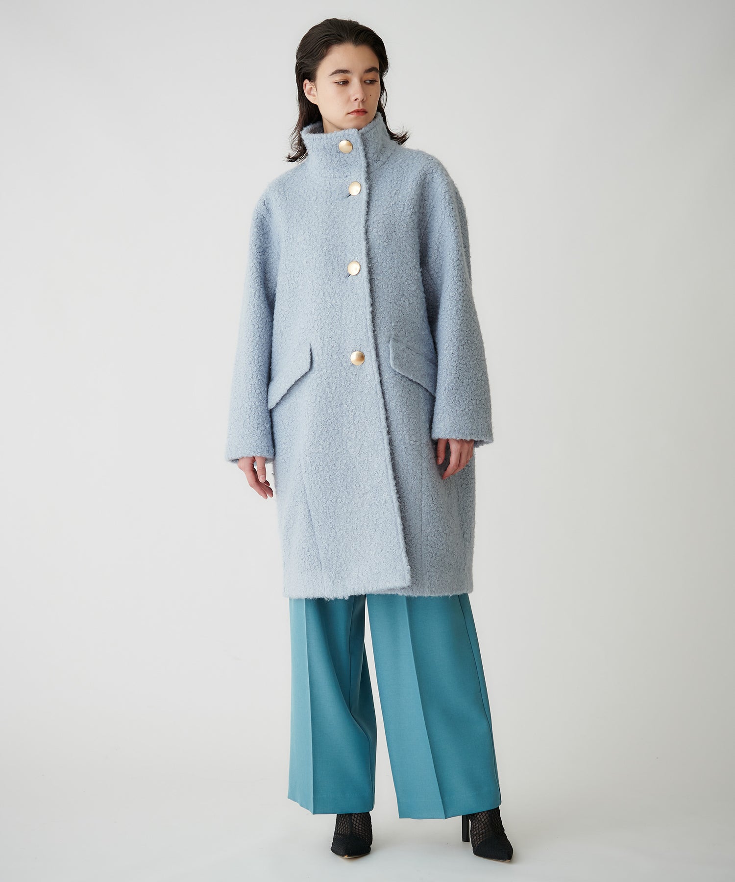 丸みのあるフォルムが女性らしさを引き立てつつ、すっきりと立ち上がる首元が上品さをプラスします。ゴールドボタンがアクセントになり、シンプルな中に華やぎと存在感を添える一着です。