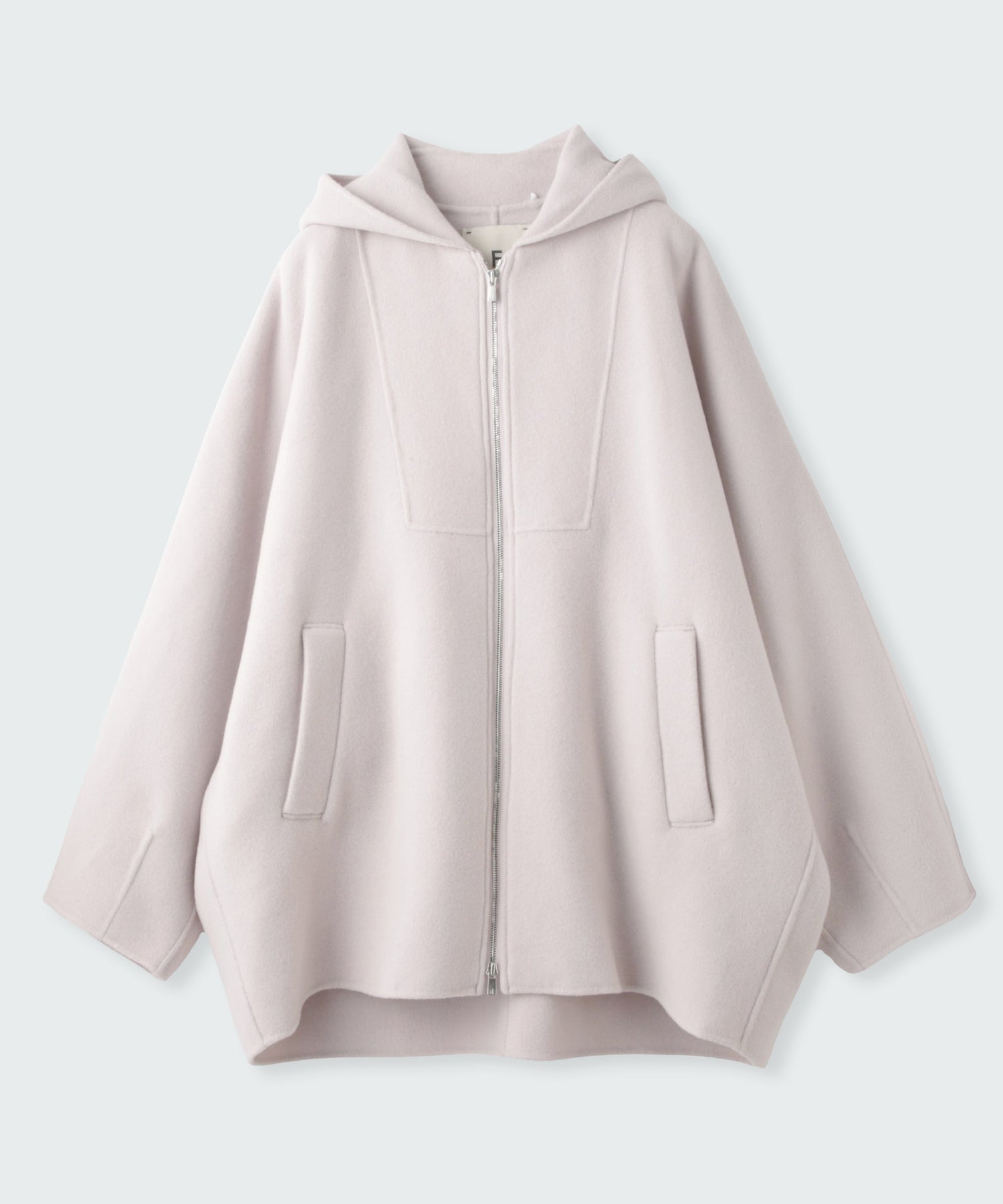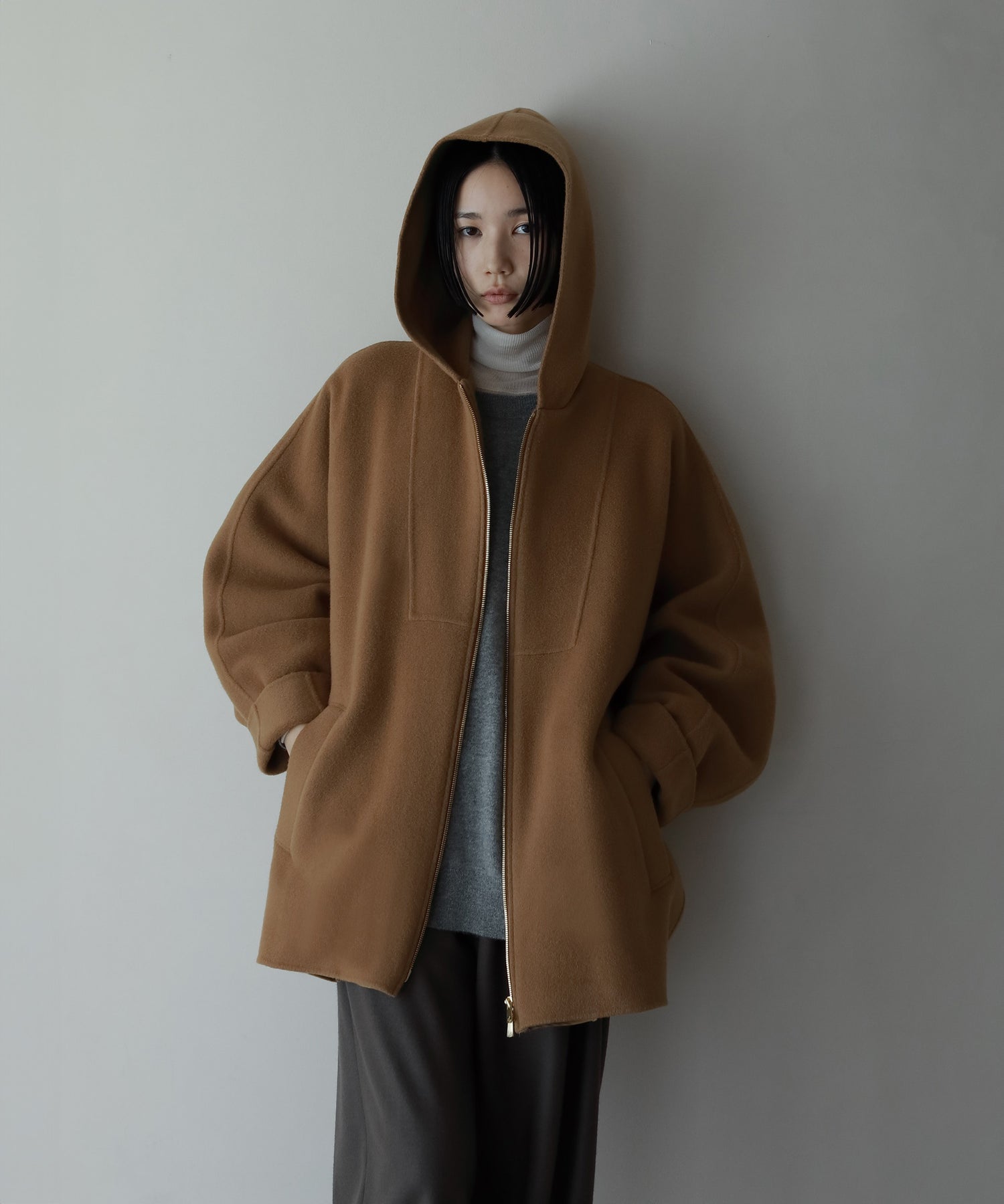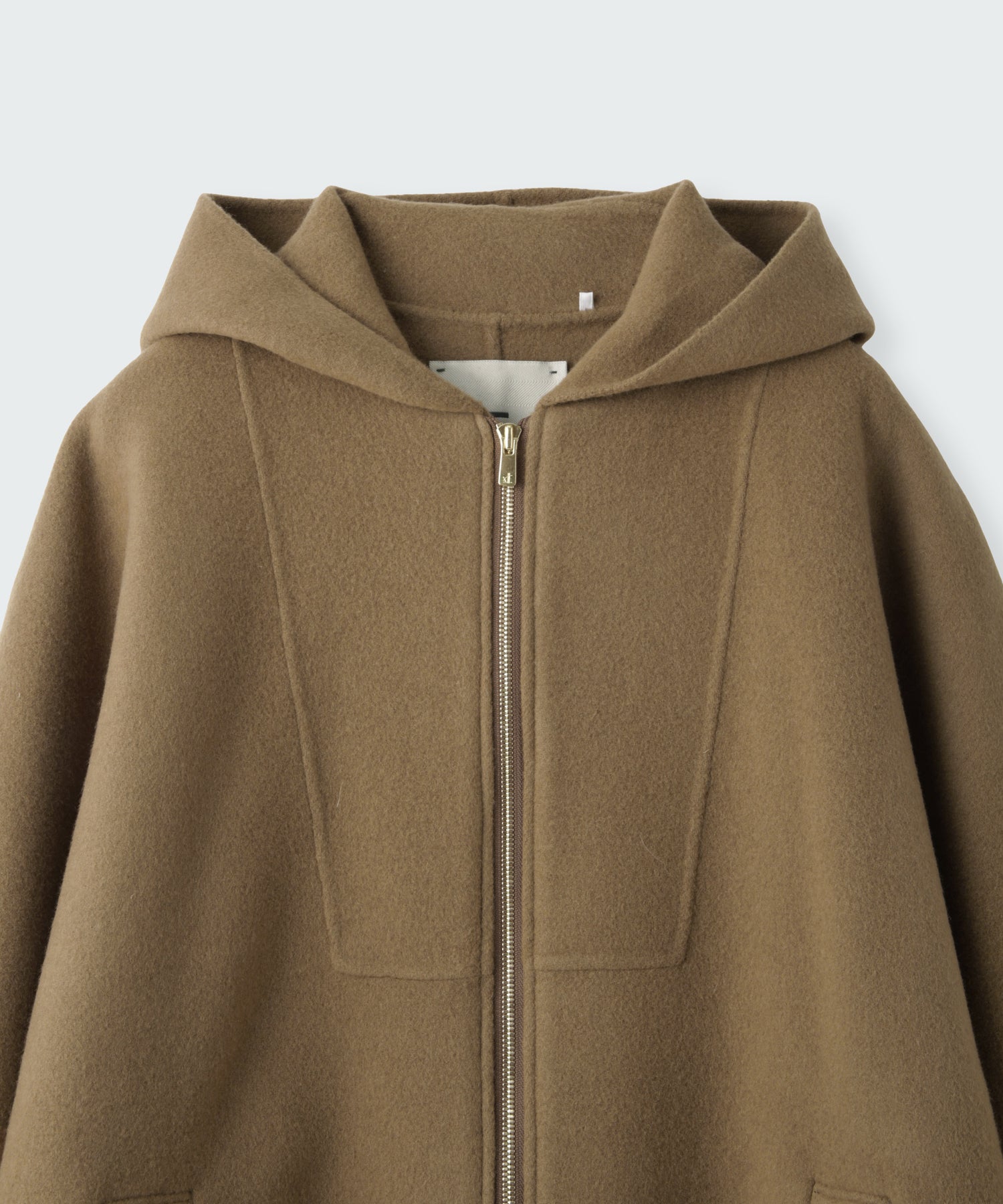 上質なメリノウールを使用し、二重織りと両面起毛で仕上げたフード付きジップアップジャケット。