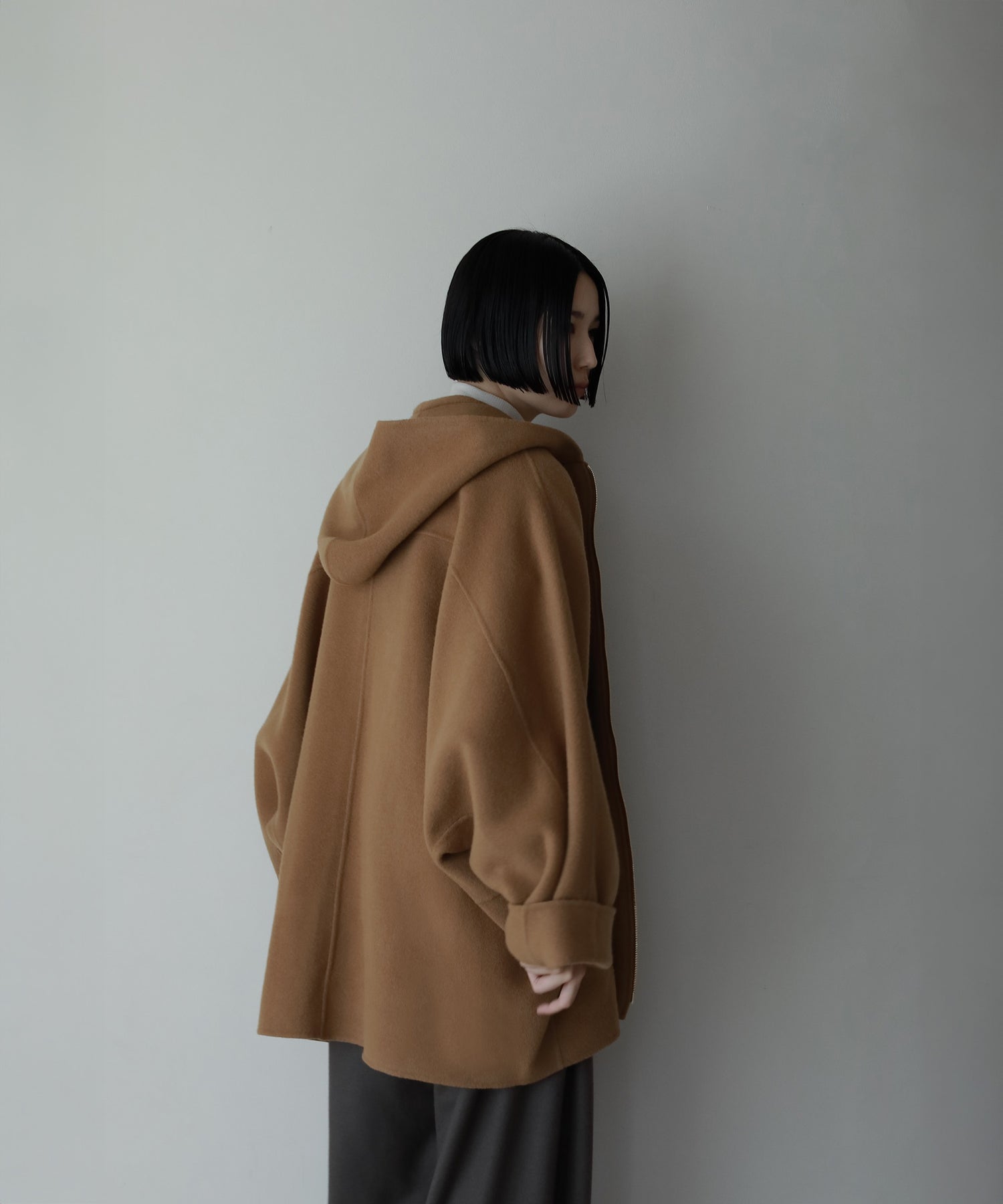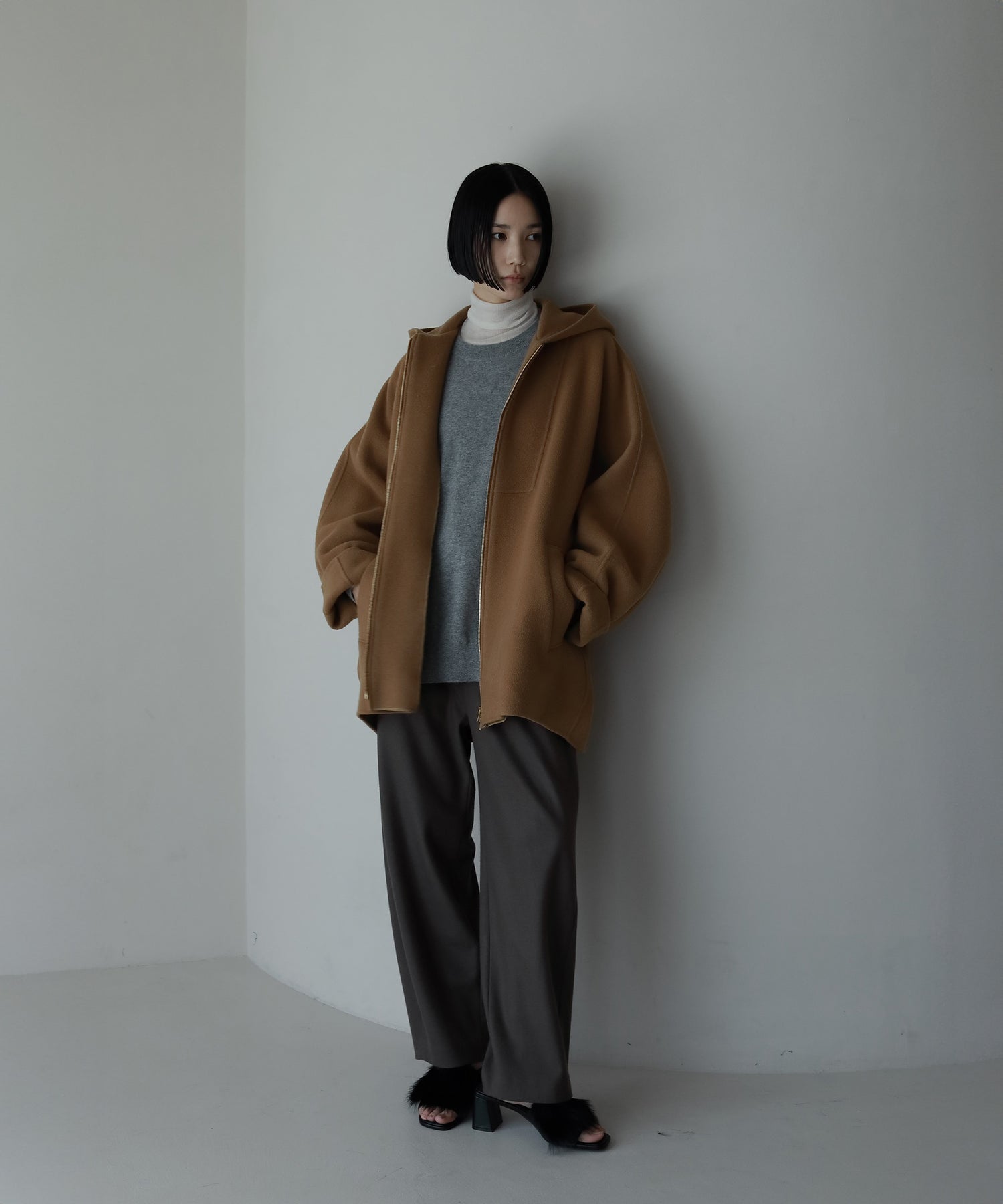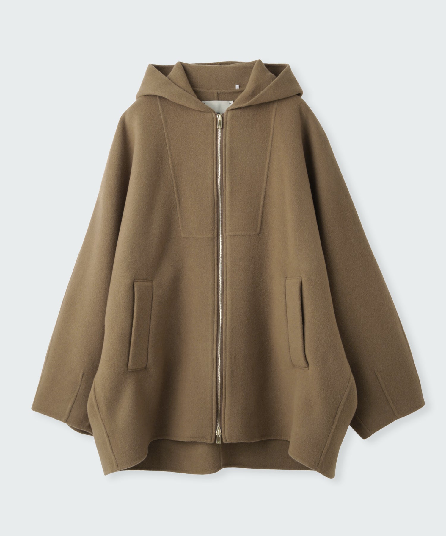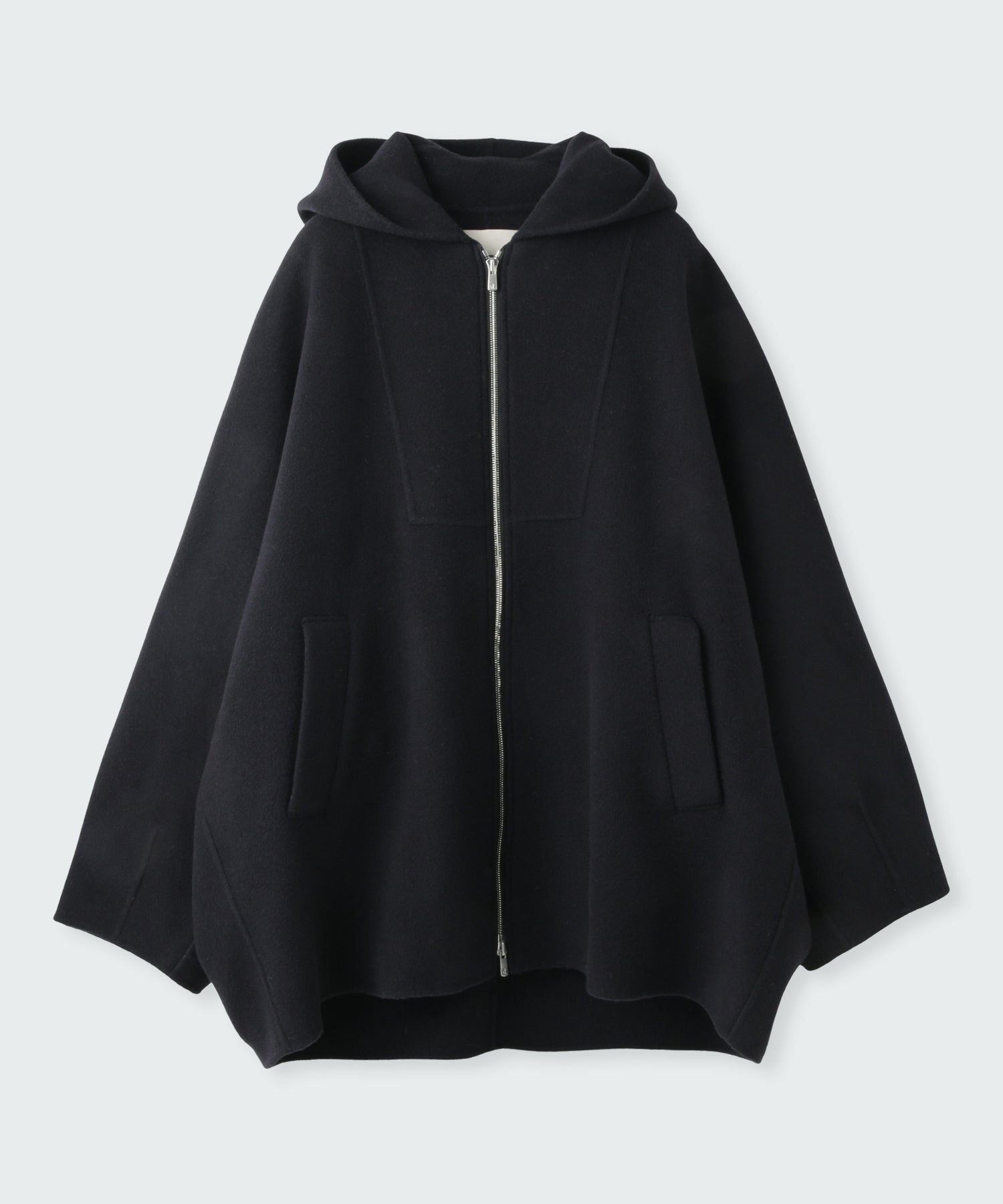 上質なメリノウールを使用し、二重織りと両面起毛で仕上げたフード付きジップアップジャケット。