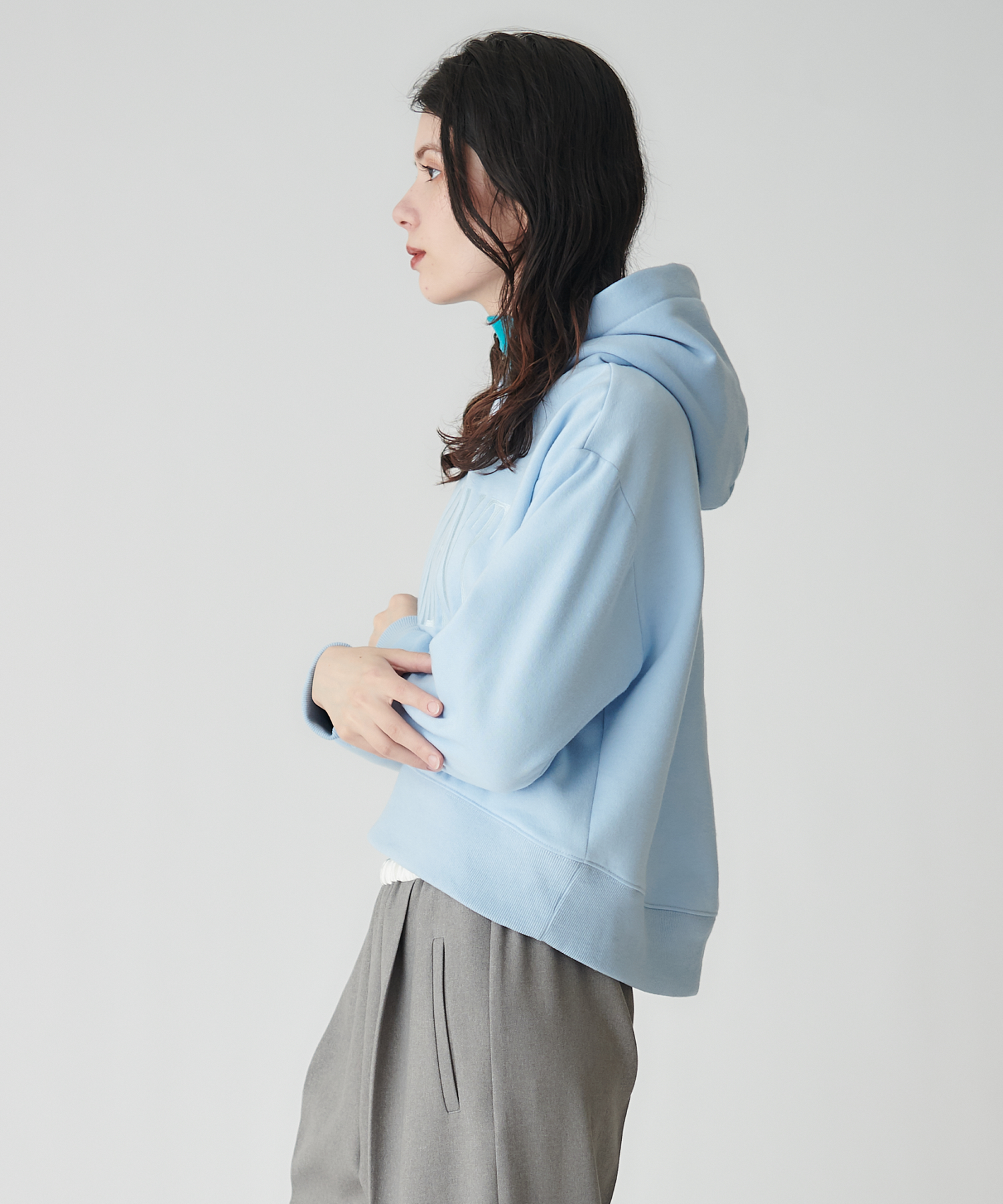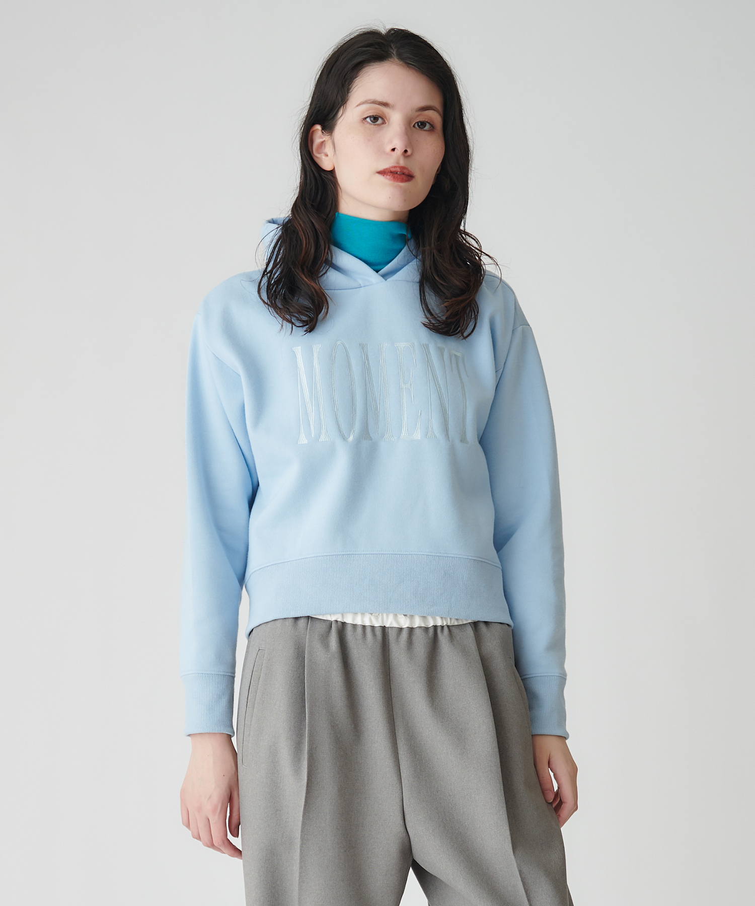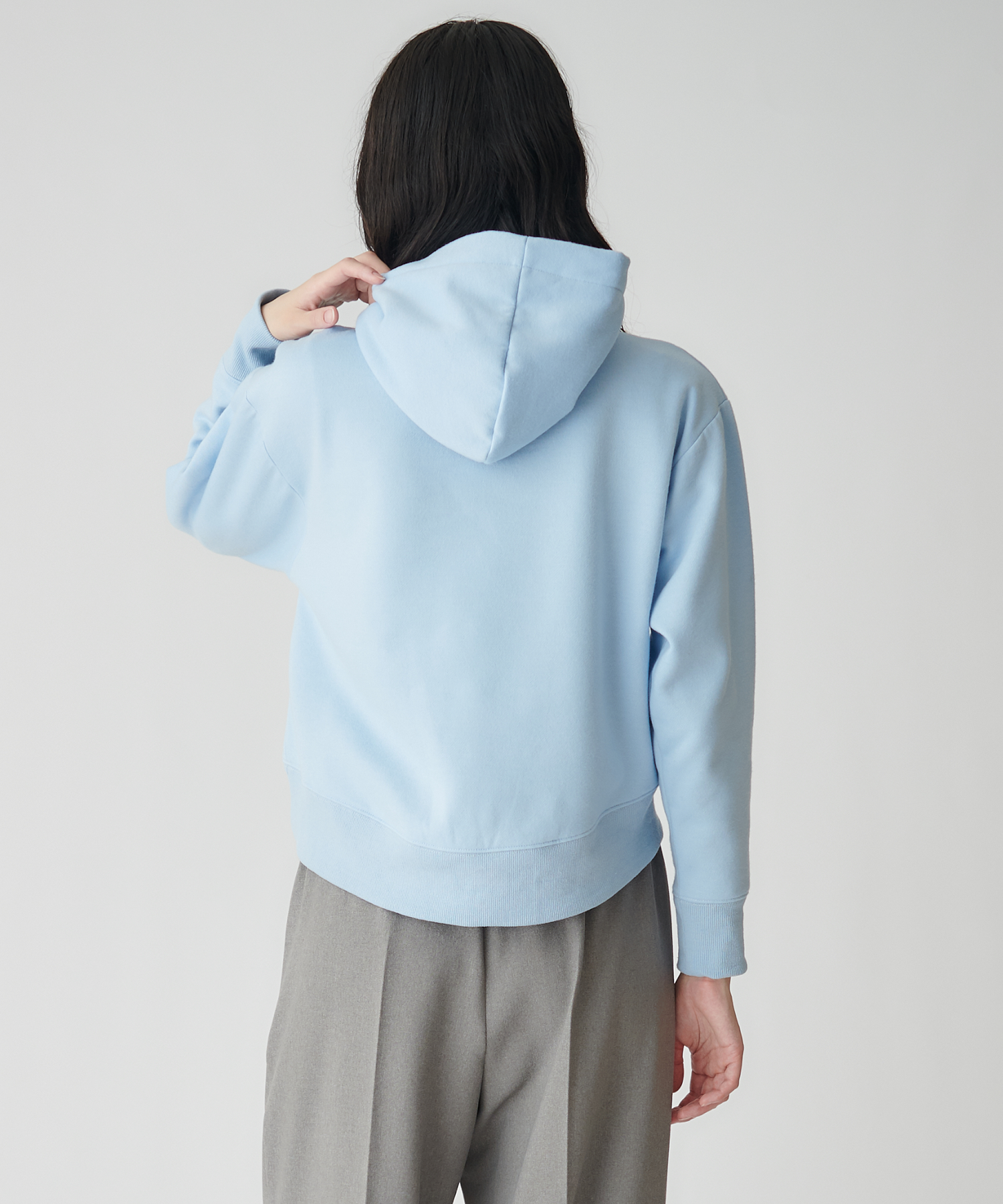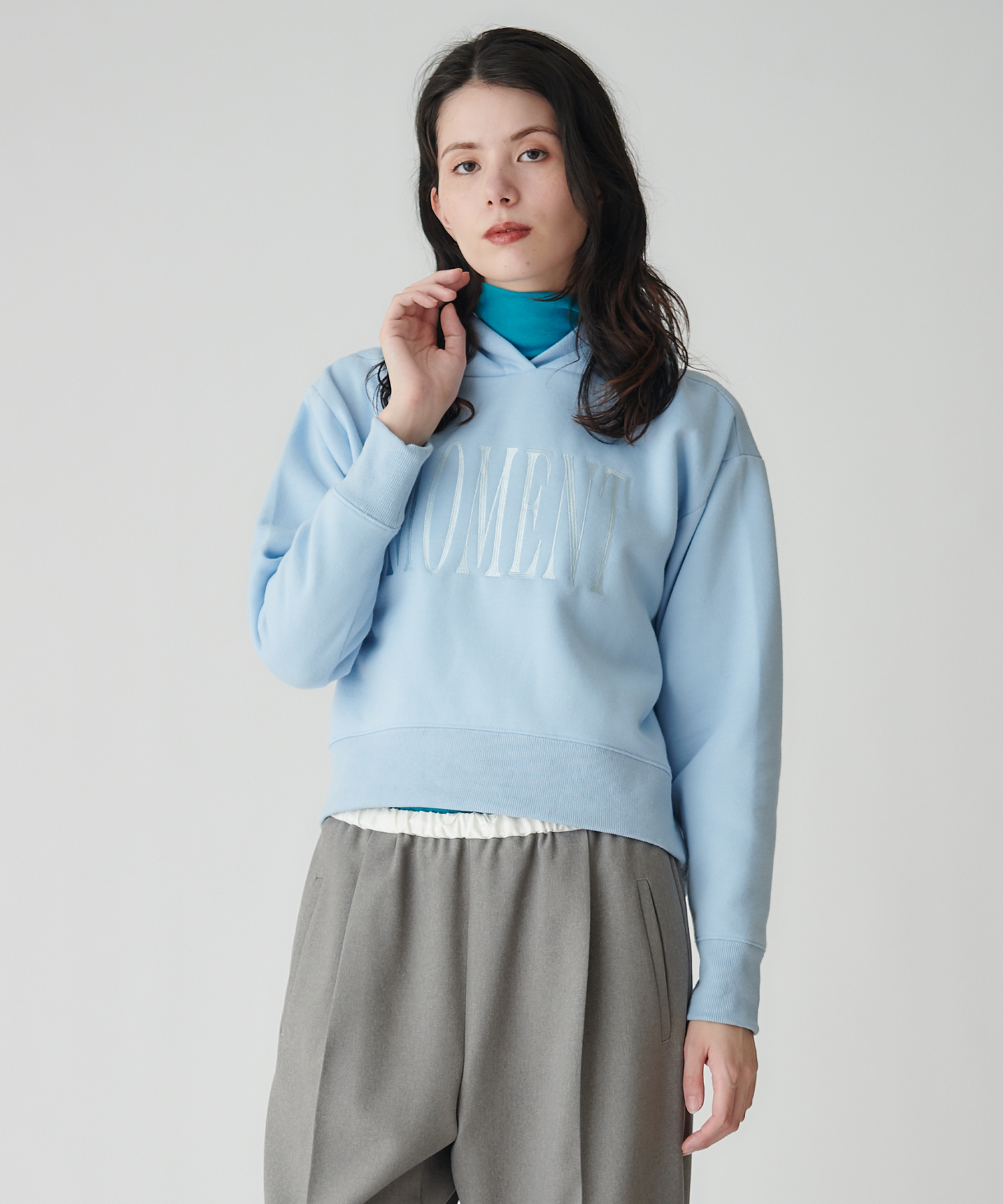 裾や袖口に同色リブをあしらうことで全体を引き締め、胸元の大きめ刺繍ロゴが程よい存在感を放ちます。カジュアルながらも上品な仕上がりで、デイリーに活躍する一枚です。