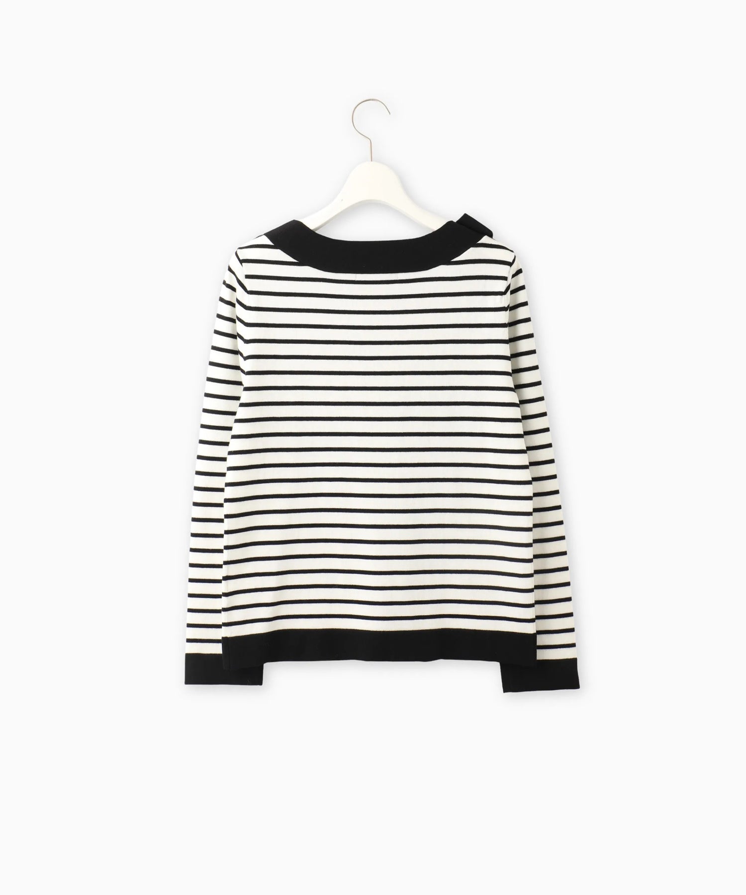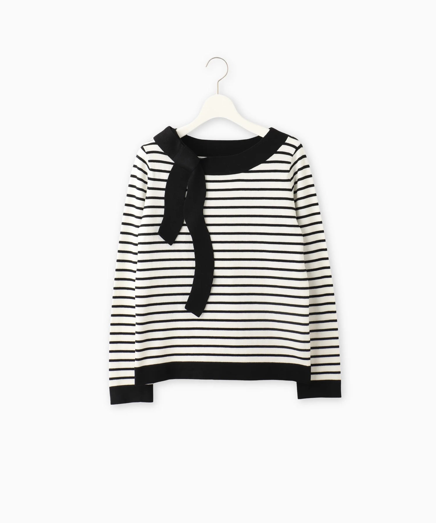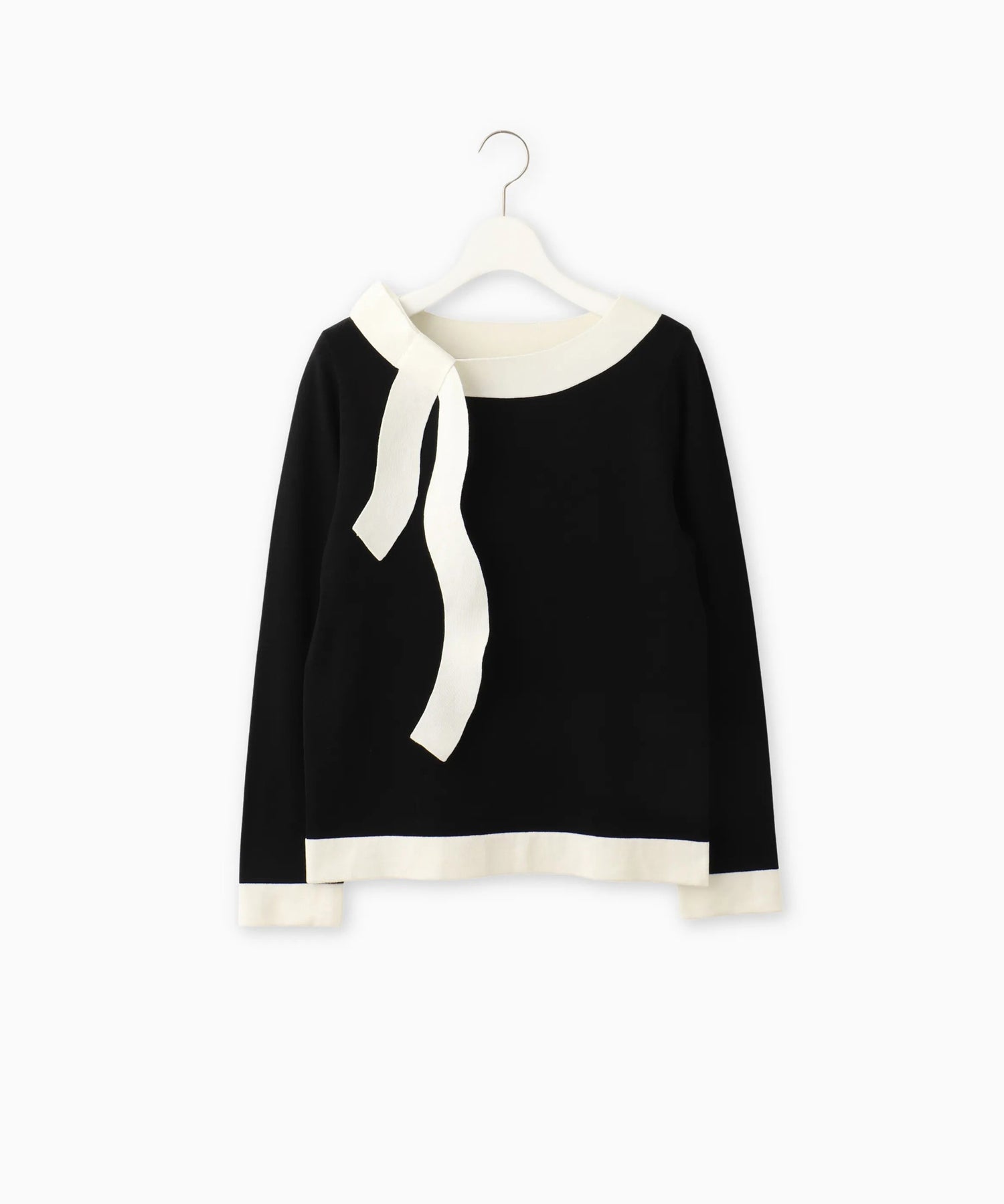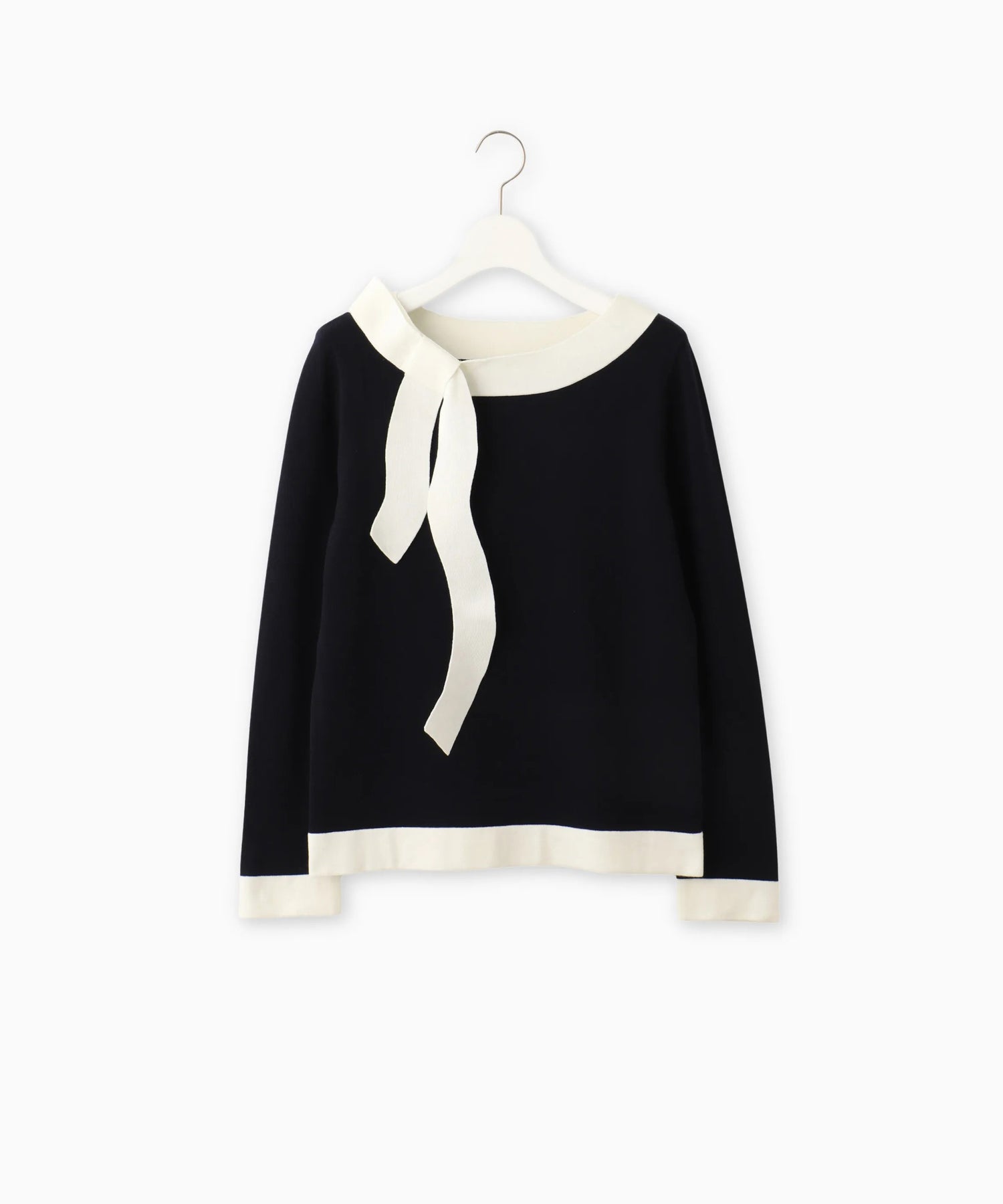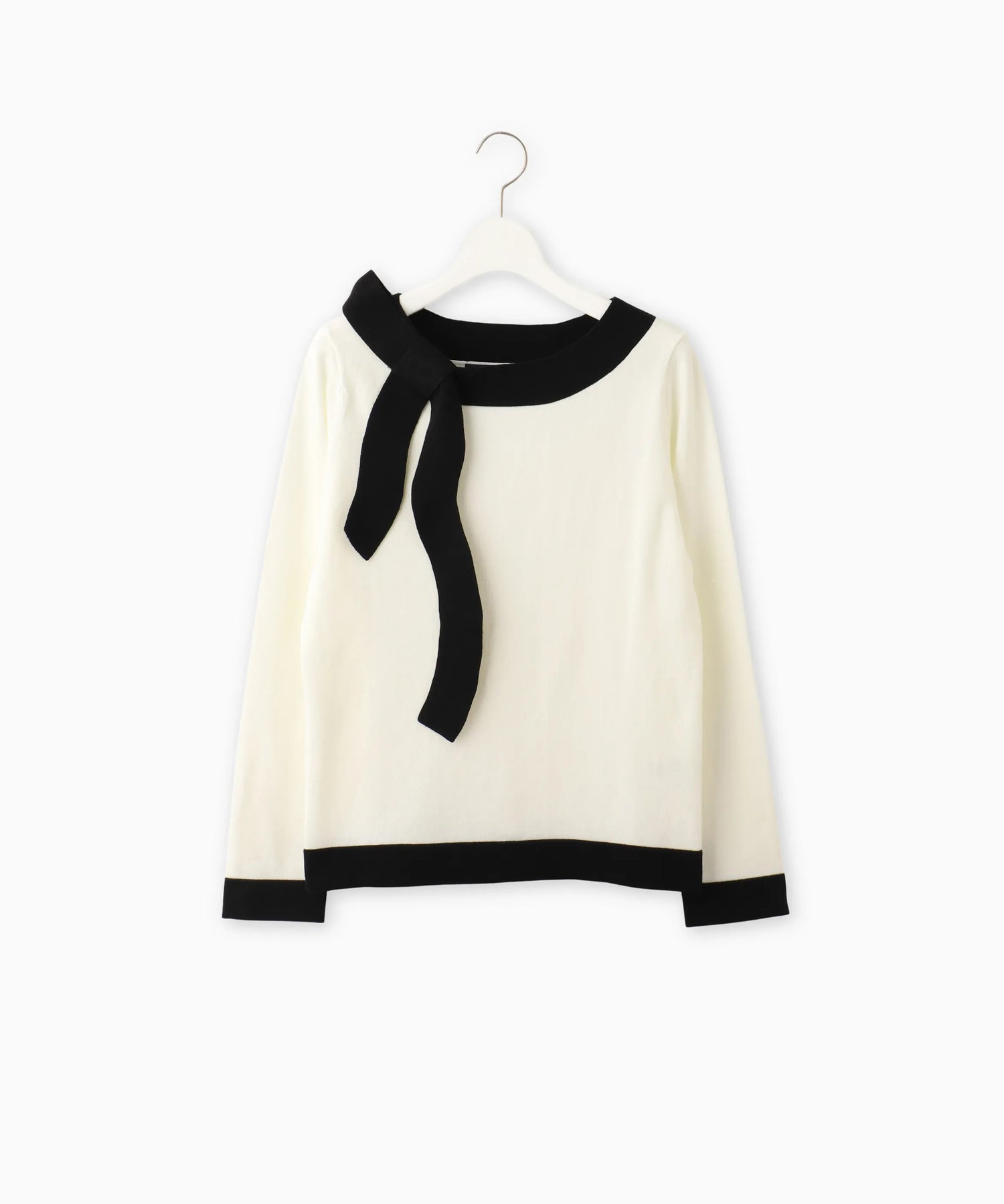 女性らしいボートネックラインに、共糸で仕立てた配色リボンを添えることでシンプルな中に華やかさをプラスしました。デイリーからオフィスシーンまで幅広く活躍する、大人可愛い一枚です。