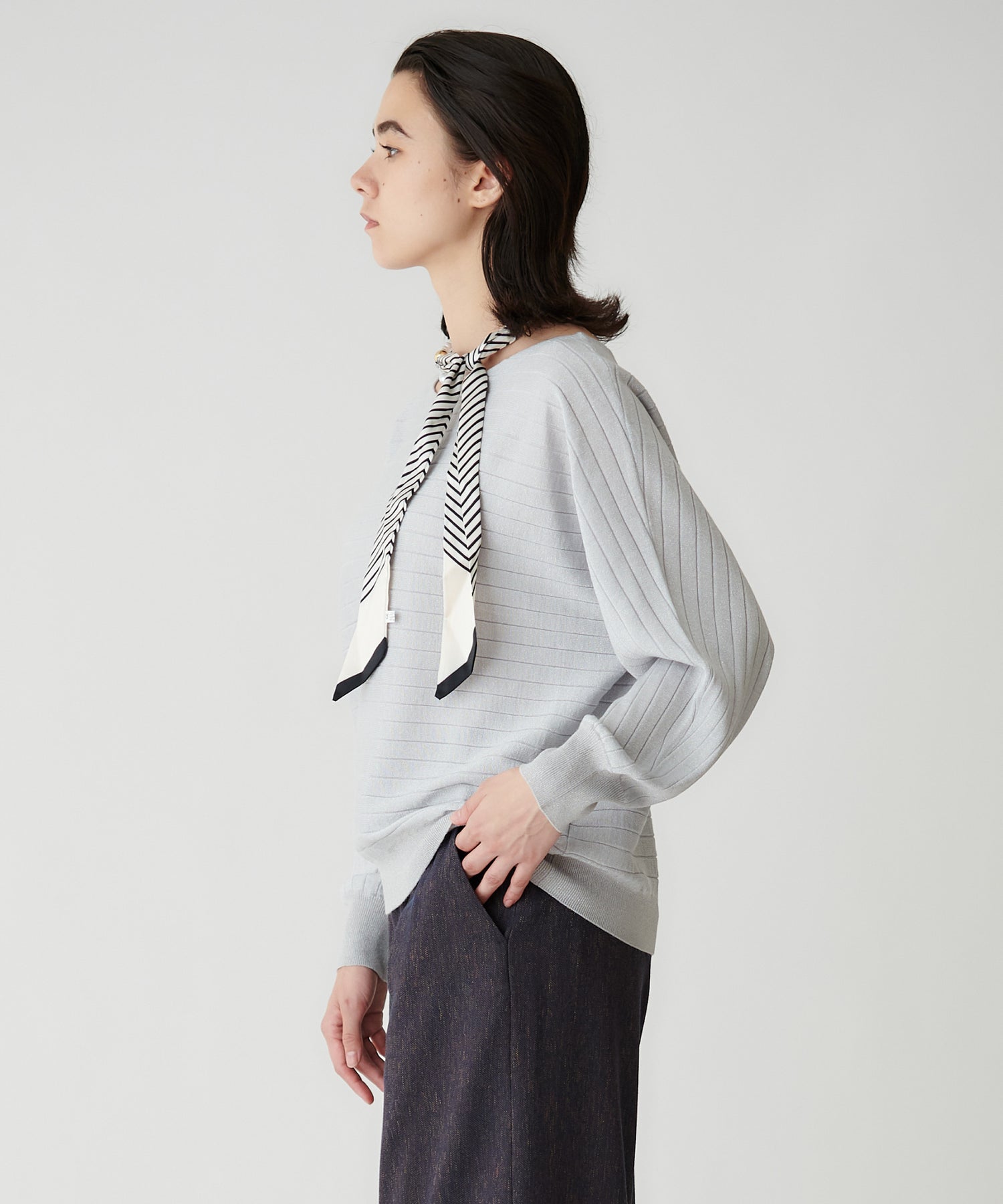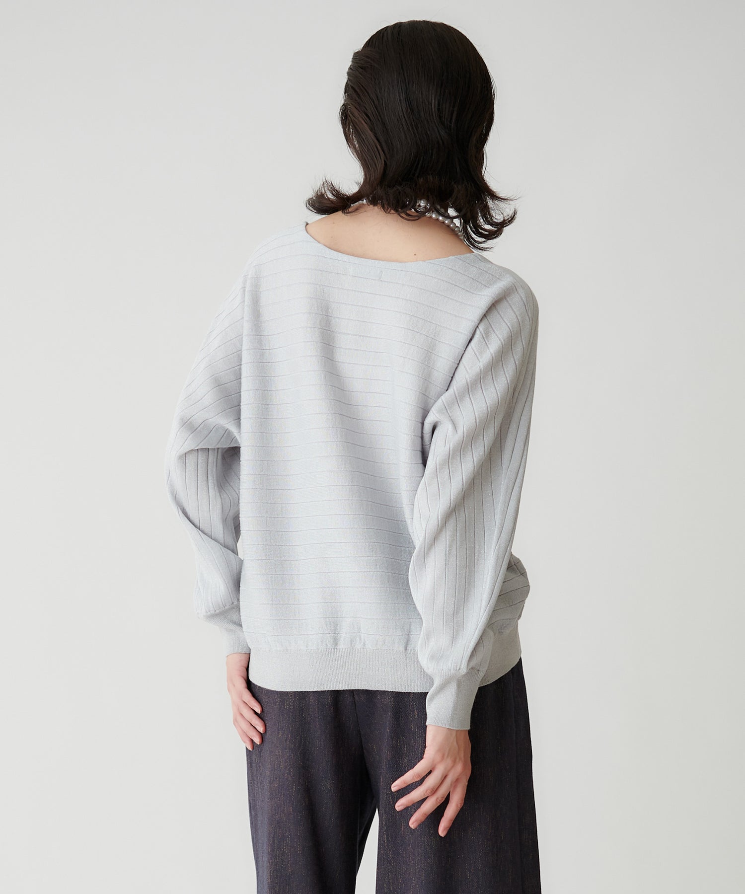 ドルマン袖と横リブのモダンな表情を活かし、シンプルなボトムスと合わせるのがおすすめ。