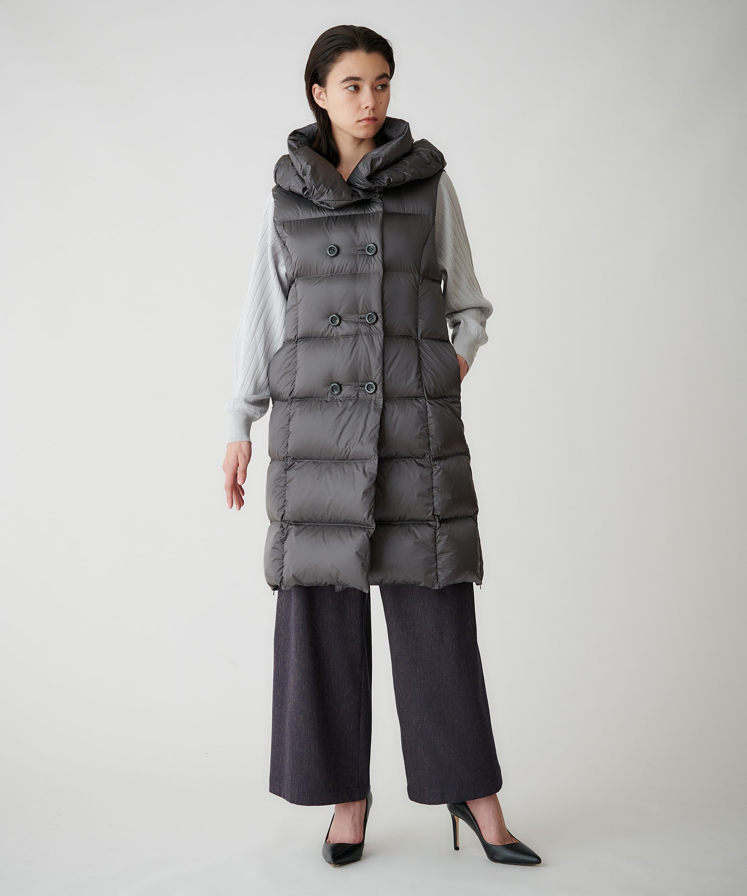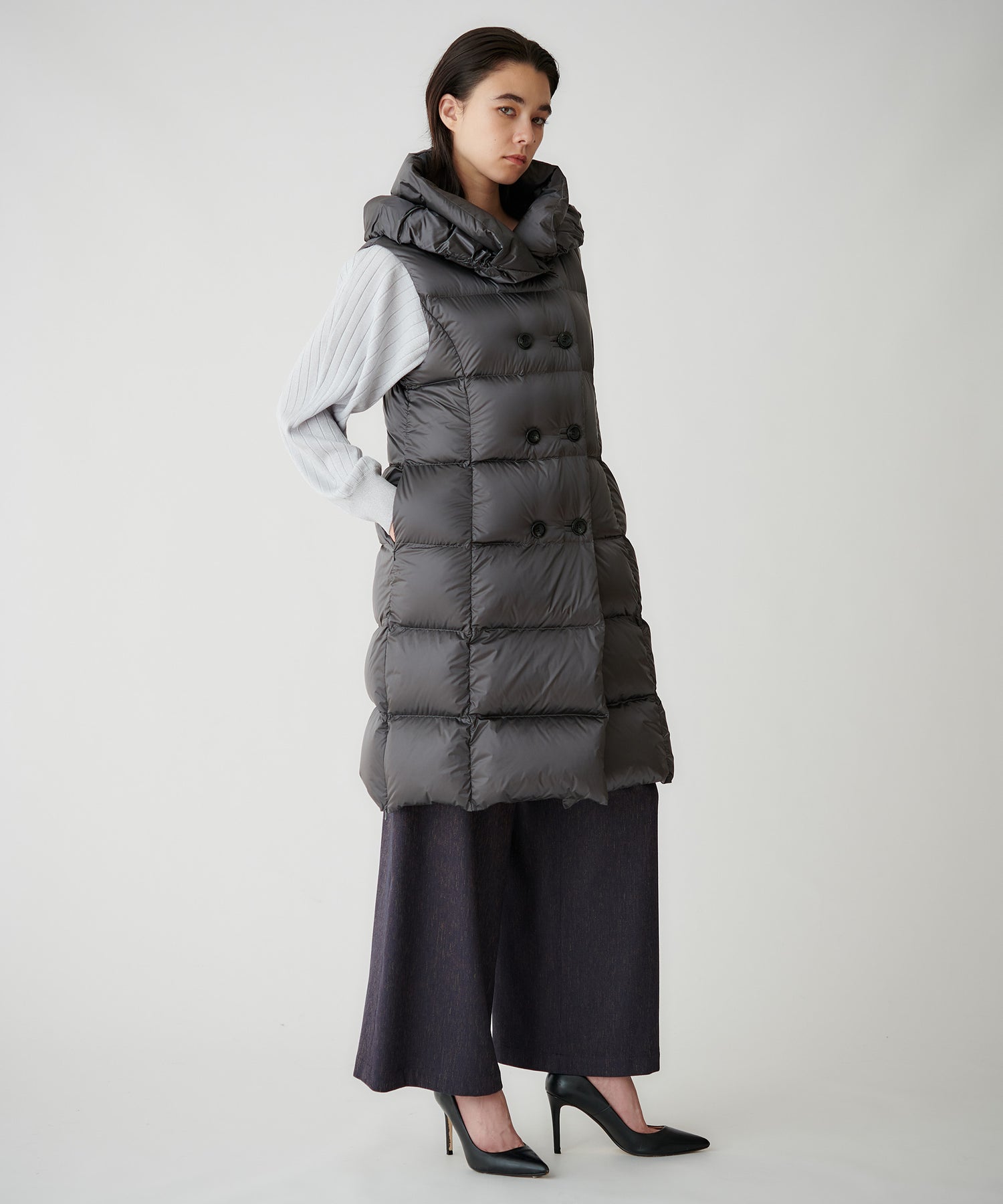 長すぎない着丈で、ワイドパンツやスカートにも合わせやすい一枚。