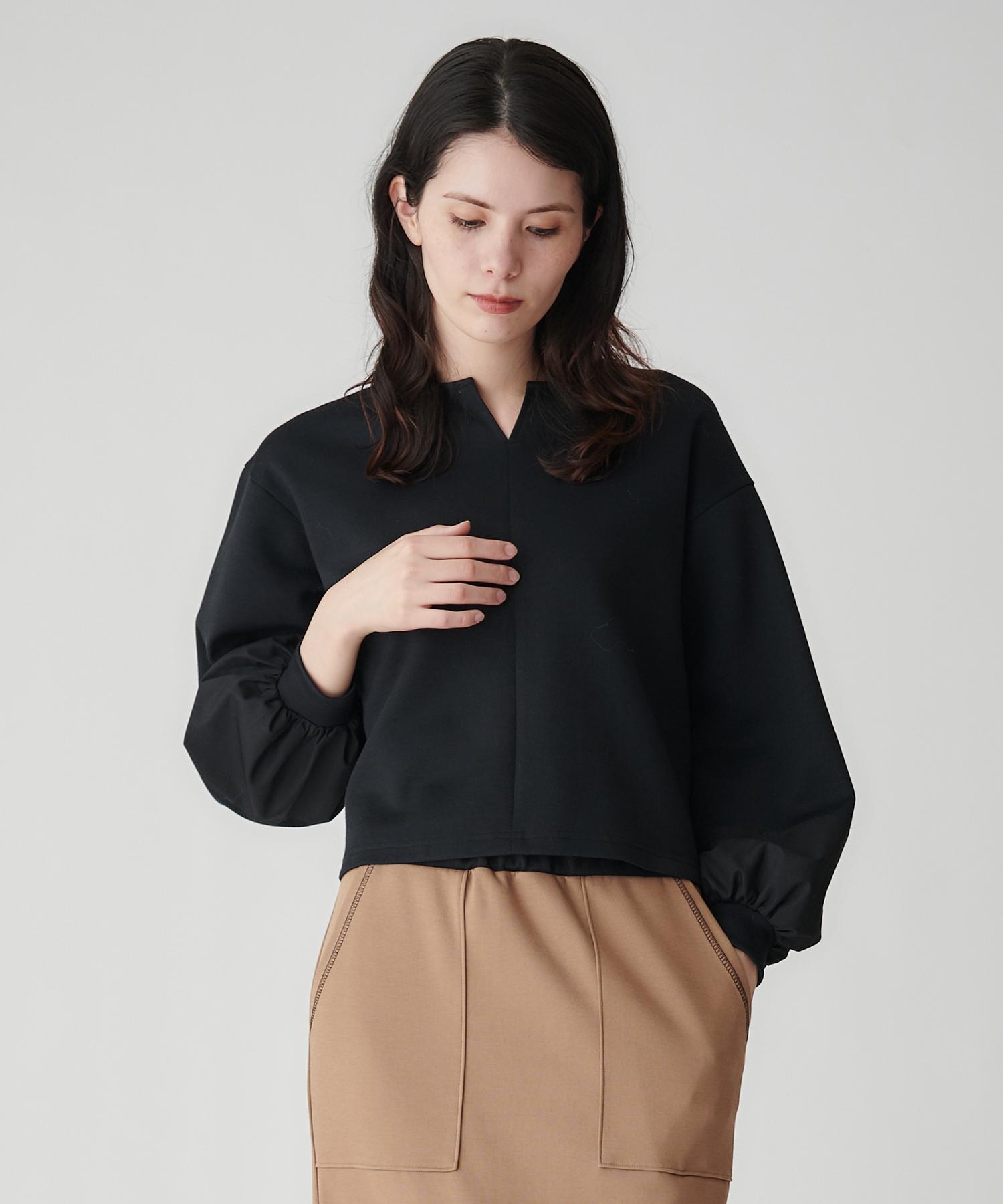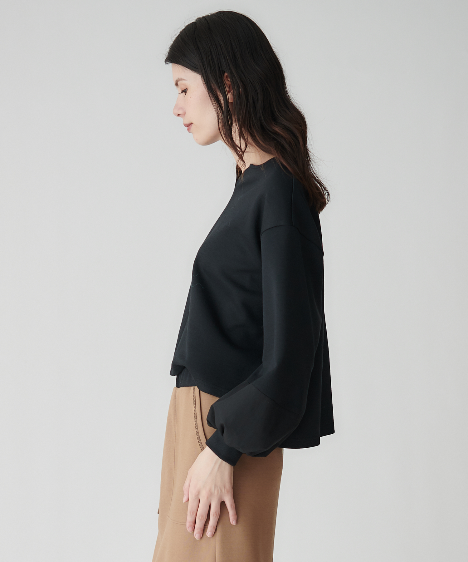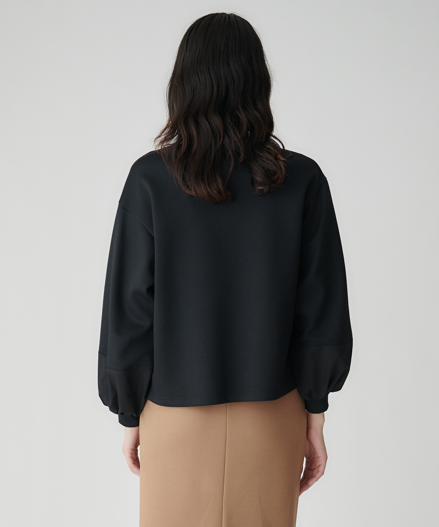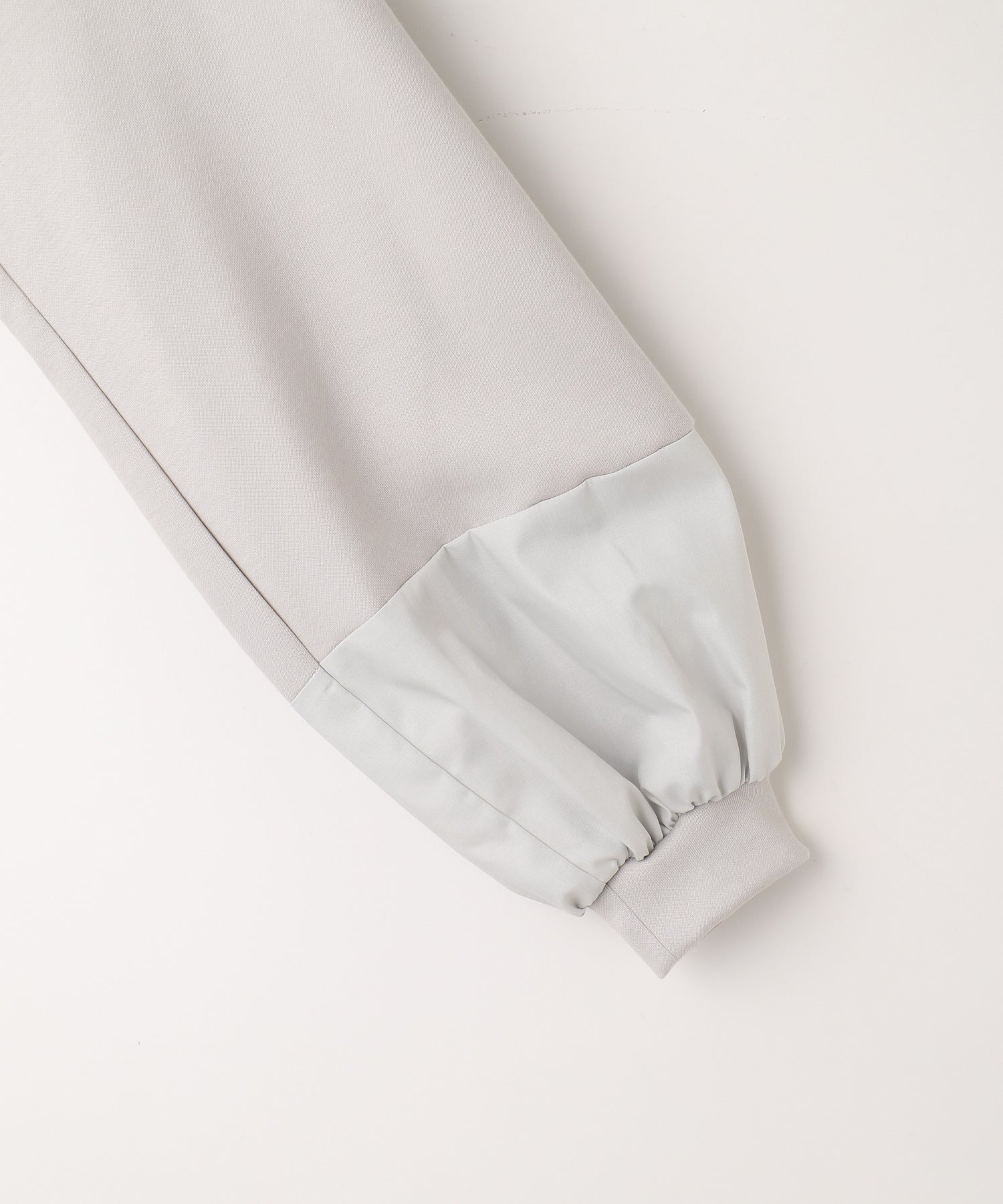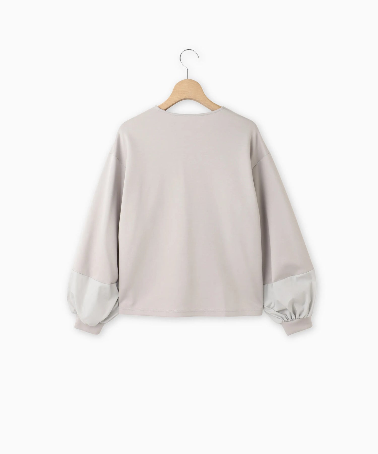 袖口には別布を使用し、さりげないアクセントをプラス。同素材のボトムと合わせてセットアップでも楽しめる、汎用性の高い一枚です。
