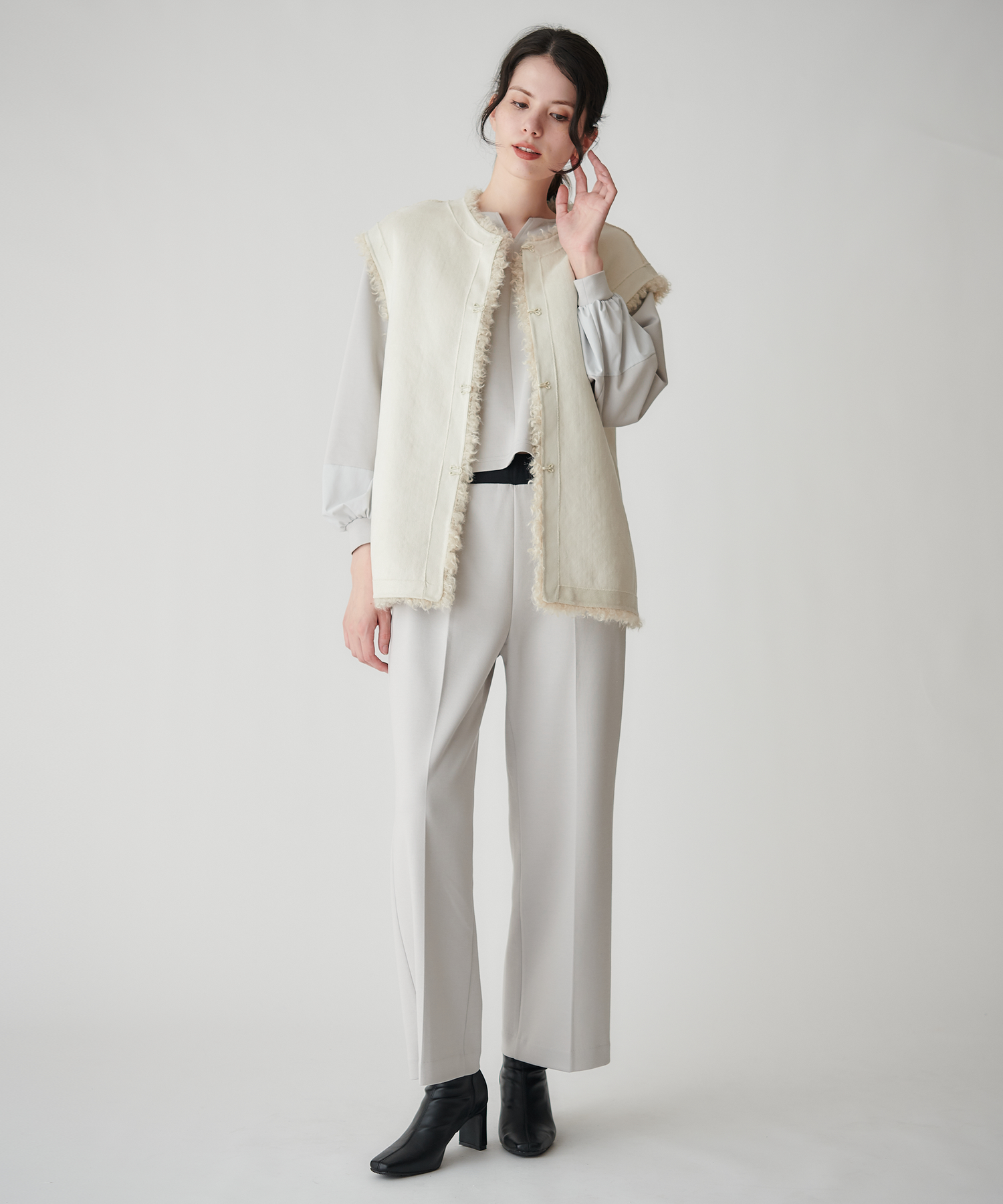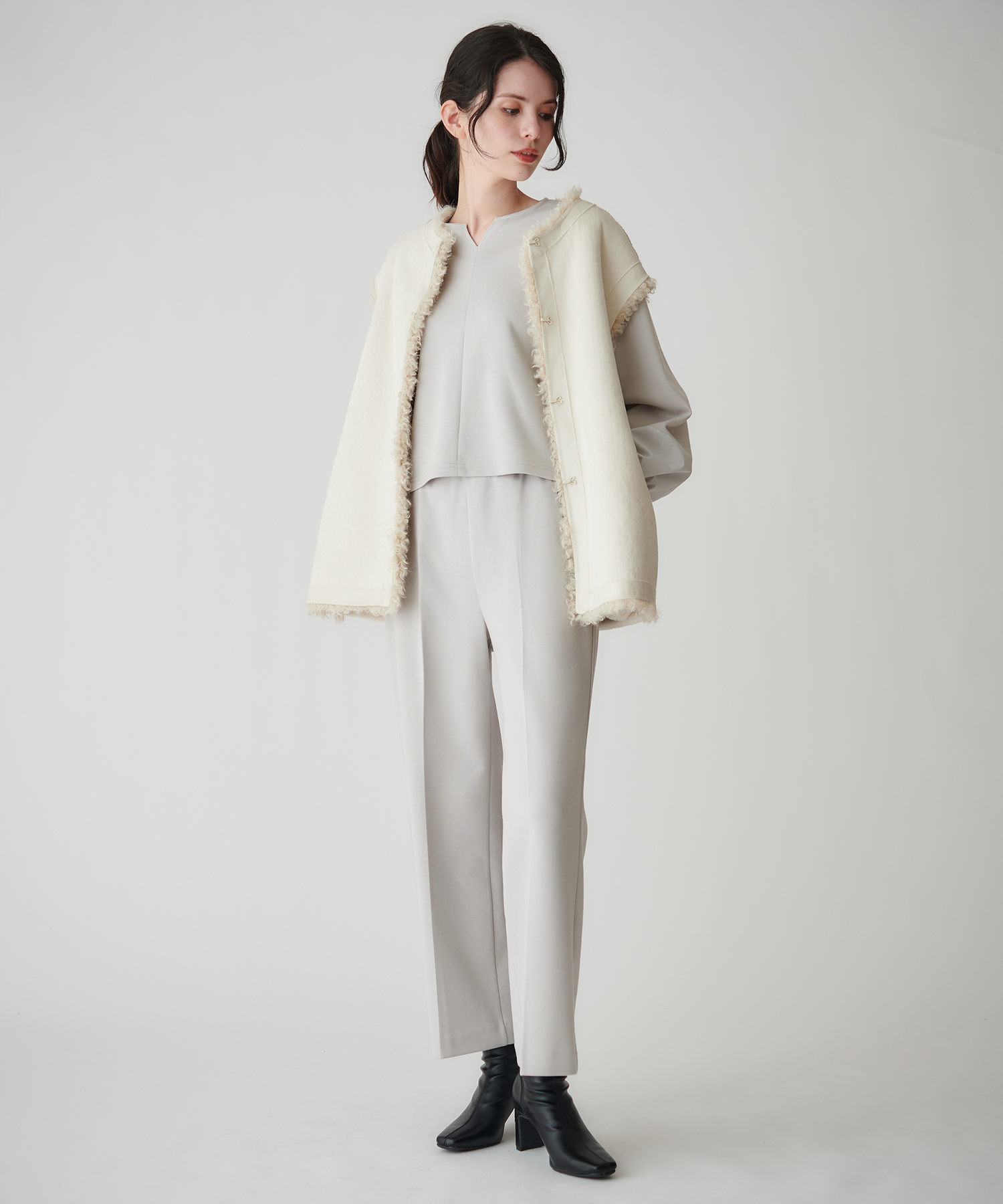 同素材のボトムと合わせれば、統一感のあるスタイリッシュなセットアップコーデに。