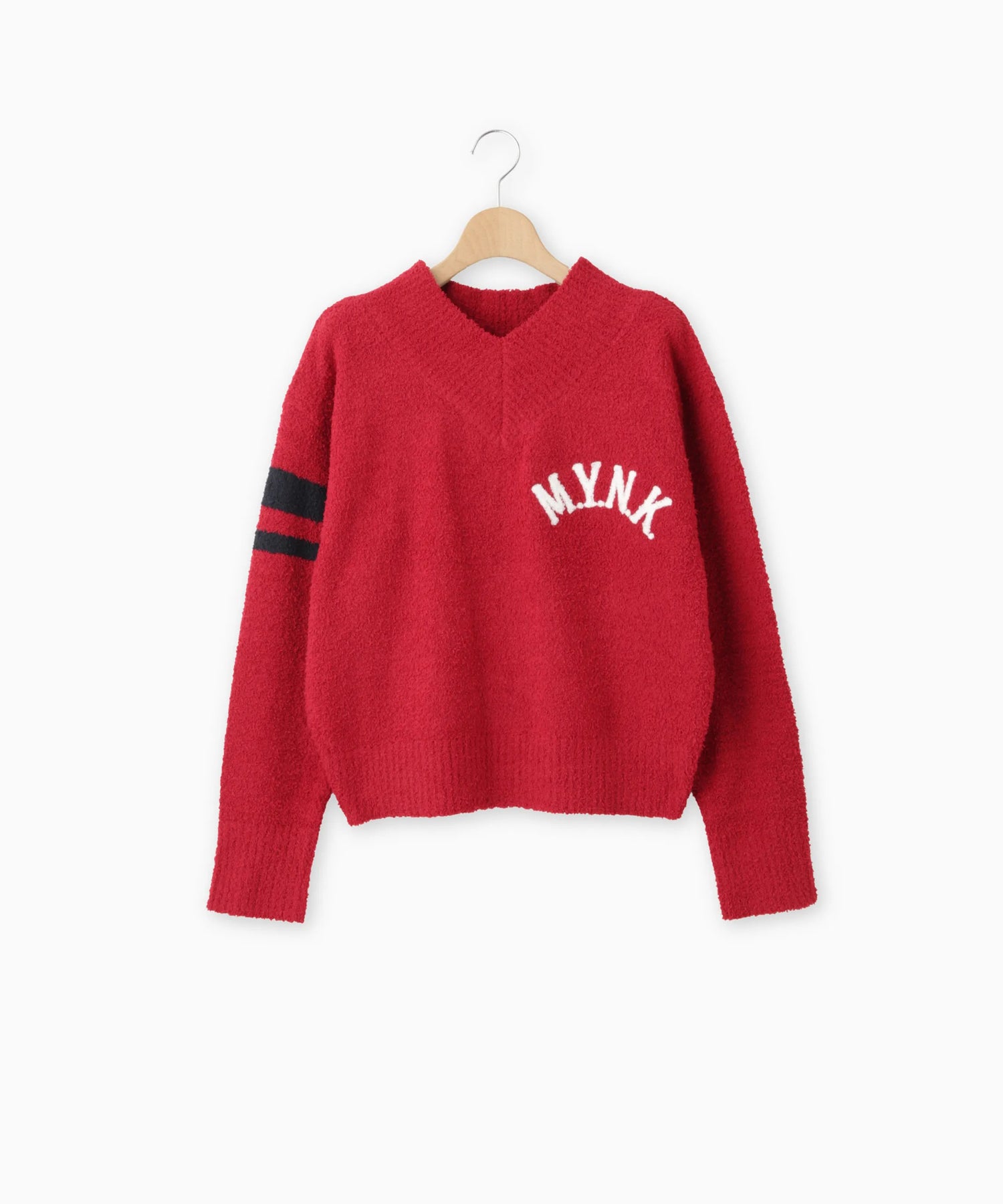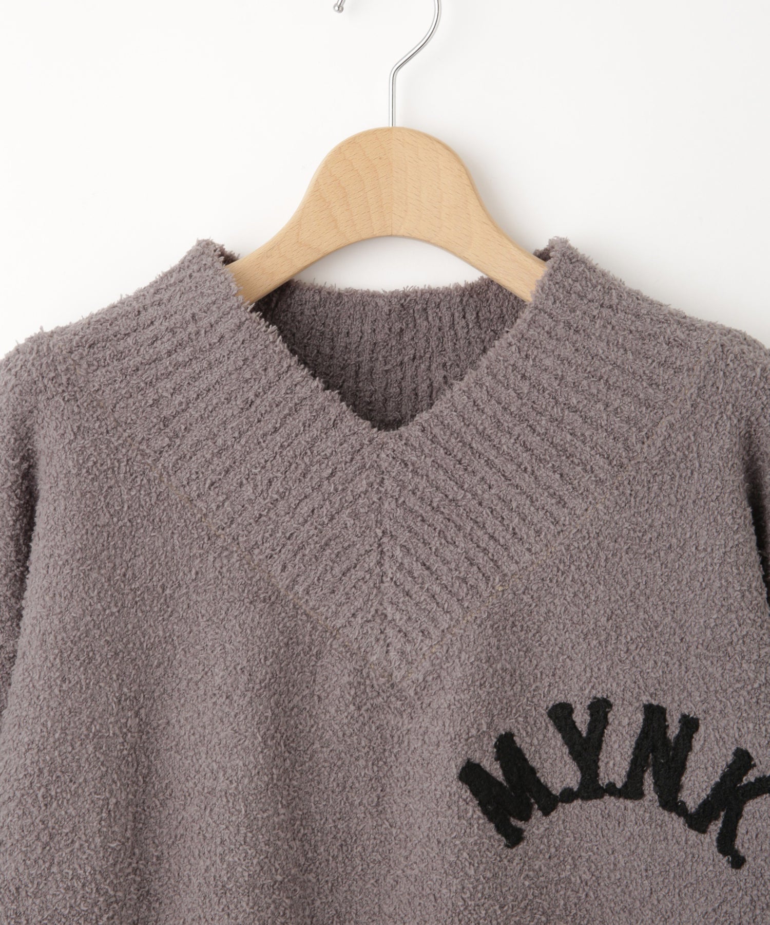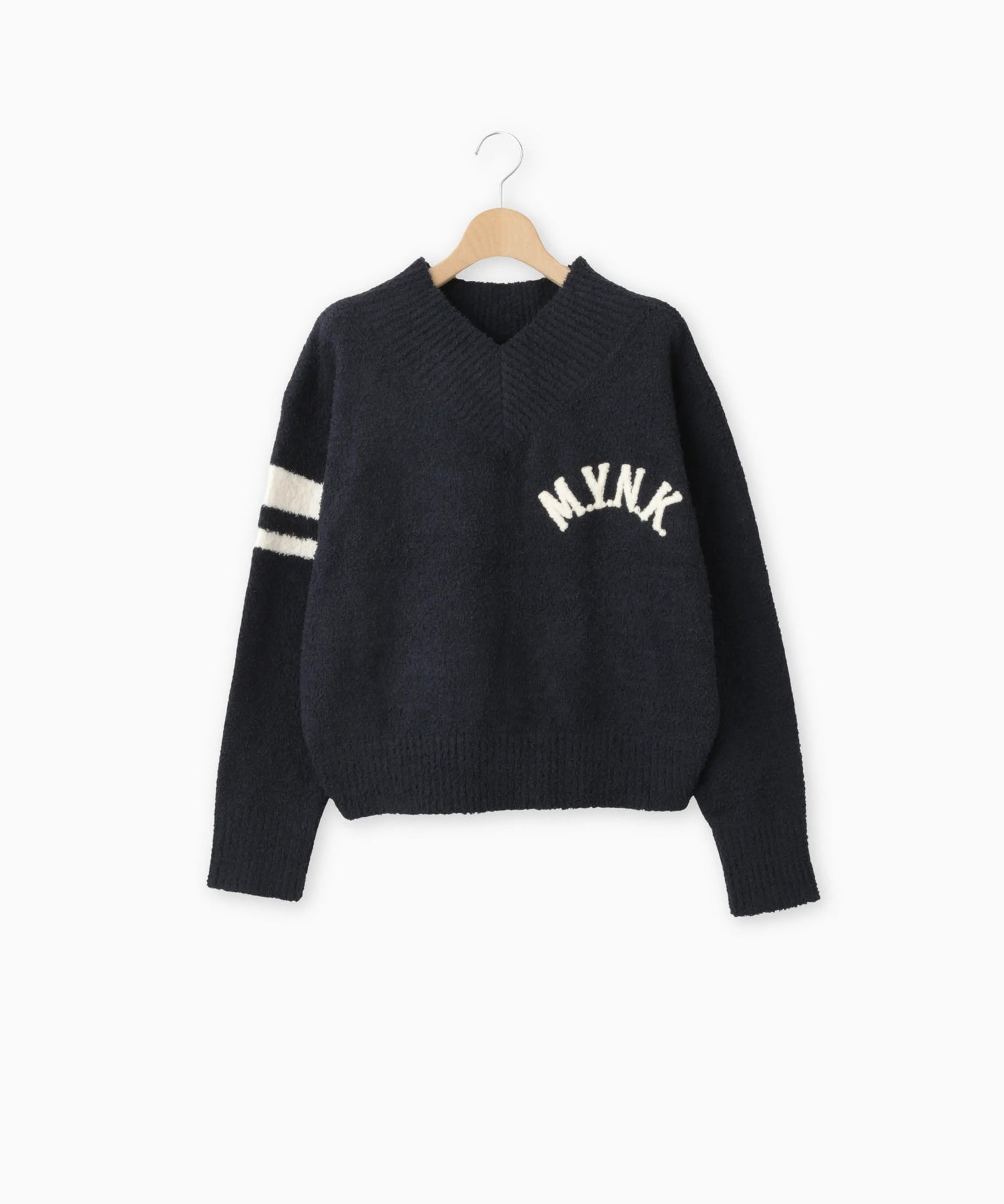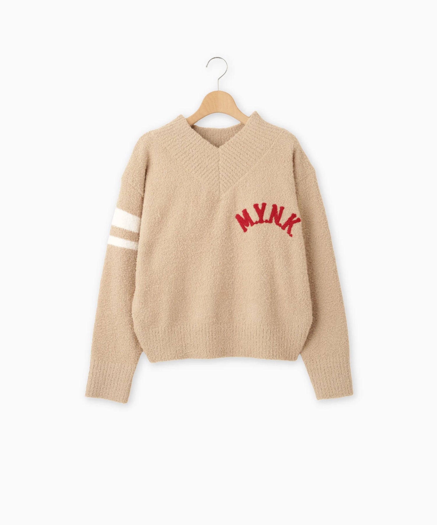 首元が詰まったVネックデザインで、抜け感がありながらも上品な印象を演出します。胸元には「M」「Y」「N」「K」のロゴをさりげなく配置し、右袖のみに入れたラインディテールでスポーティなアクセントをプラスした、今季おすすめの一枚です。