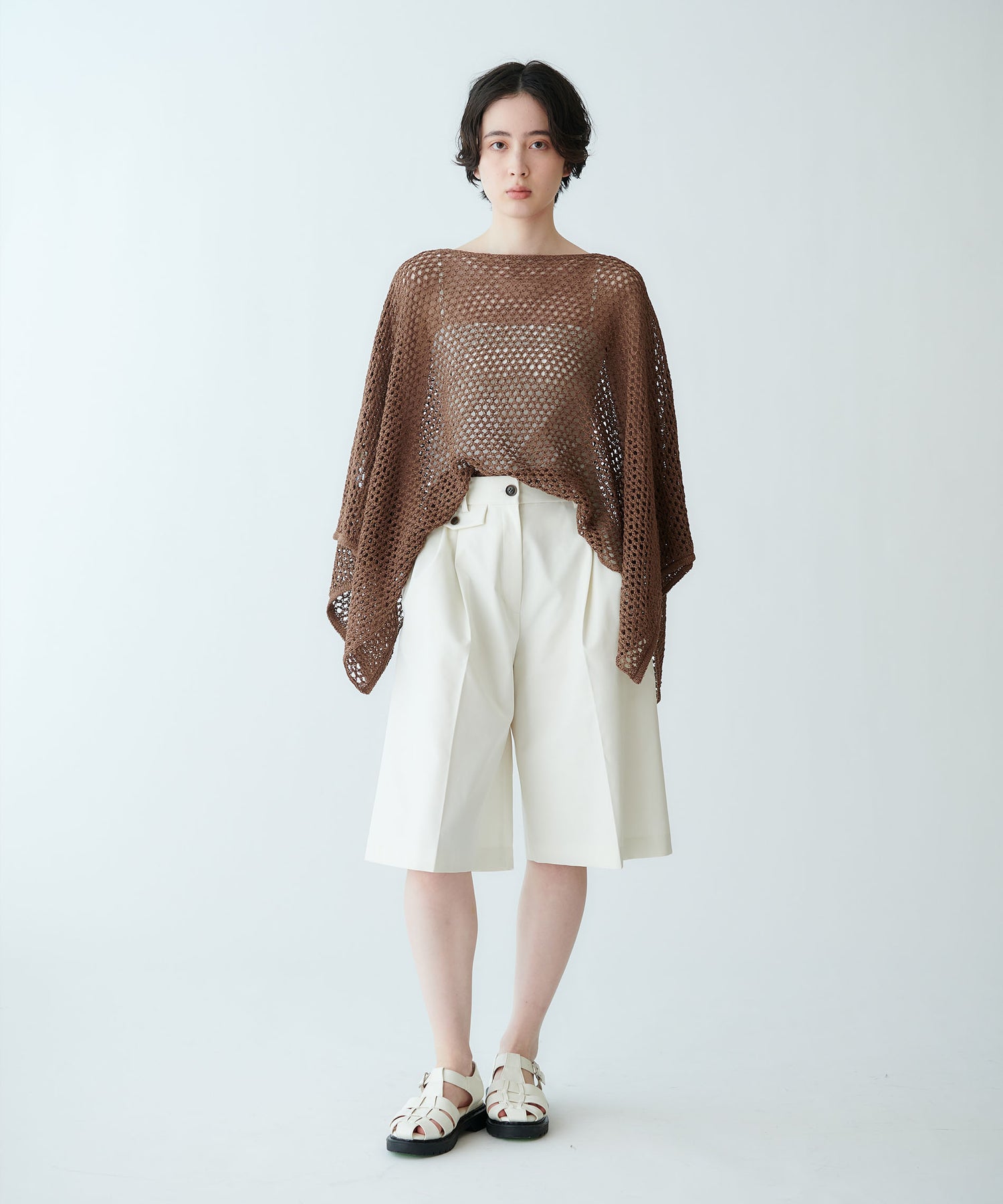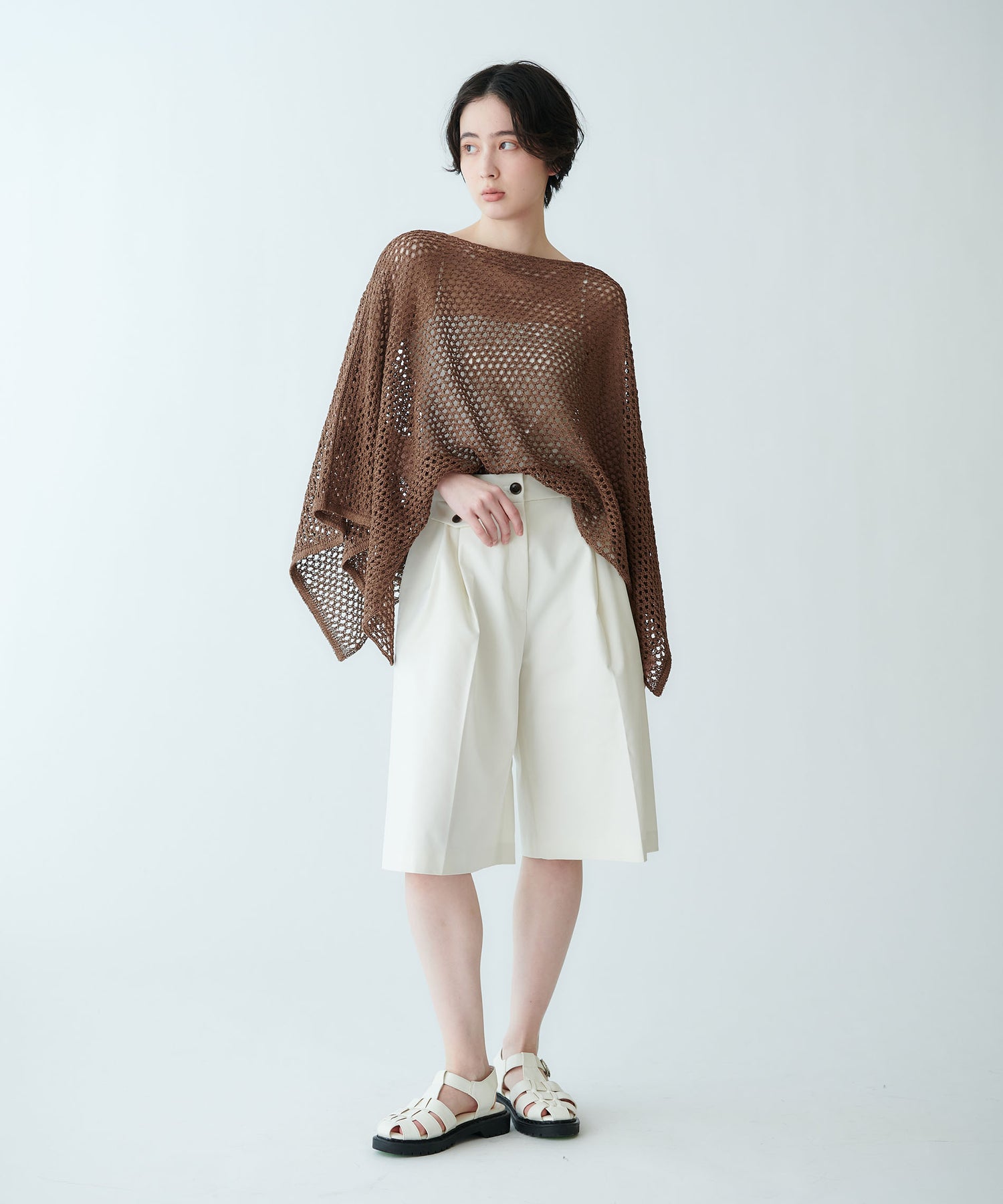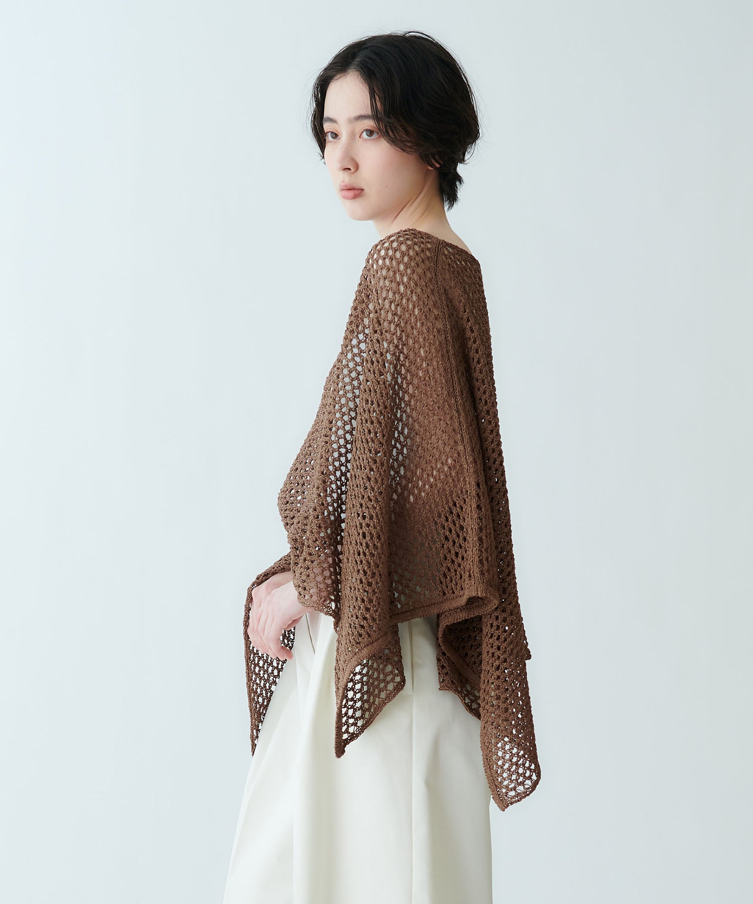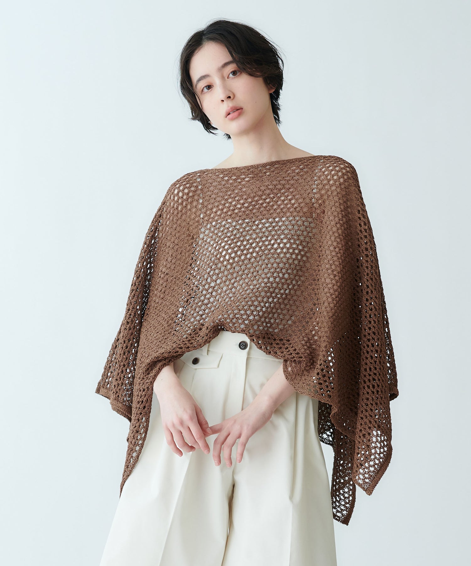 着用位置によって衿ぐりの形や着丈のバランスを調整できる、夏らしいメッシュ編みの2WAYポンチョ型トップスです。