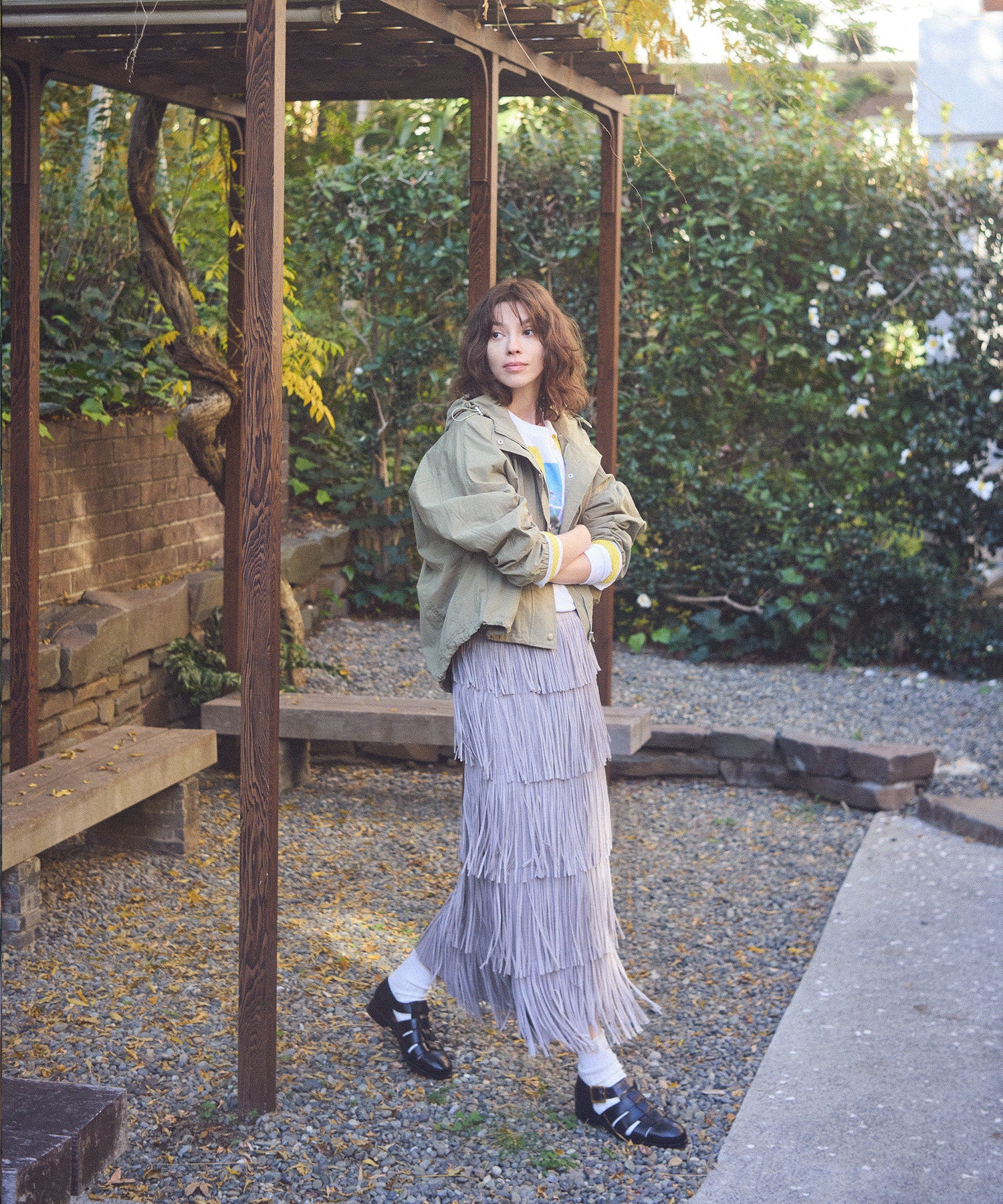 ウエストはゴム仕様で、歩くたびに揺れるフリンジが、軽やかで女性らしい印象を演出します。