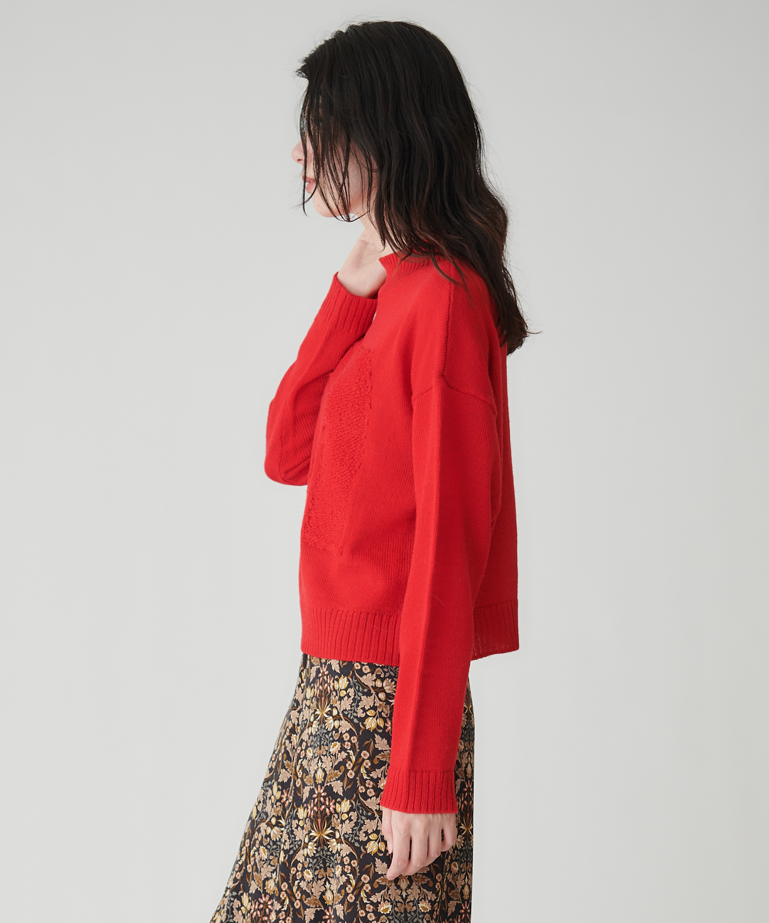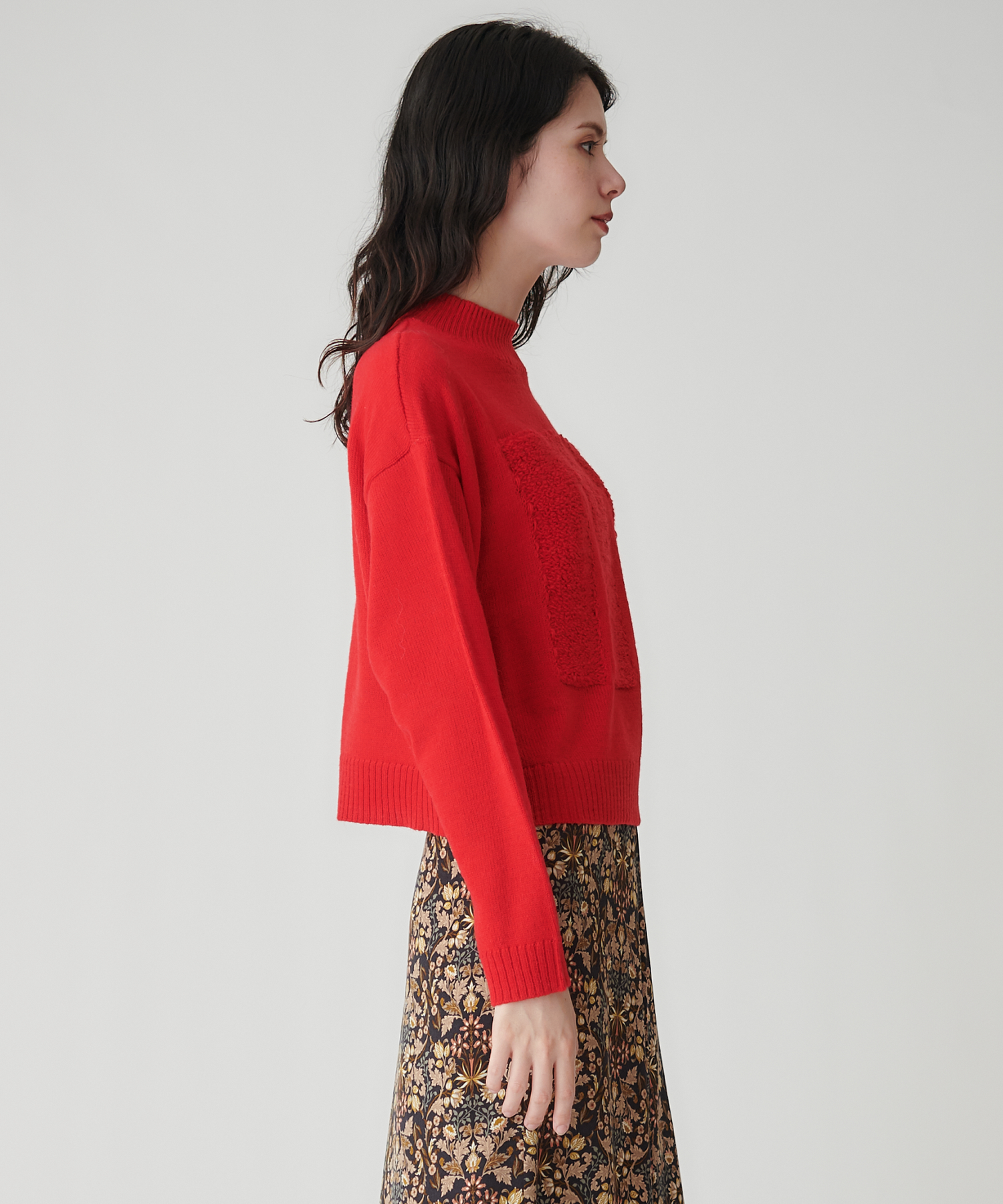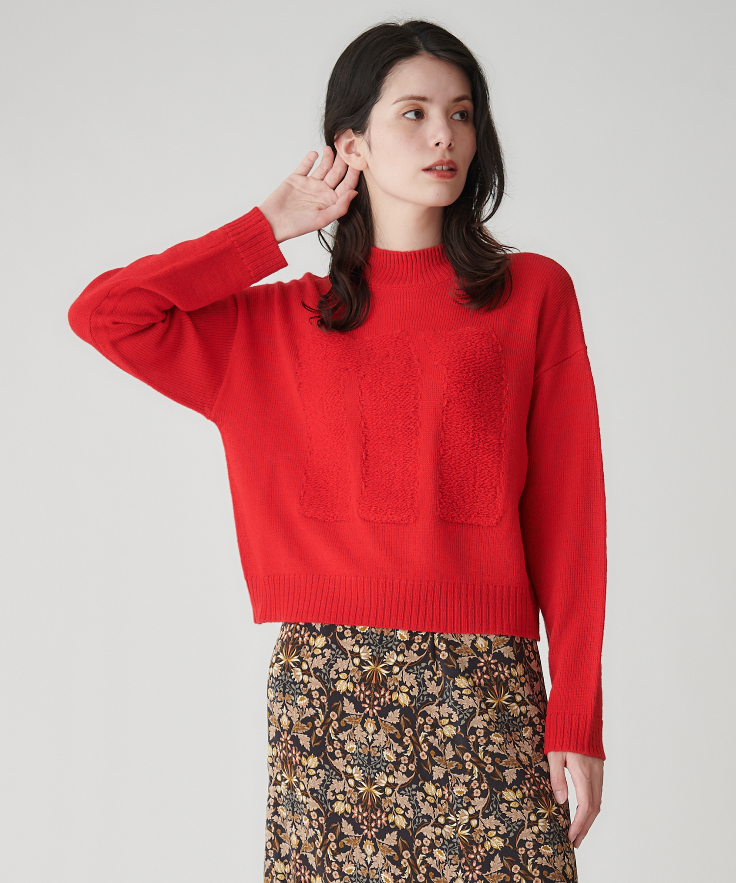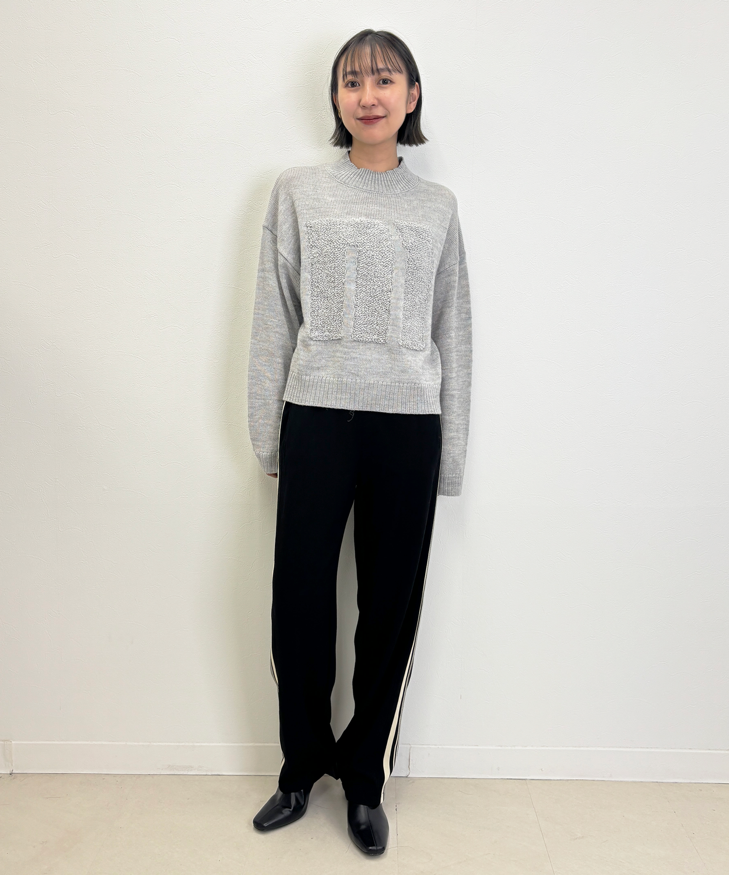 胸元にはパイル状のくるくる編地であしらった「M」のロゴがポイントになり、さりげなくブランド感をプラス。高すぎないハイネックと程よくゆとりのあるシルエットで、リラックス感と上品さを両立した1枚です。